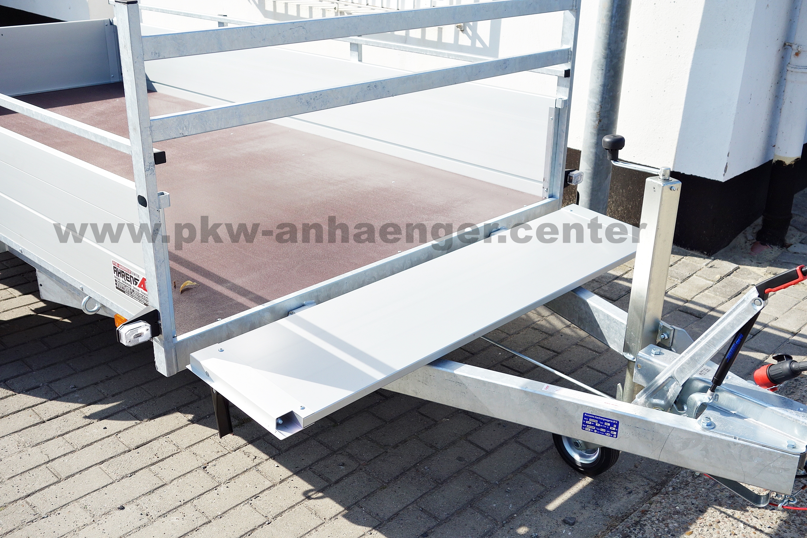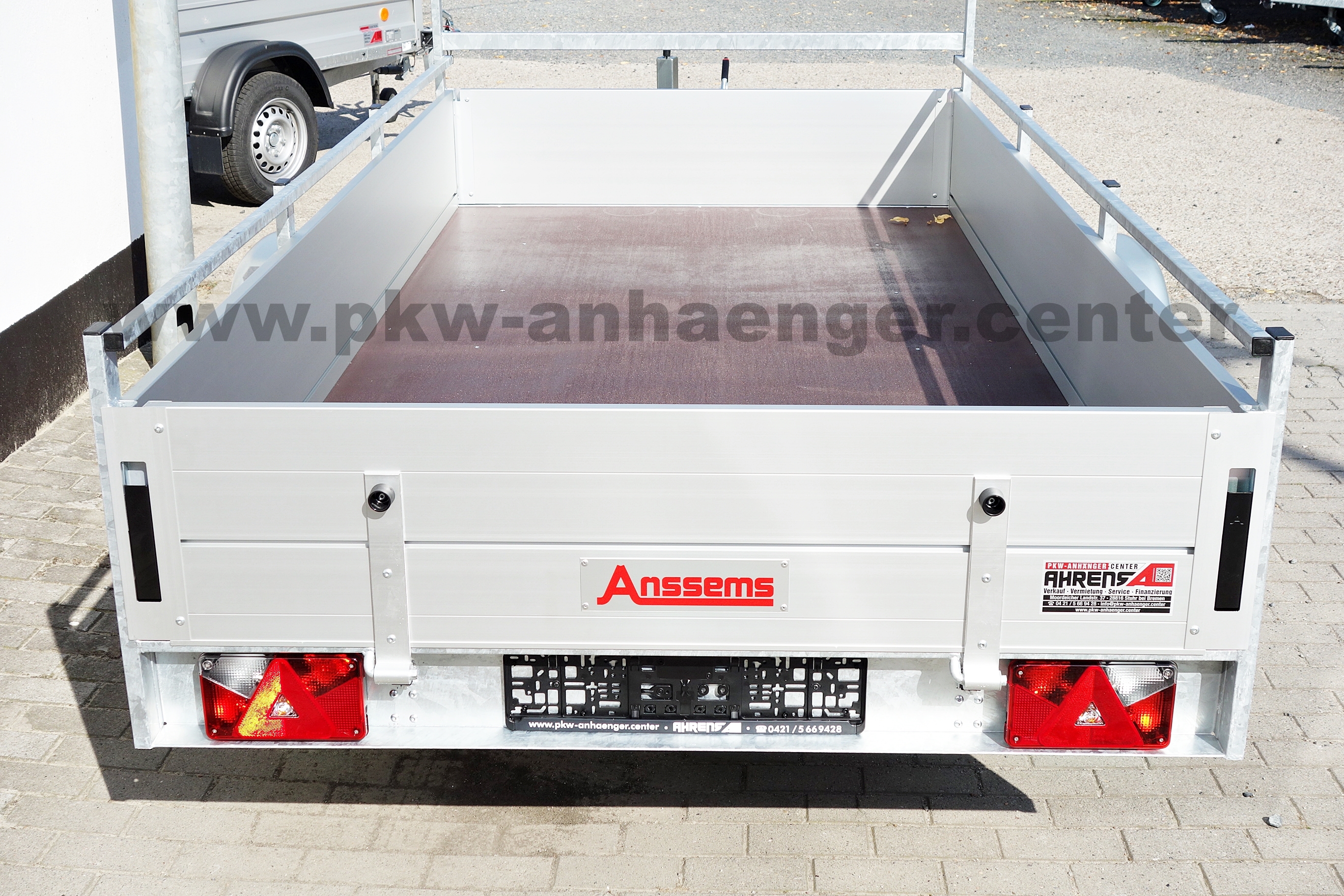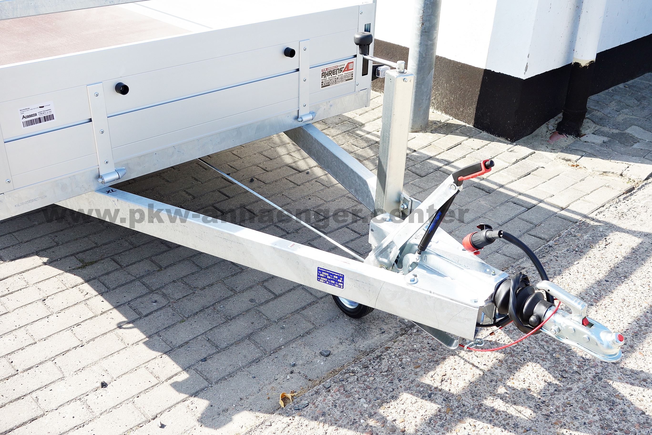 Als Serienausstattung hat der Anssems Kastenanhänger mit Bremse Alubordwände, Plane und Gestell, innenliegende Verschlüsse, Zurrösen aussen, Profilkanäle zum Anbau für Zubehör oder Ladungssicherung, sehr stabiler geschweißter Stahlrahmen, Reling seitlich, Hochgestell vorne, Klappe vorne, rausziehbare Auflagen für Heckklappe, Stützrad und eine V-Deichsel.