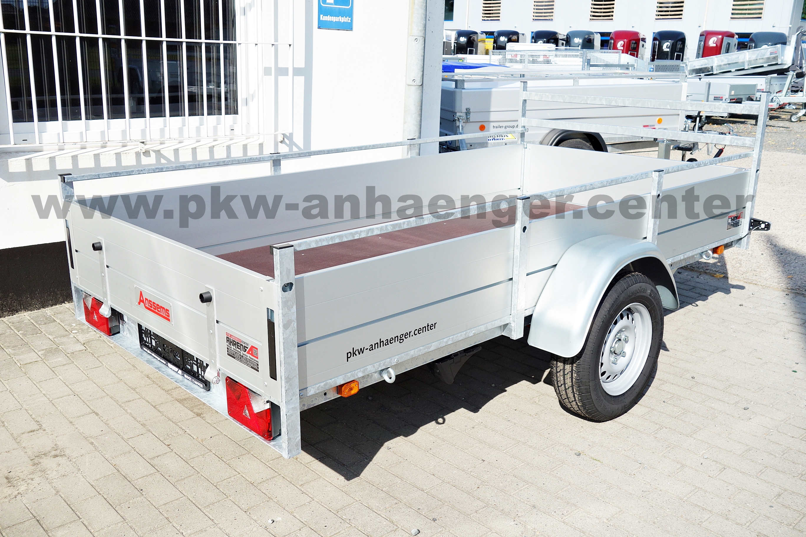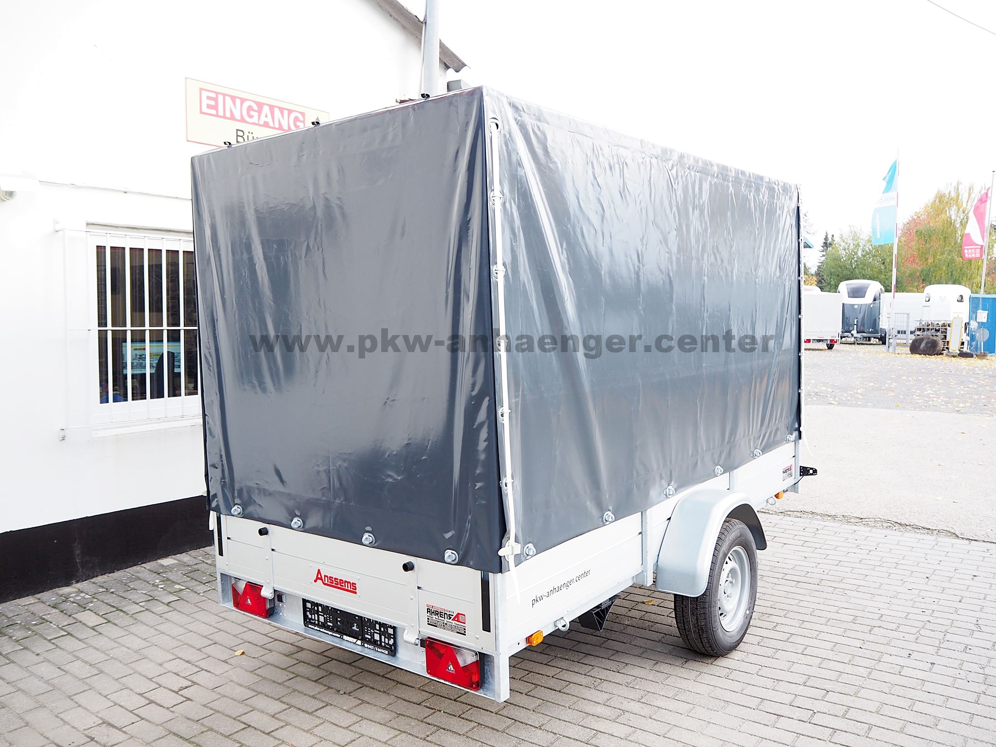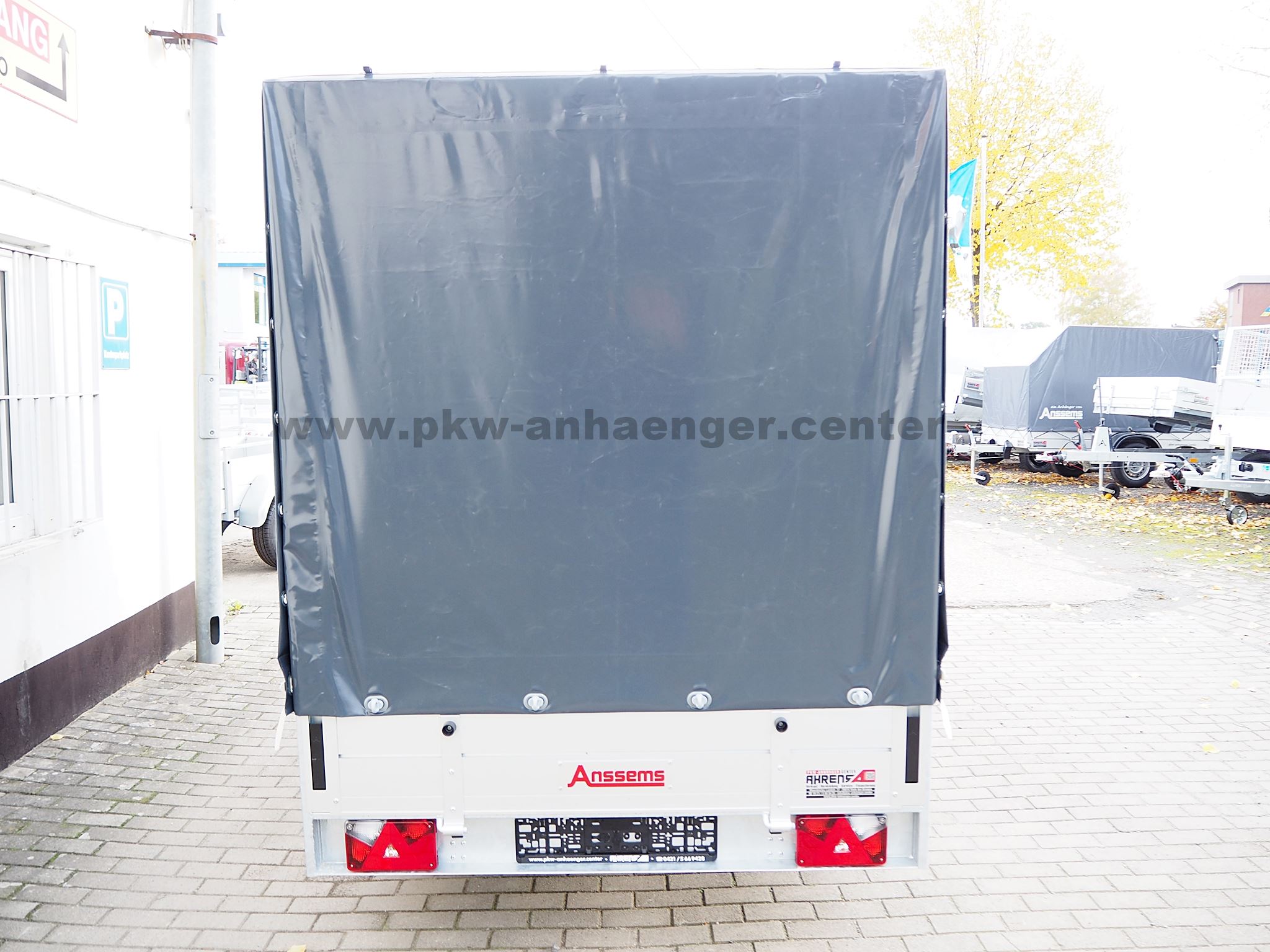 Als Serienausstattung hat der Anssems Kastenanhänger mit Bremse Alubordwände, Plane und Gestell, innenliegende Verschlüsse, Zurrösen aussen, Profilkanäle zum Anbau für Zubehör oder Ladungssicherung, sehr stabiler geschweißter Stahlrahmen, Reling seitlich, Hochgestell vorne, Klappe vorne, rausziehbare Auflagen für Heckklappe, Stützrad und eine V-Deichsel.