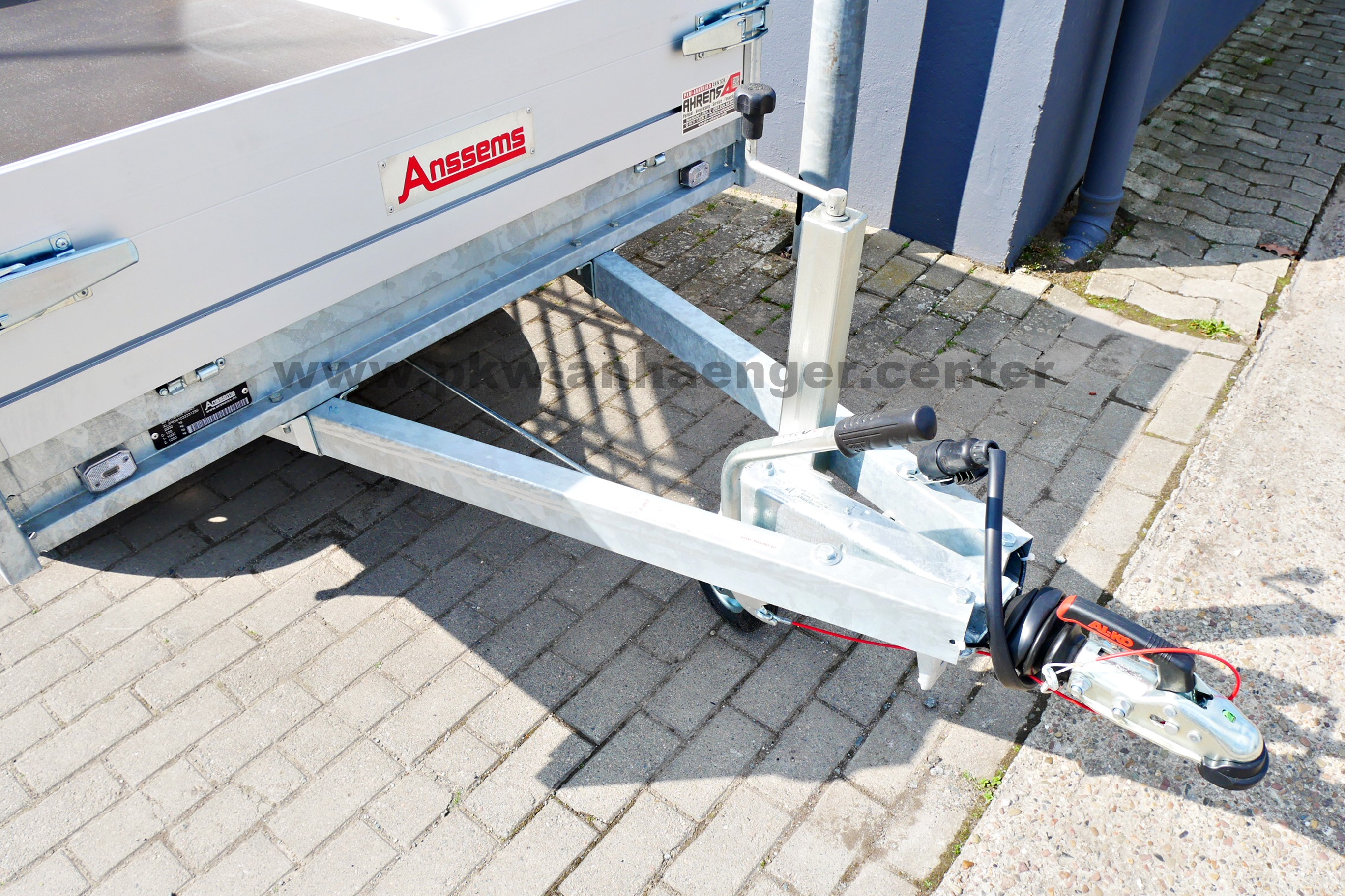 zweiachsige Pritschenhochlader von Anssems Alubordwände alle klapp- und abnehmbar, Plane mit Gestell, stabile Exzenterverschlüsse, Zurrösen innen, Profilkanäle zum Anbau für Zubehör oder Ladungssicherung, Stahlrahmen, Stützrad und eine V-Deichsel.