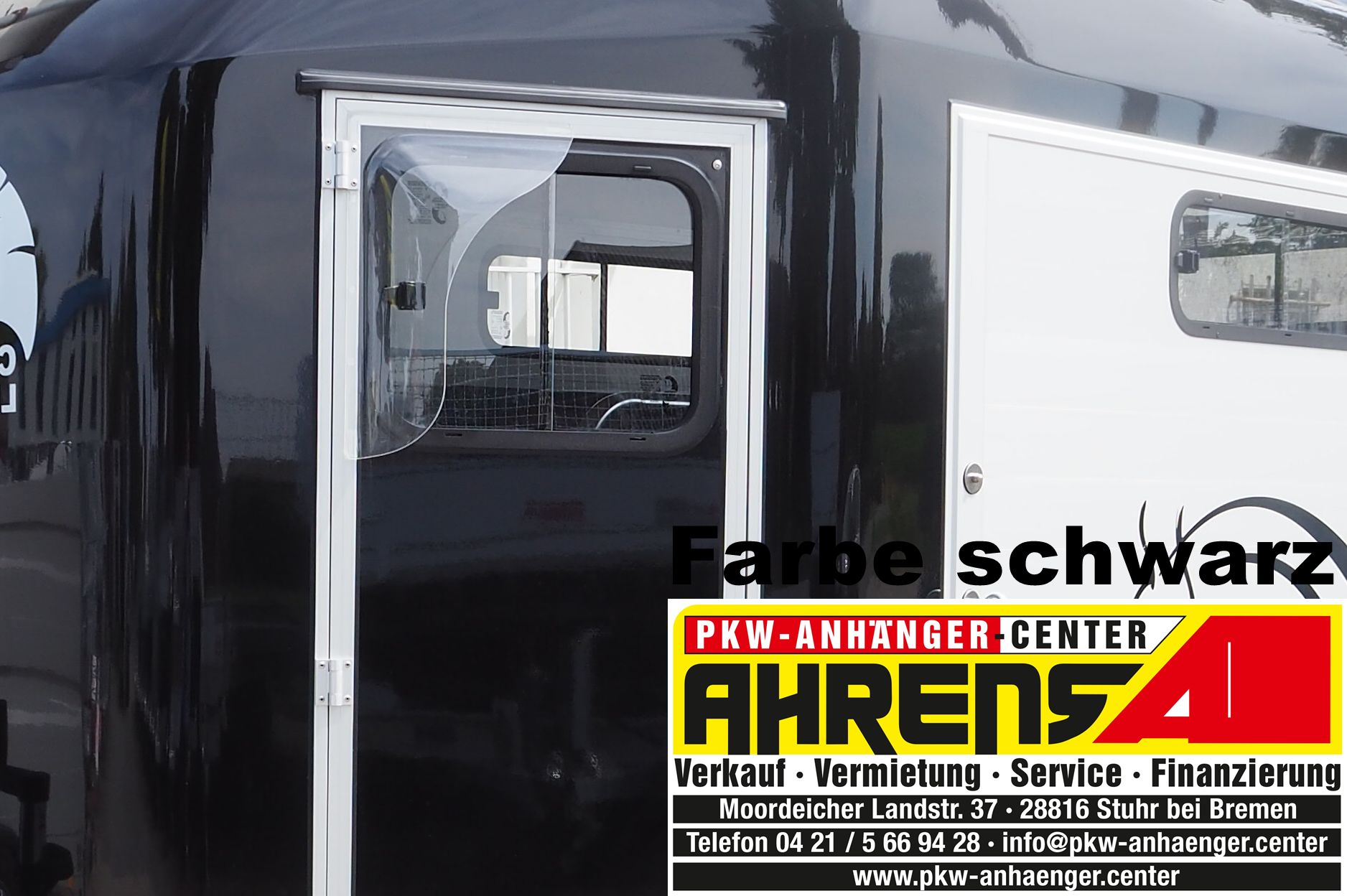 Ausstattung Pferdeanhänger : 3. Bremsleuchte, Anbindemöglichkeit außen, Anbindemöglichkeit innen, Boxenstangen geteilt mit Kunststoffschutz, Fenster getönt und aufschiebbar, Gummi auf Boden eingeklebt und versiegelt, Heunetzhaken, Höhenverstellung für Boxenstangen, Innenleuchte hinten, Kopfgitter fest und Blickschutz herausnehmbar, Kopfgitter fest und Blickschutz rausnehmbar, Panikentriegelung vorne, Planenrollo als Netz, Rangiergriff, Seitenfenster getönt und aufschiebbar, Seitenpolster, Tiefeneinstellung für Boxenstangen, Trennwand schwenk- und herausnehmbar, Trennwand schwenk- und rausnehmbar, Trittschutz an Seitenwänden, GFK-Kunststoff, Türfeststeller an Einstiegstür, besonders hohe Einstiegstür abschließbar