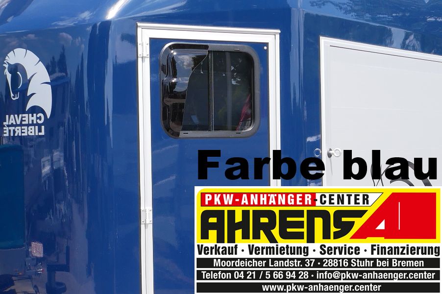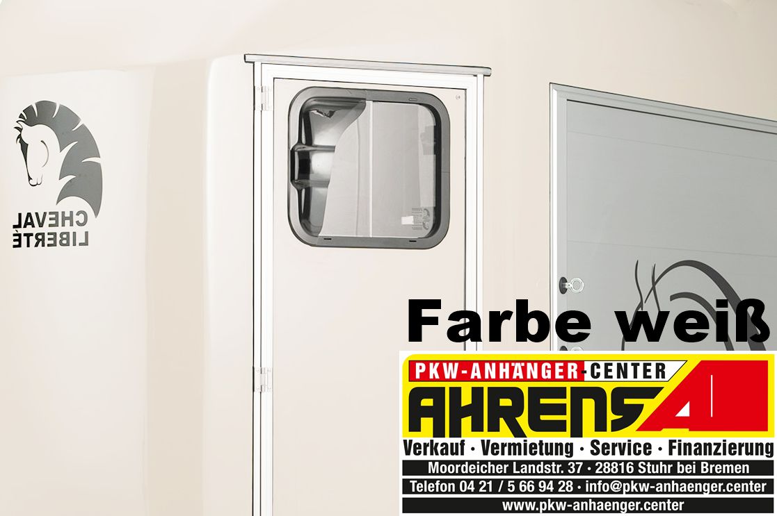 2er Pferdeanhänger mit Frontausstieg von ChevalLiberte Modell TOURING-COUNTRY-PREMIUM.Besonders hohe Einstiegstür, ansprechendes Design, aerodynamisch, verschiedene Polyfarben, hohe Aluwänden und Aluboden.Ein Pferdetransporter für zwei Pferde mit herausragenden Fahreigenschaften! Der Alupferdeanhänger ist mit Pullman2 Fahrwerk ausgestattet, das von Cheval Liberte selbst entwickelt wurde.Ein nur 35cm hoher Einstieg, Einzelradaufhängung, Längslenker, Spiralfeder und Stoßdämpfer bieten diese hervoragenden Fahrkomfort. Eine flache Auflauframpe, die auch als Tür geöffnet werden kann, macht den Pferdetransportanhänger zum Universalanhänger um Paletten einfach verladen zu können oder den Innenraum besser zu reinigen. Für die Pferde ist es stressfreier und verletzungsärmer da ein Abrutschen von der Auflaufklappe somit vermieden wird.Die Serienausstattung des Zweipferdehänger bietet einen Frontausstieg, Polyhaube in verschiedenen Farben, hohe Aluwänden, Aluboden, hohe Einstiegstür, Klappe/Tür-System, Pullman 2 Fahrwerk, 100km/h, Innenleuchte, Automatik-Stützrad, vier Schiebefenster, stabilem Rahmen, V-Deichsel und so weiter. Die gesamte Ausstattung finden Sie weiter unten.Zubehör wie Anbindebügel, Futtereimer, Witterungshaube, Deichselhaube, zweiflügelige Tür, Diebstahlsicherung, Alufelgen und Kratzmatten ist auch erhältlich.Der Aufbau ist spritzwassergeschütz.Technische Daten: