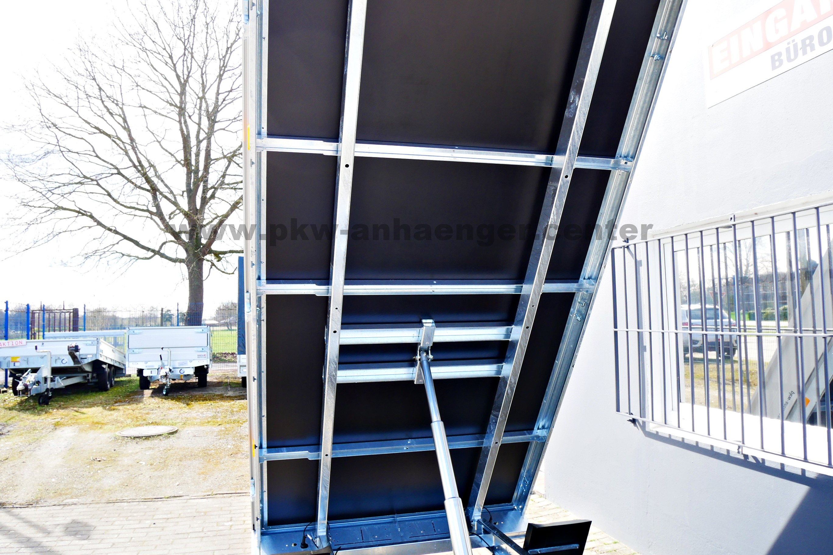 Hier gibt es preiswert einen Gitteraufsatz, Bordwandaufsatz, Plane mit Gestell, Elektrohydraulik, Auffahrschienen, Heckstützen, 100km/h-Zulassung, Werkzeugbox, Zurrgurte und Schloß.