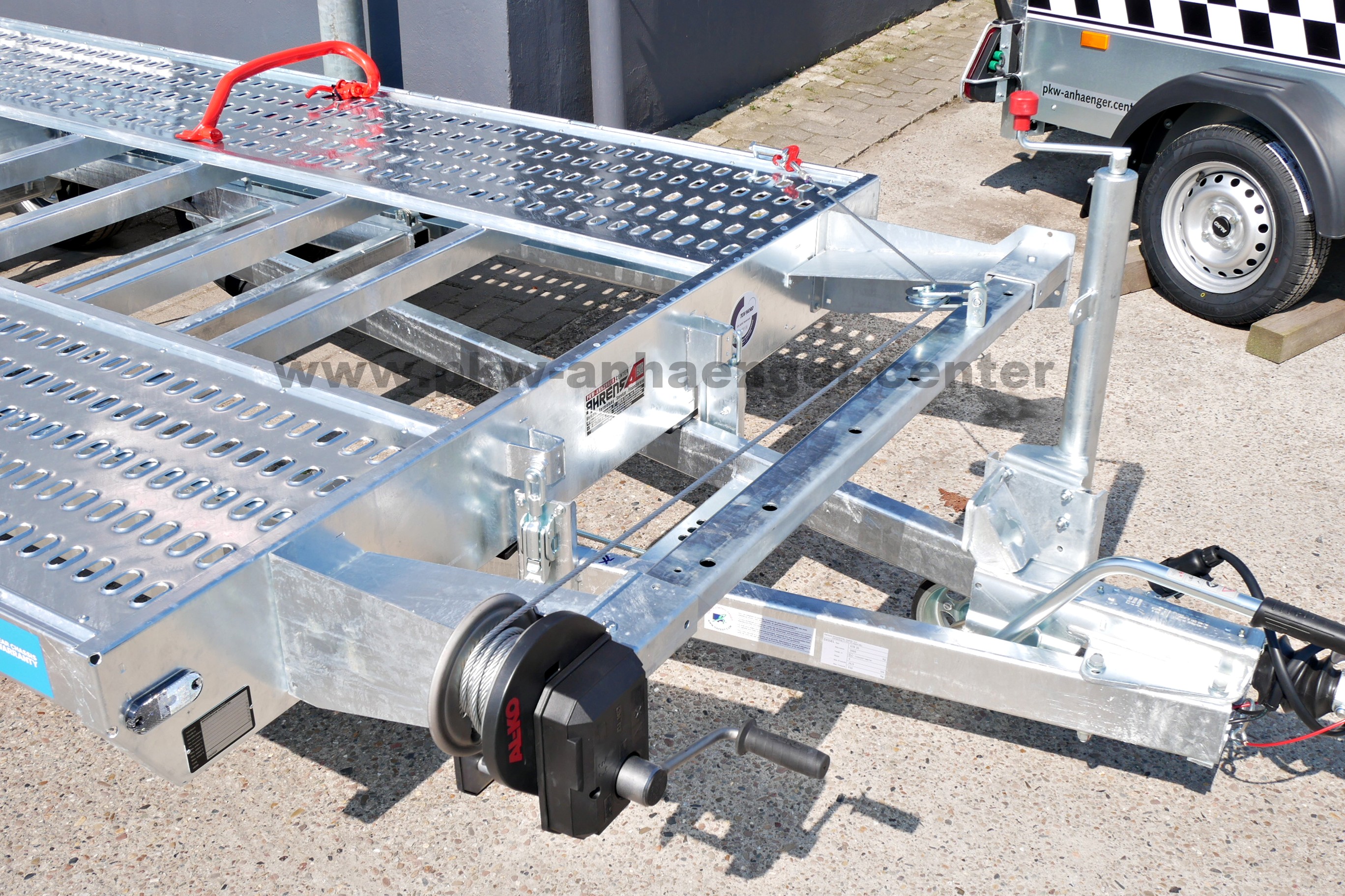 Ausgestattet ist der Autotrailer mit stabilen Auffahrschienen, Kippplattform durch Gewichtsverlagerung, Seilwinde mit Halter verstellbar, Zurrösen mit 1000kg belastbar, Radstopper, Automatik-Stützrad, extrem stabil geschweißter und Tauchbad feuerverzinkt Rahmen und V-Deichsel.
