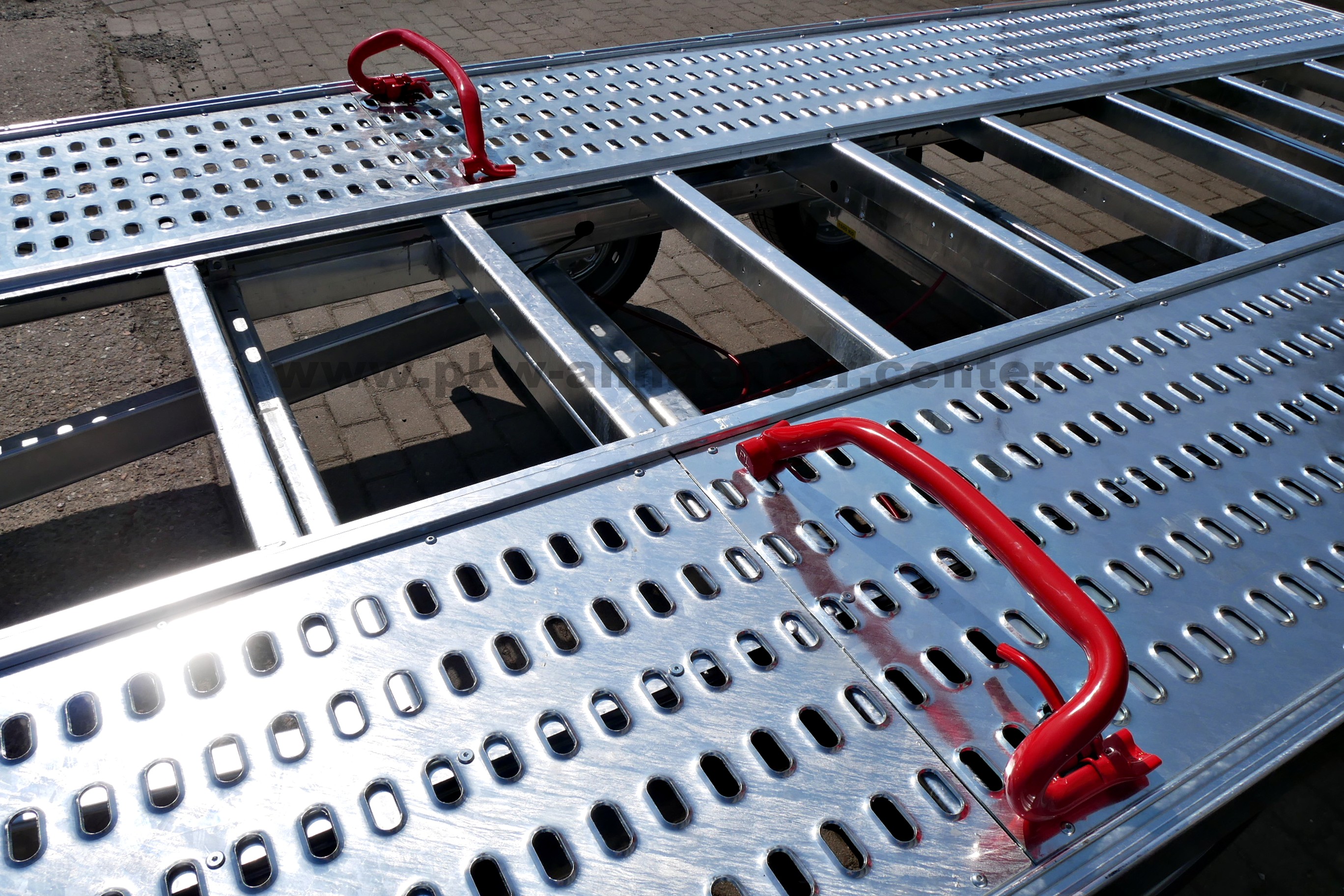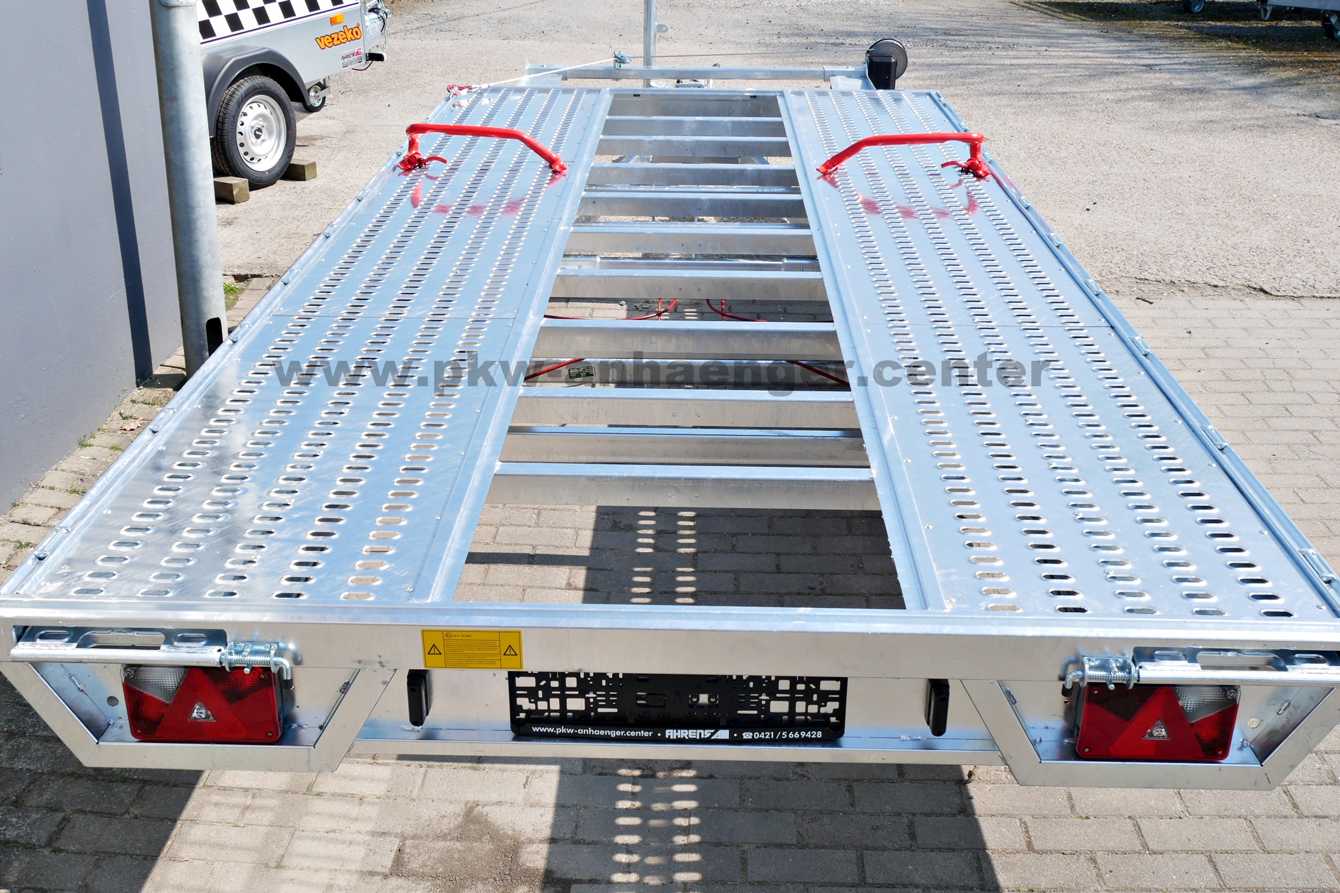 Der Autotransportanhänger ist ankippbar und hat Auffahrschienen und lässt sich somit bequem Beladen. Ein absoluter Universalanhänger nicht nur für Autos sondern auch zum Transport von Rasenmäher, Traktoren und Kleinfahrzeugen.