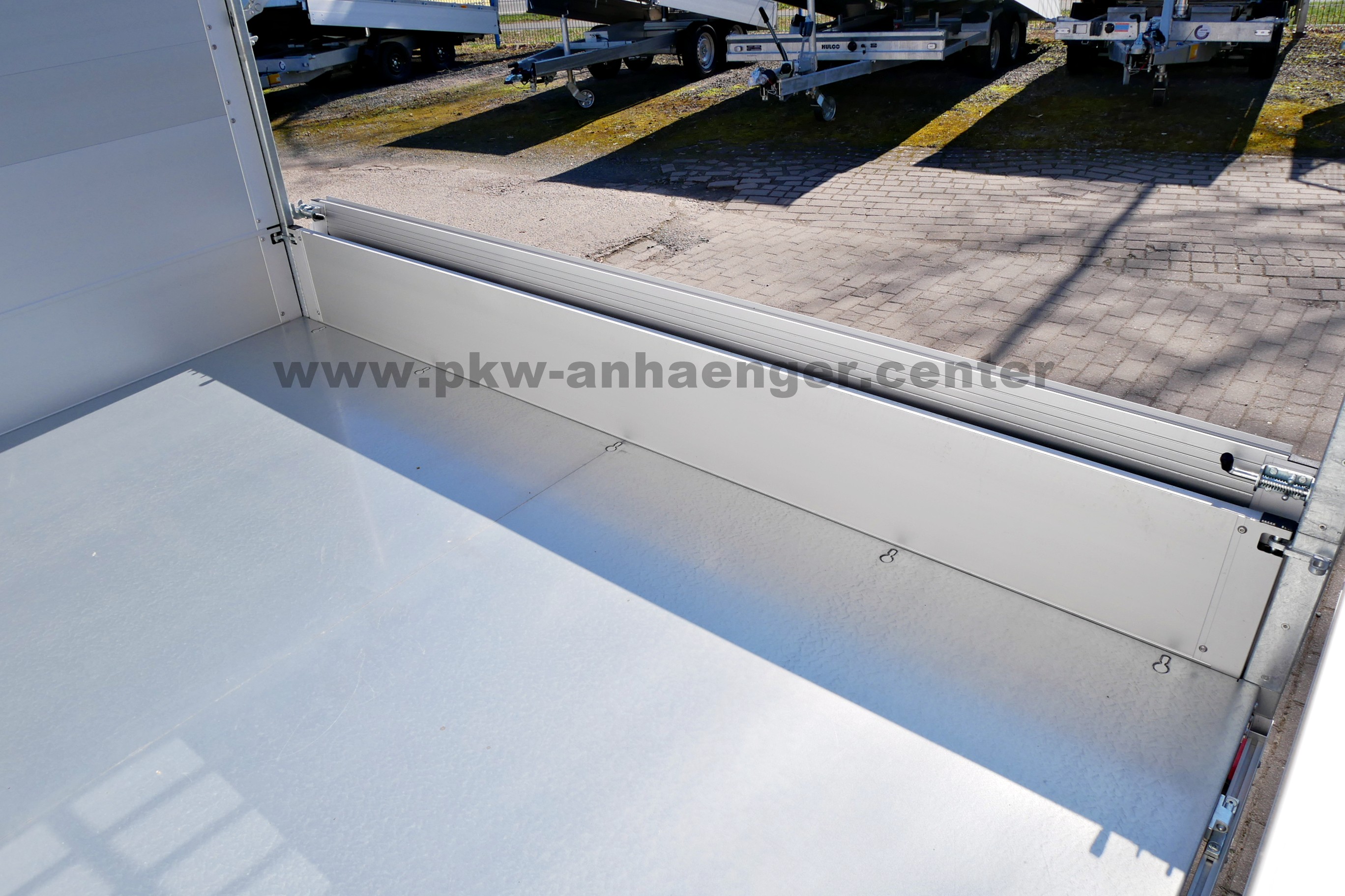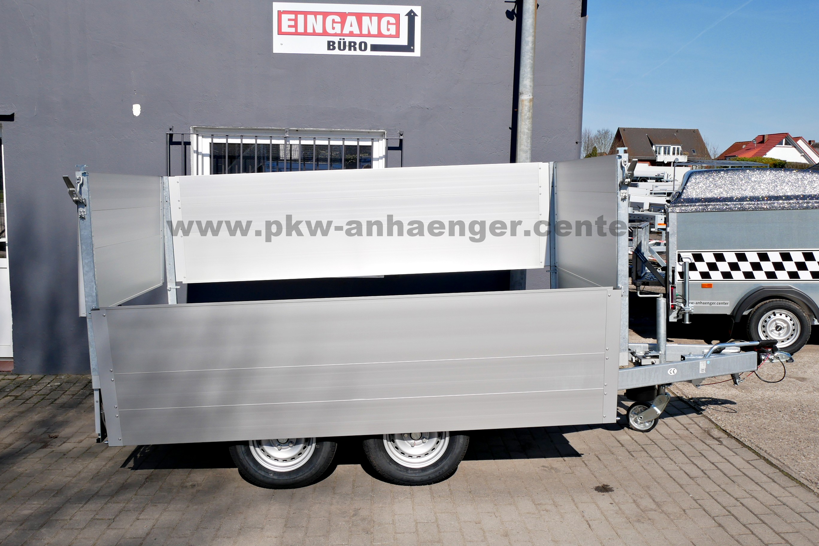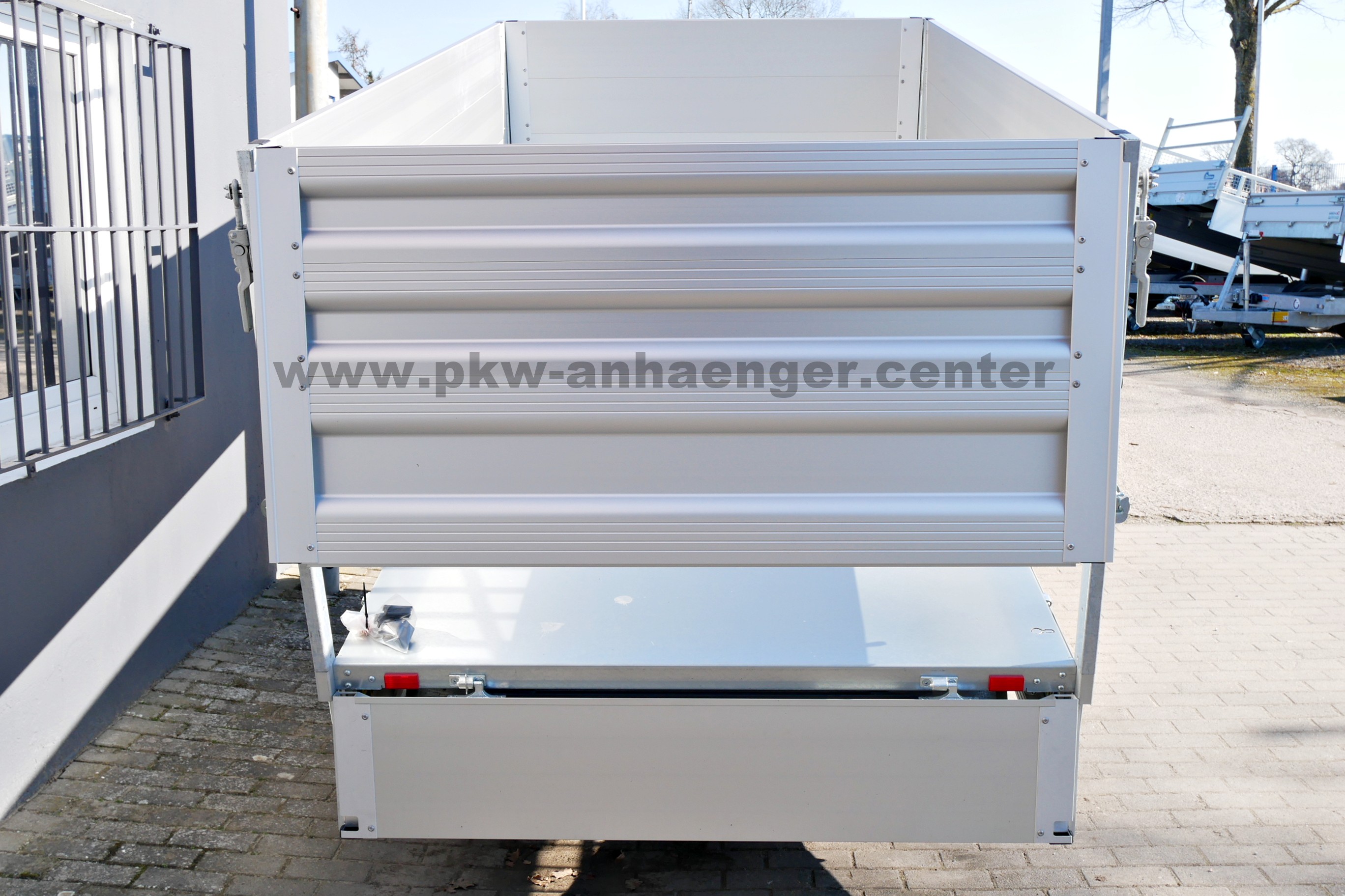 Ausgestattet ist der Pkwanhänger mit Bordwänden klapp- und abnehmbar, 75cm Alu-Bordwandaufsatz pendel-, klapp- und abnehmbar, Massivstahlboden, PUMPless-Hydraulik für Akkuschrauber, Automatik-Stützrad, Zurrösen, geschweißtem Tauchbad feuerverzinktem Rahmen und einer sehr stabilen V-Deichsel.