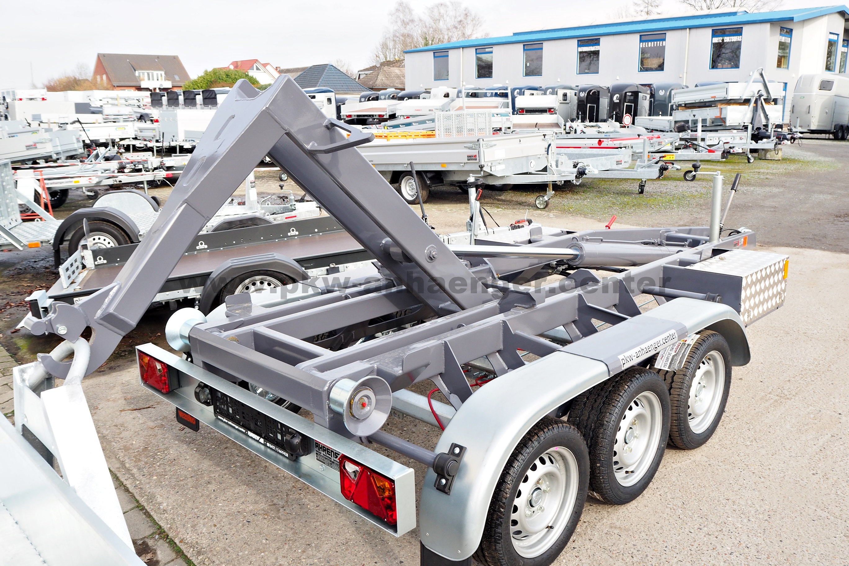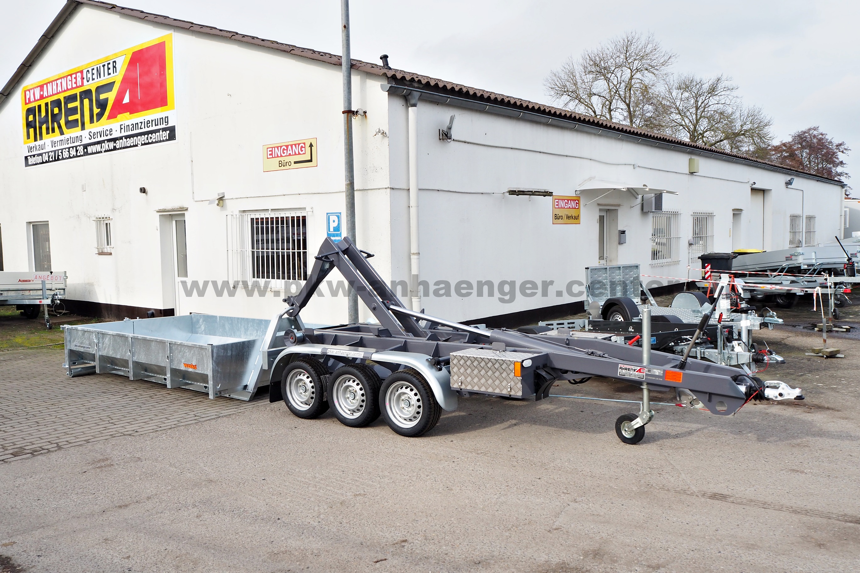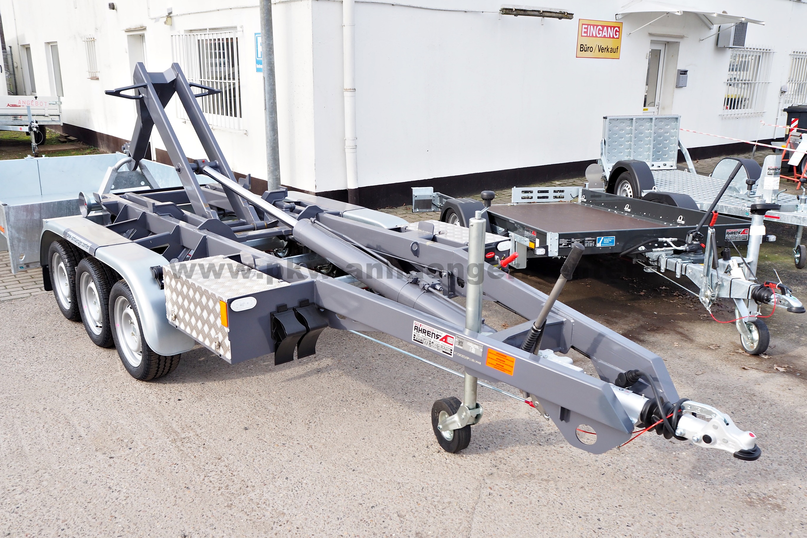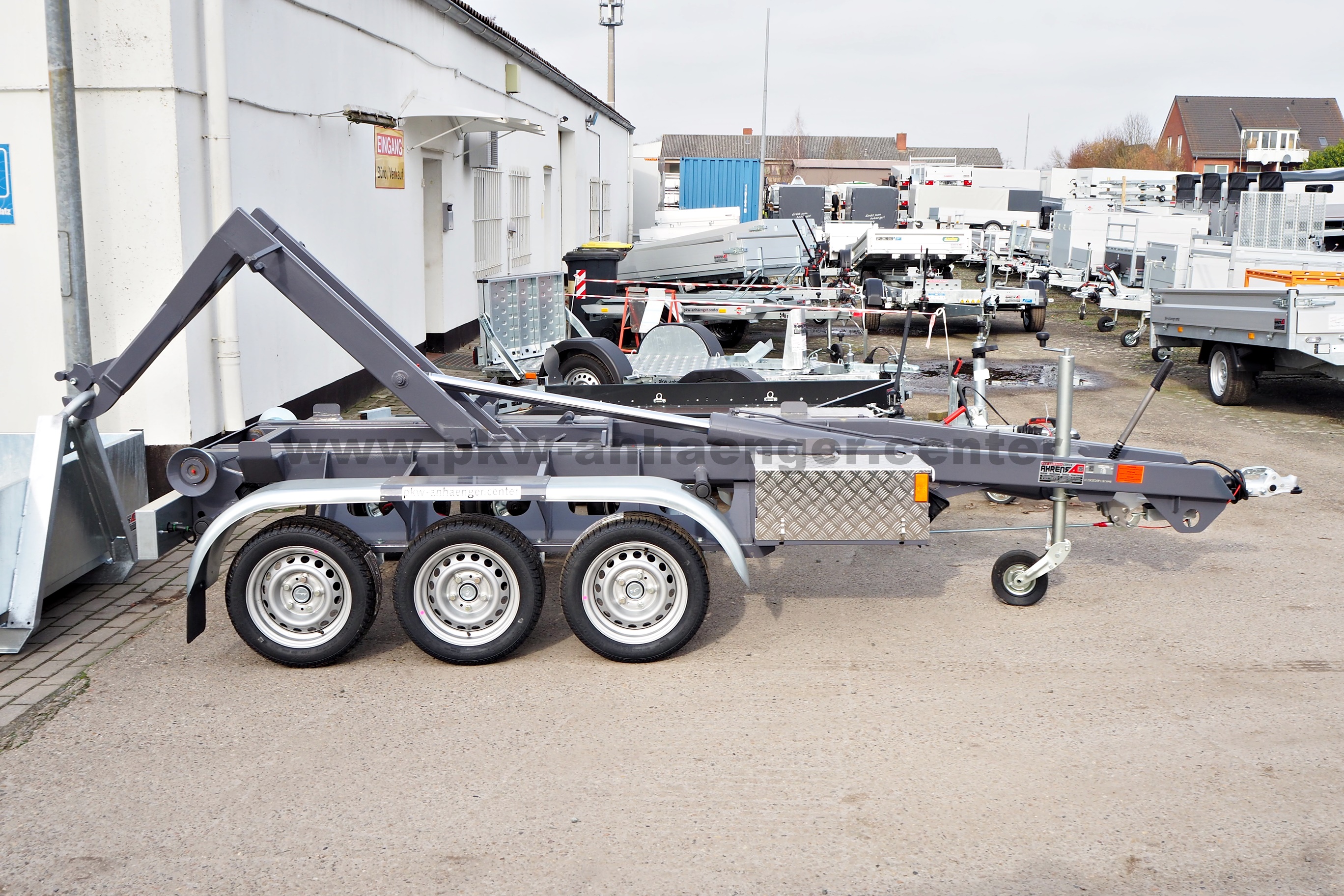einen Haken mit Hydraulikstempel, E-Hydraulik und eingebaute Batterie, Funkfernbedienung, Ladegerät, 3 Achsen, Stützrad, extrem stabiler geschweißter Rahmen und V-Deichsel lackiert in dunkelgrau.