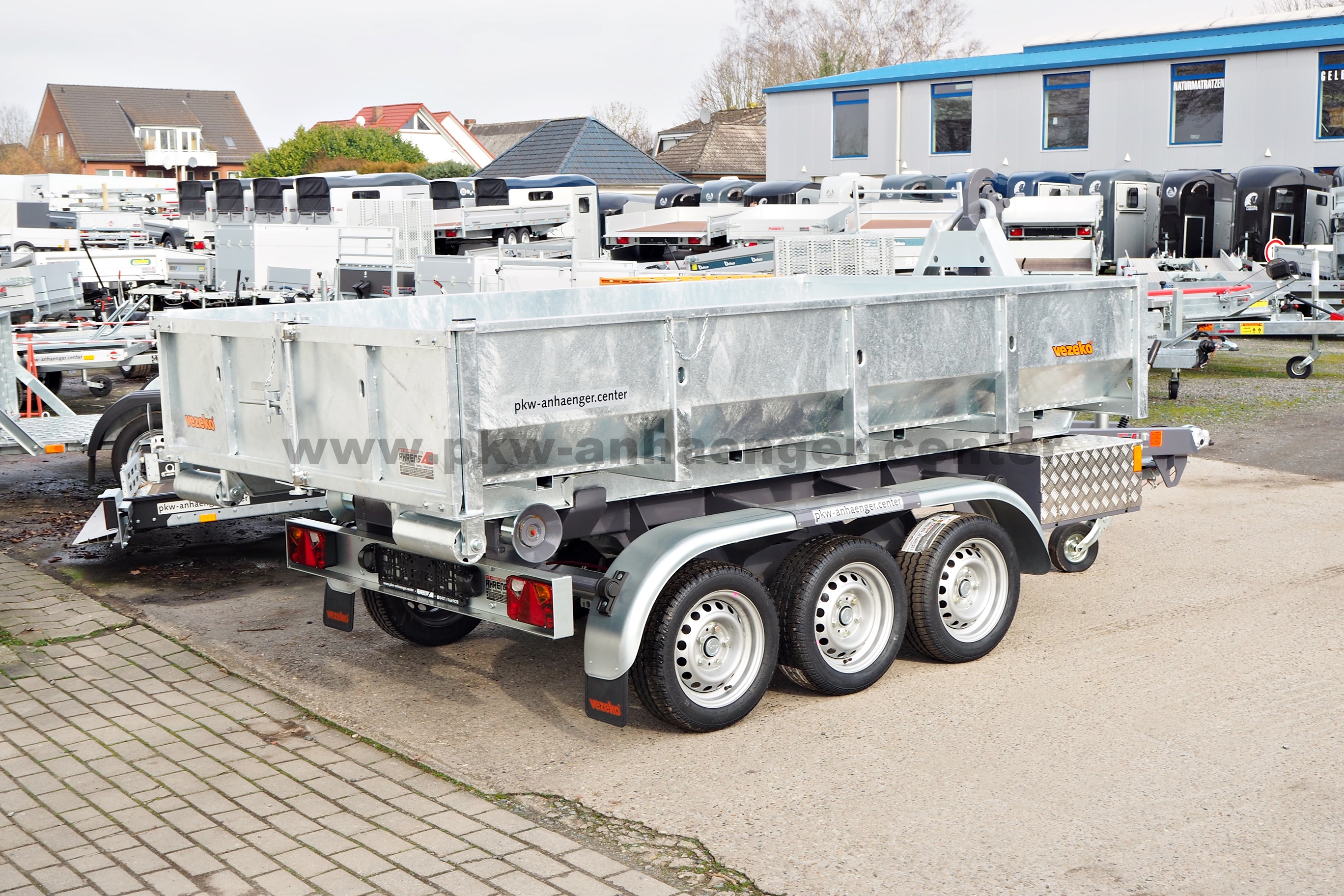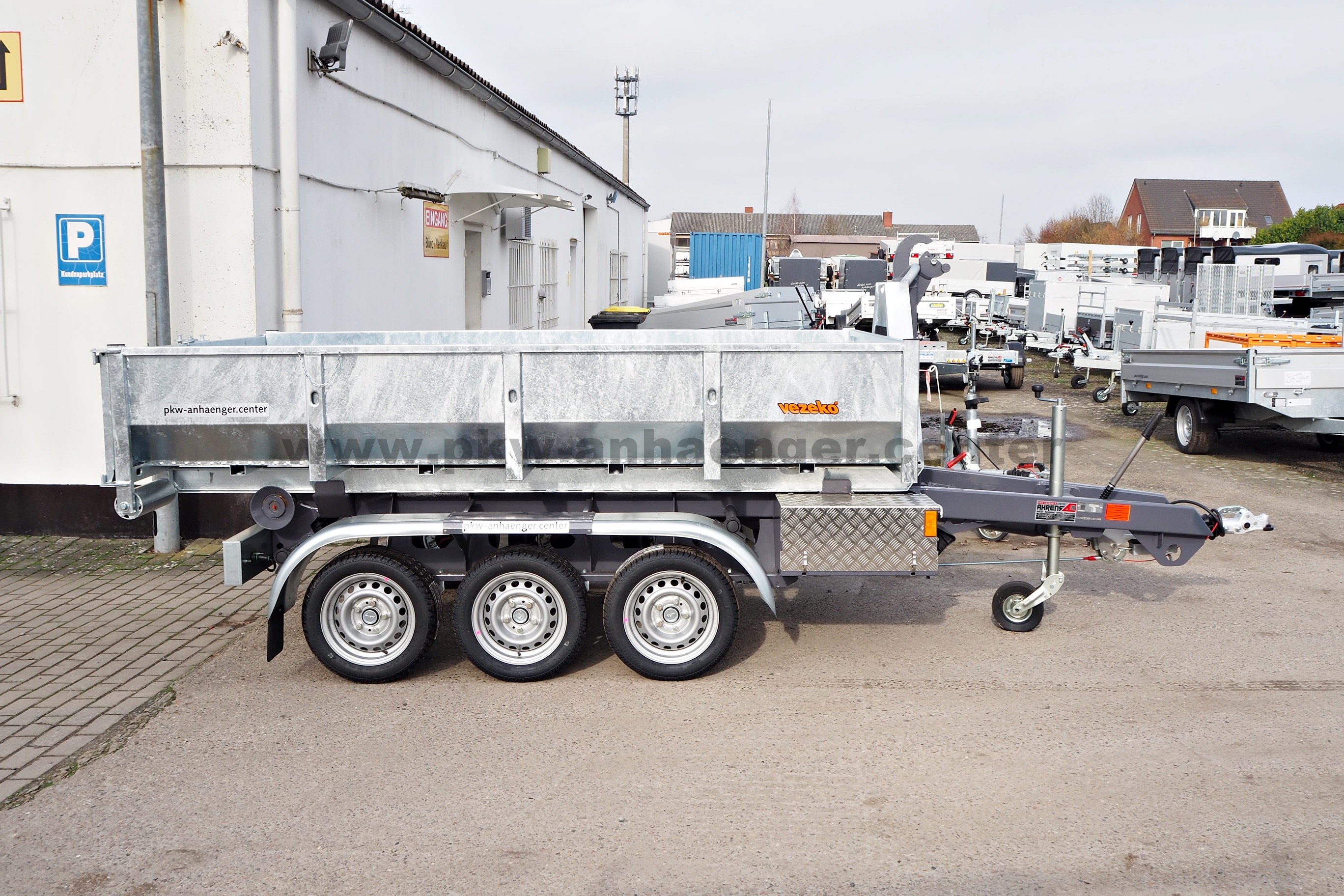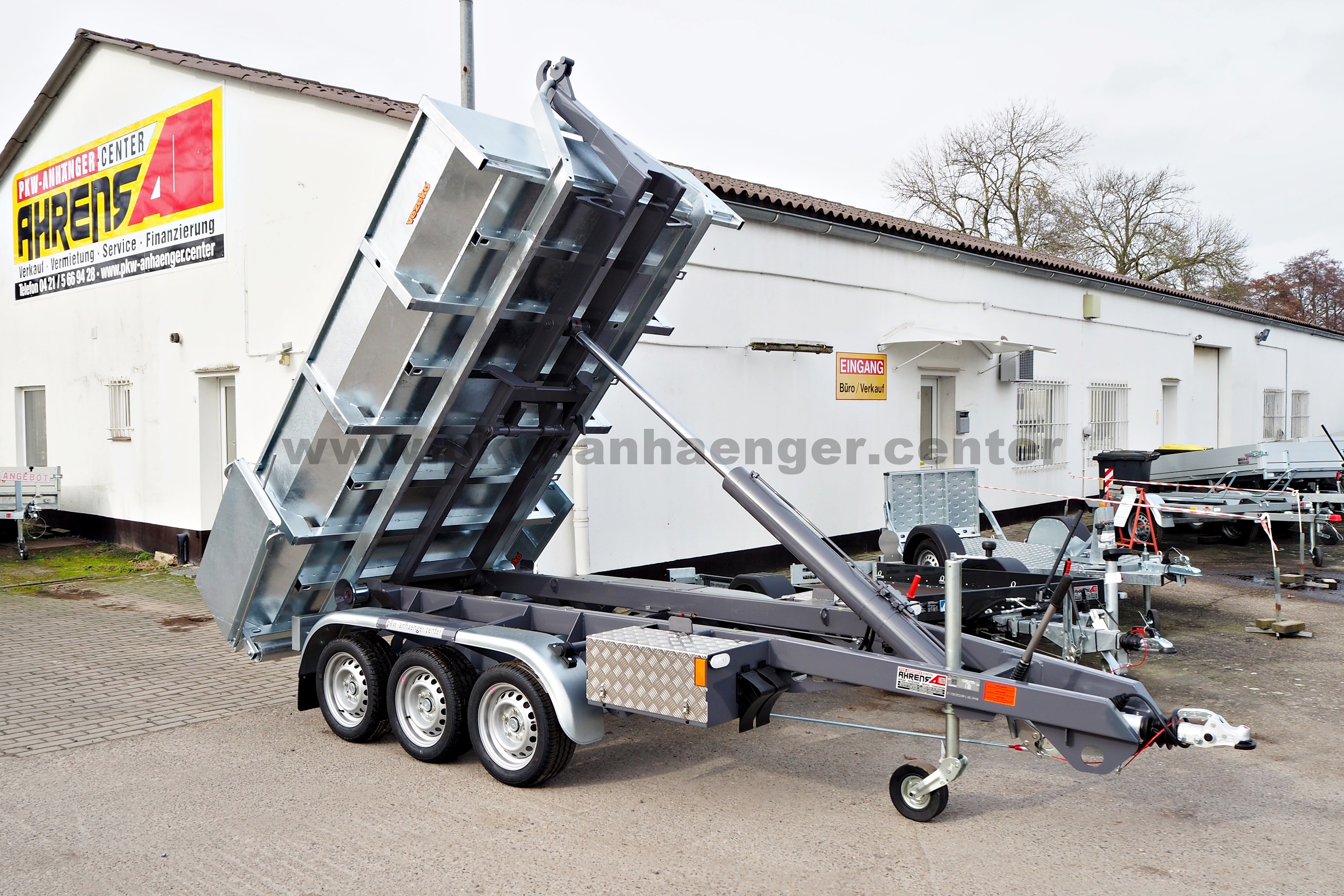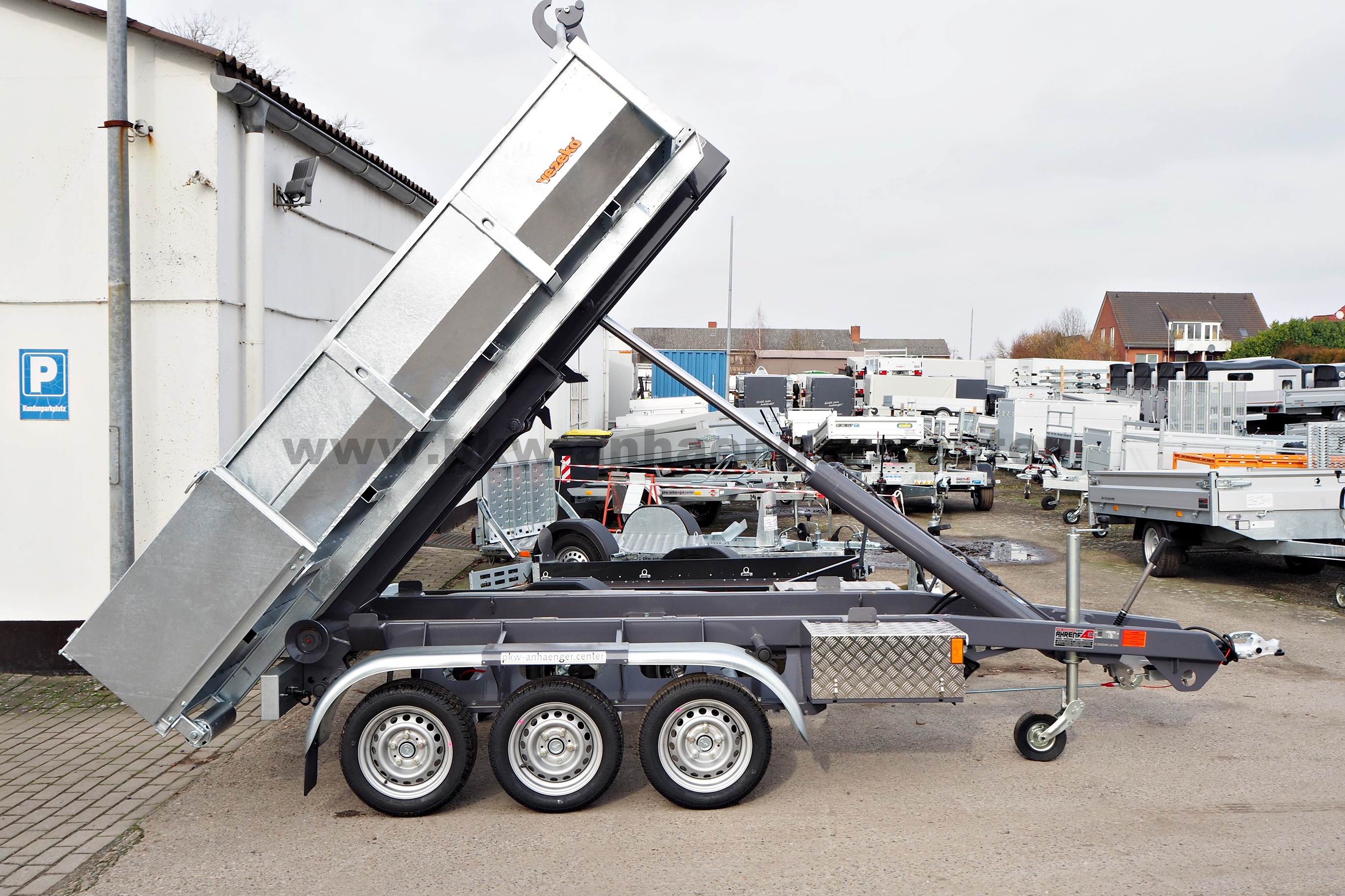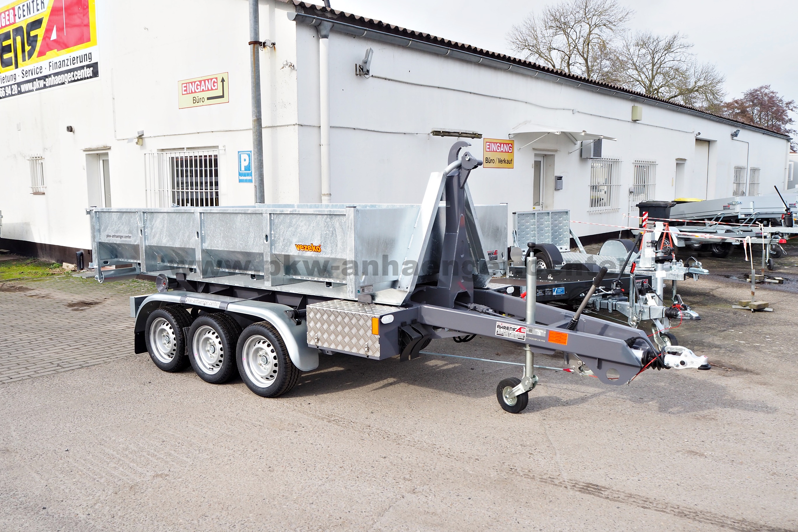 einen Haken mit Hydraulikstempel, E-Hydraulik und eingebaute Batterie, Funkfernbedienung, Ladegerät, 3 Achsen, Stützrad, extrem stabiler geschweißter Rahmen und V-Deichsel lackiert in dunkelgrau.