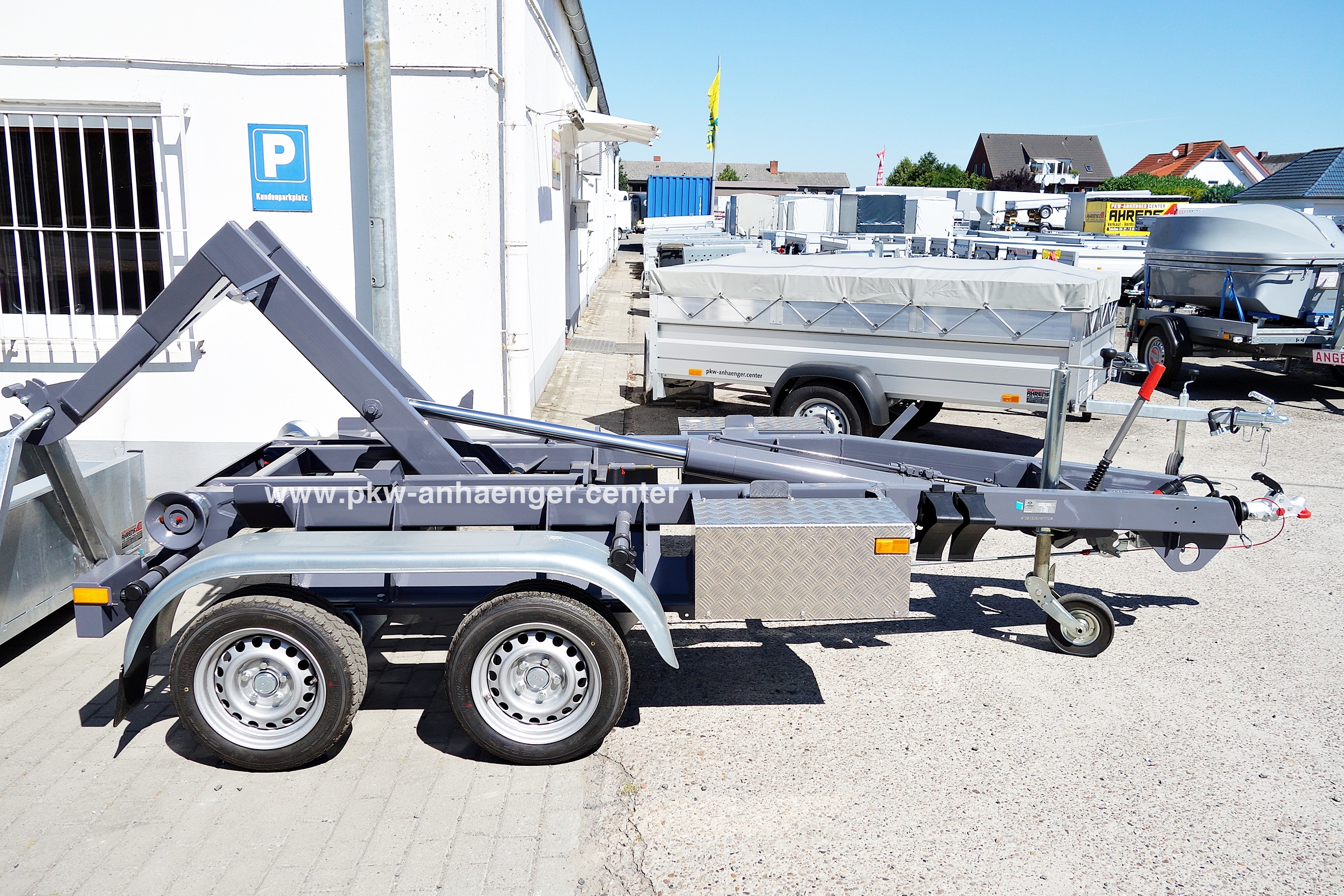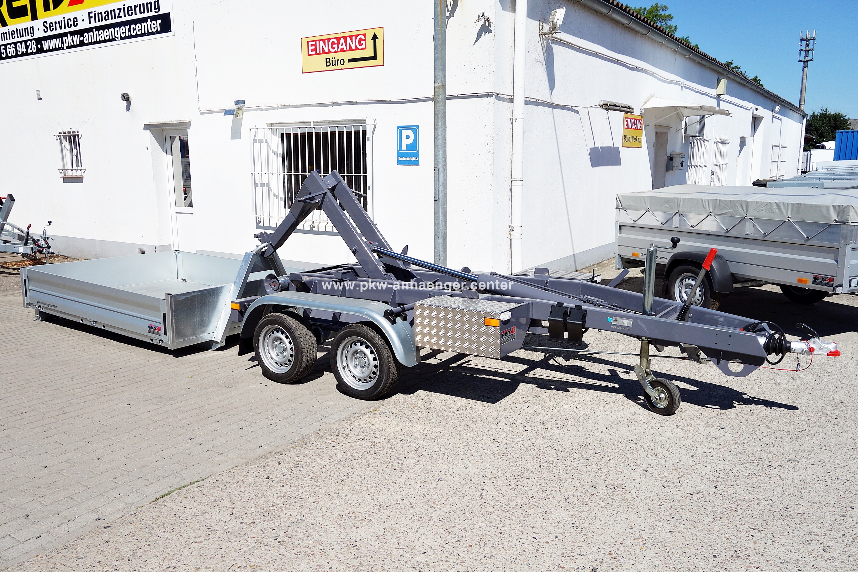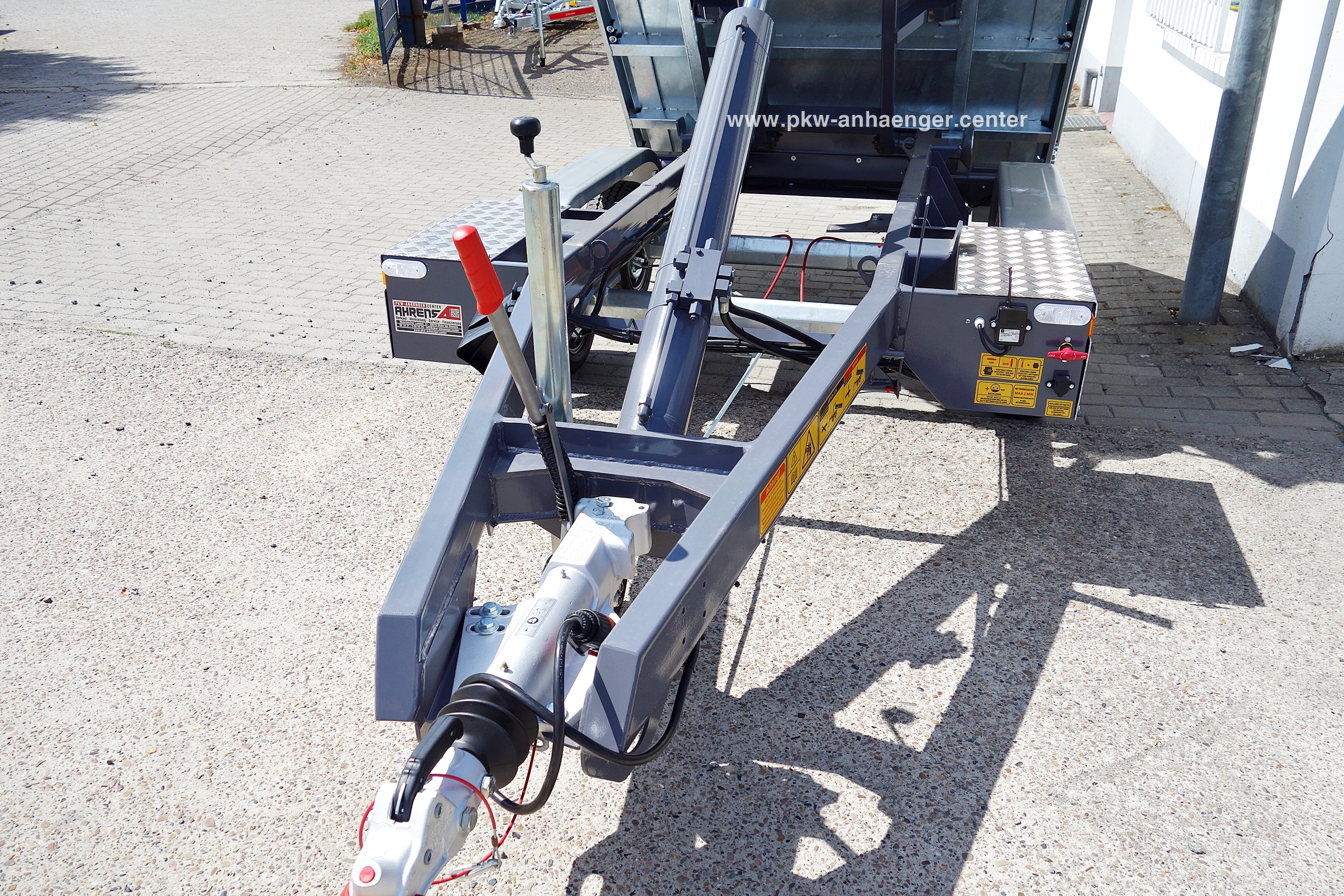 Mit dem Haken und der eingebauten E-Hydraulik mit Funkfernbedienung können die optionalen Mulden oder Pritschen leicht wieder vom Pkwanhänger aufgenommen und abgeschoben werden.