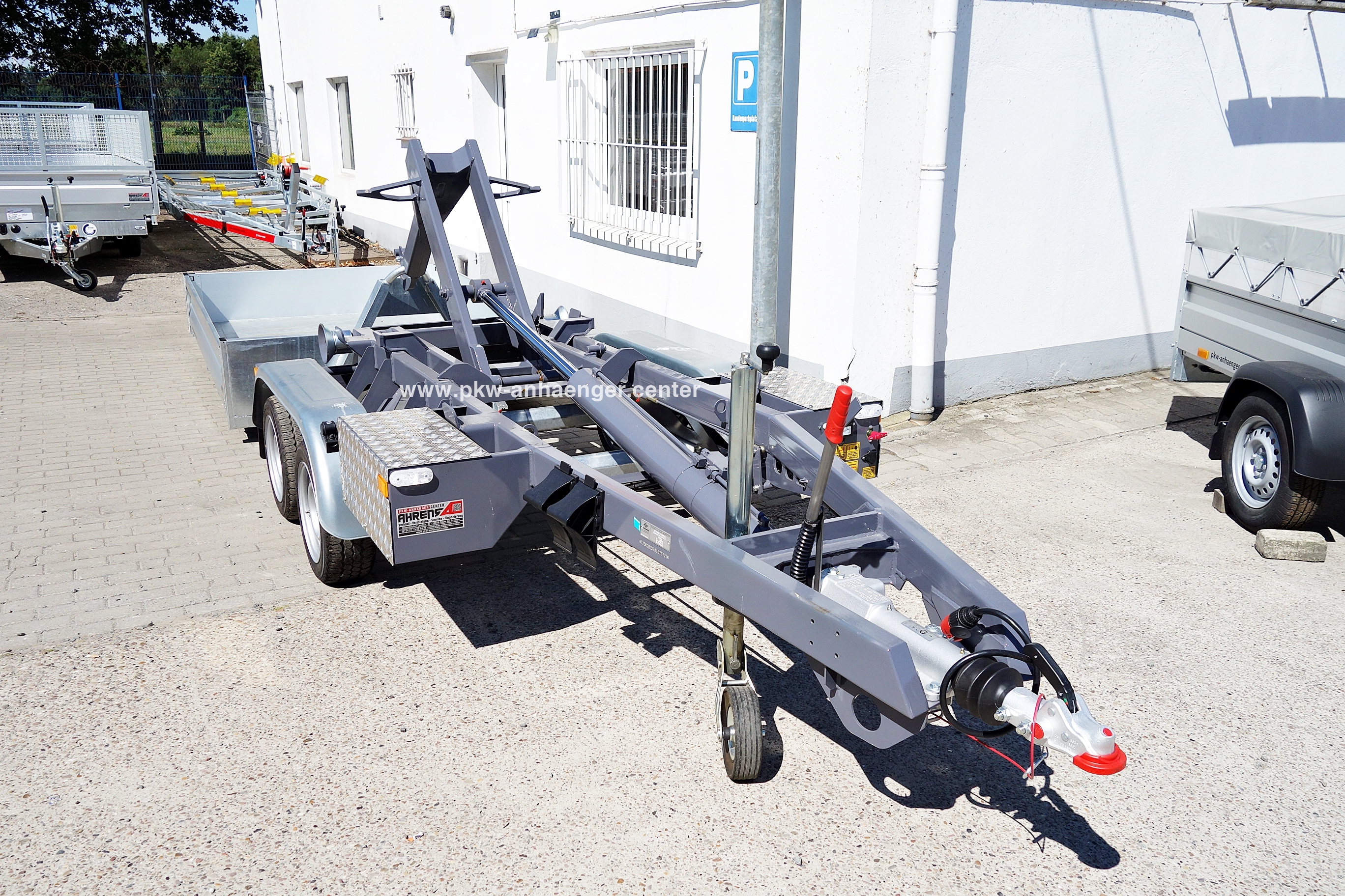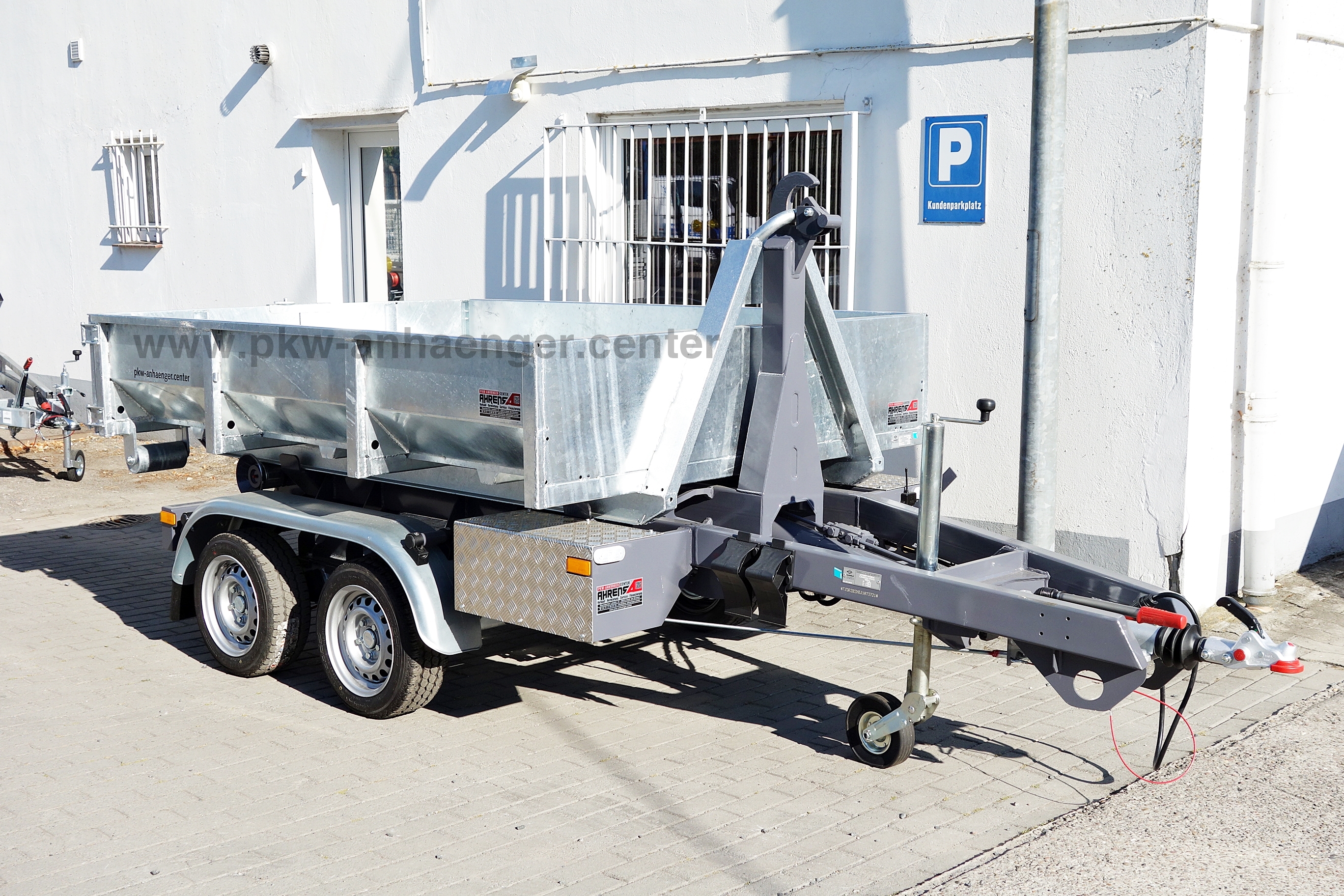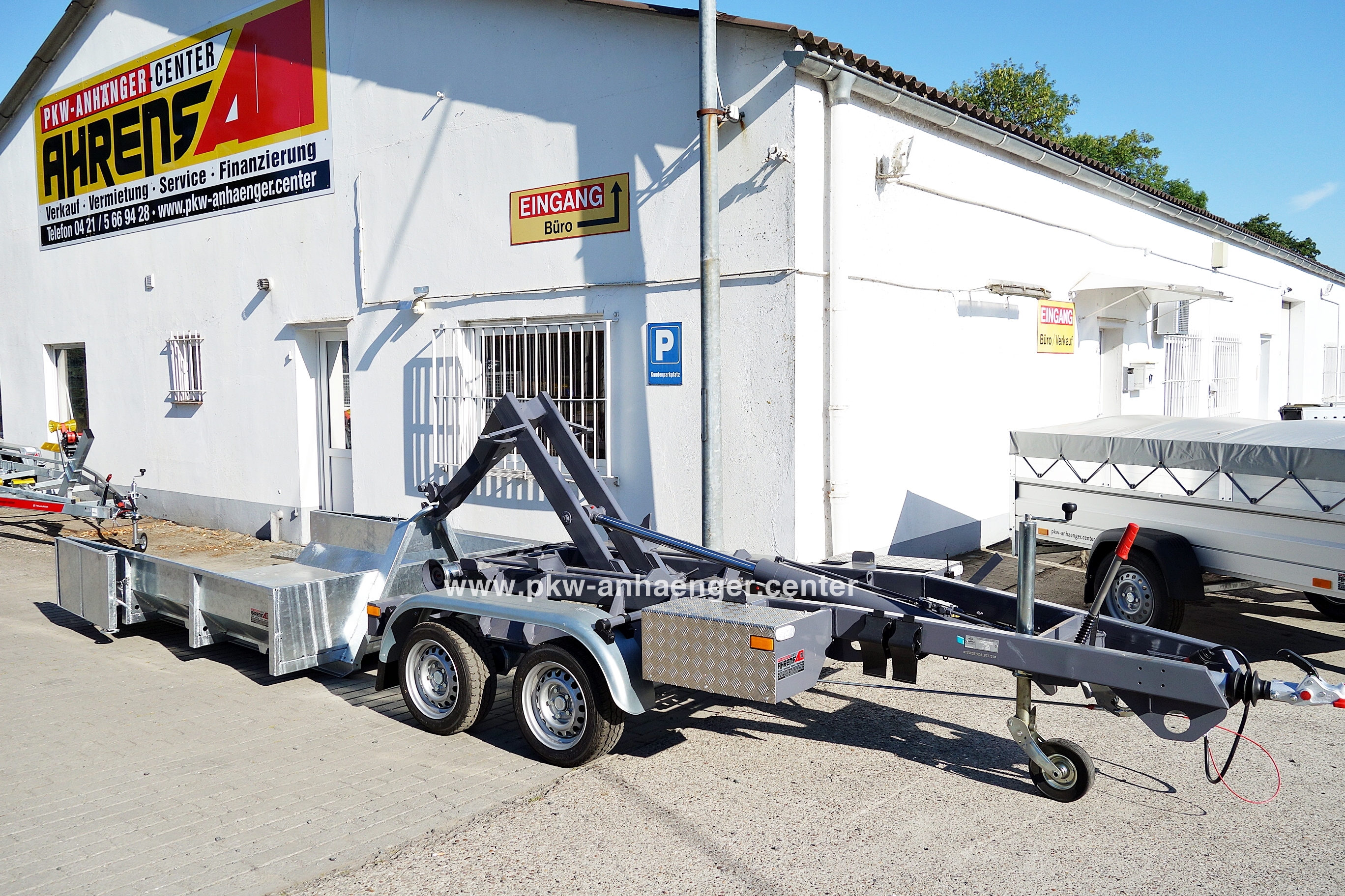 Mit dem Haken und der eingebauten E-Hydraulik mit Funkfernbedienung können die optionalen Mulden oder Pritschen leicht wieder vom Pkwanhänger aufgenommen und abgeschoben werden.