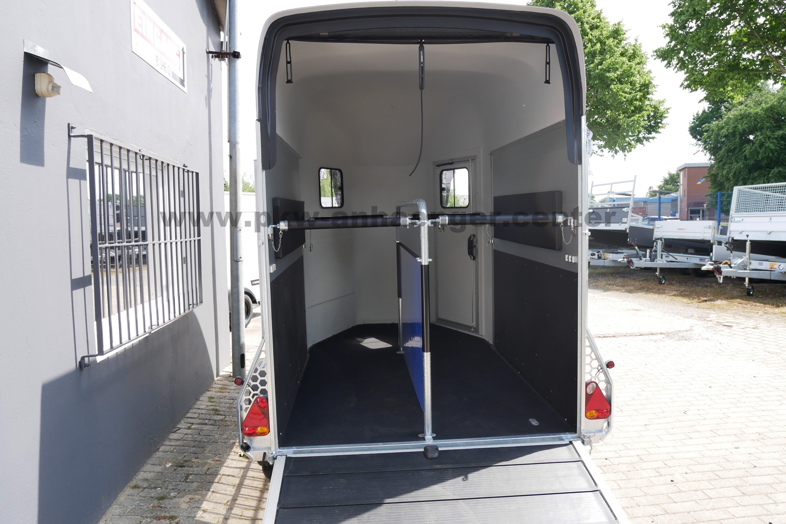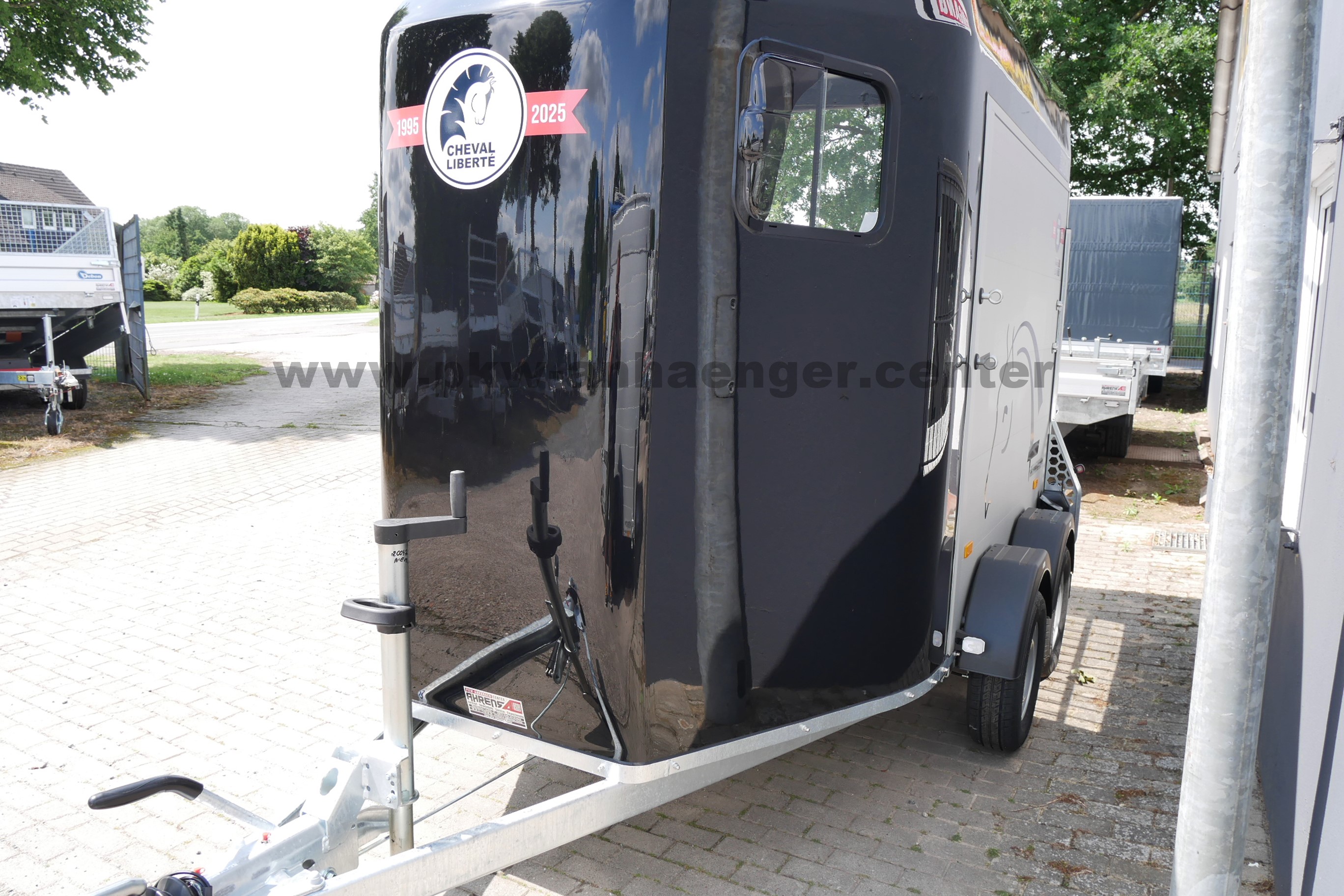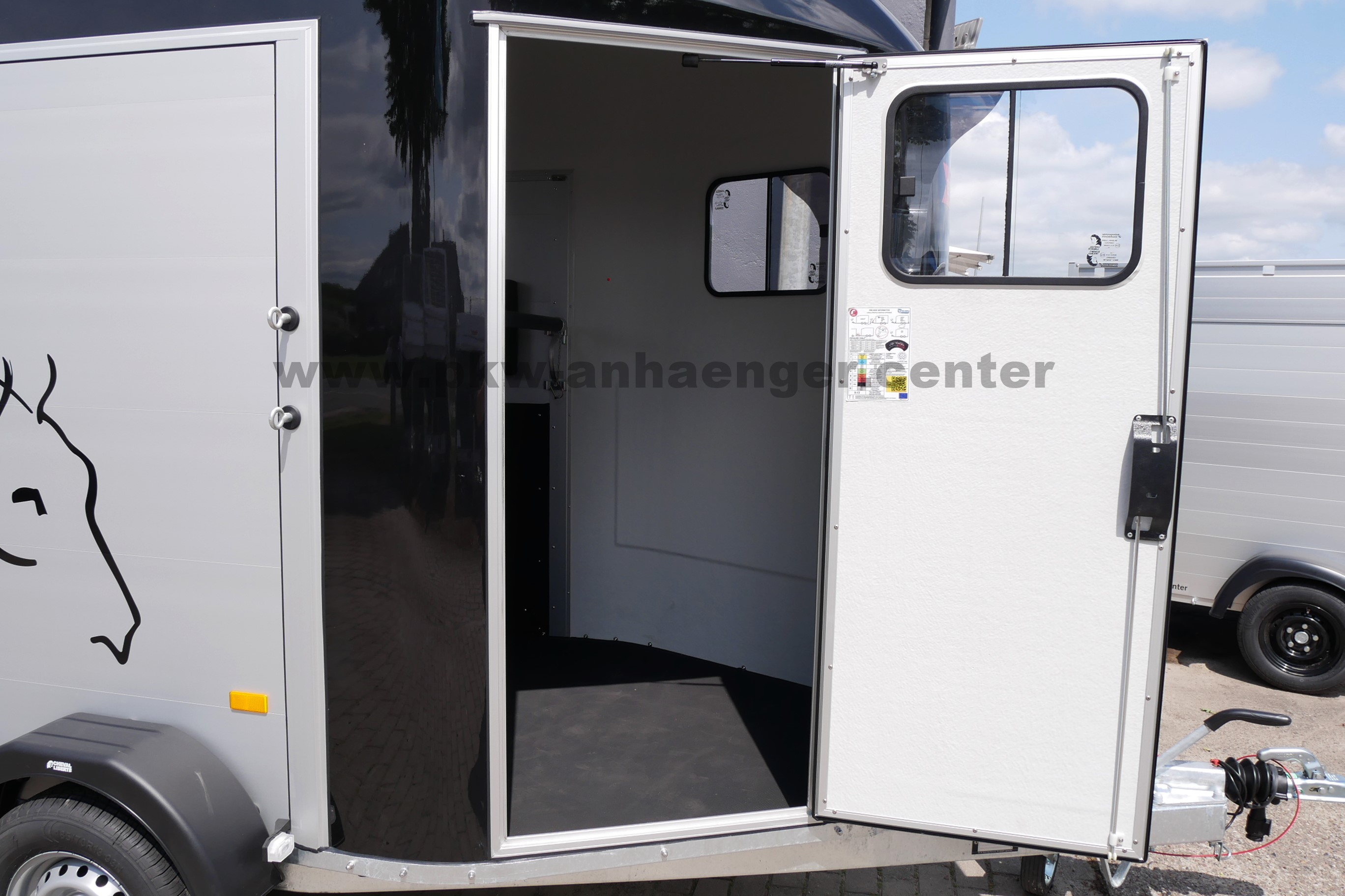 Ausgestattet ist der Zweipferdehänger mit Gummifederachse, Polyesterhaube , Aluwände, Aluboden, Einstiegstür, Klappe-Türsystem, Innenleuchte, Automatikstützrad, stabilem Rahmen, V-Deichsel und so weiter.
