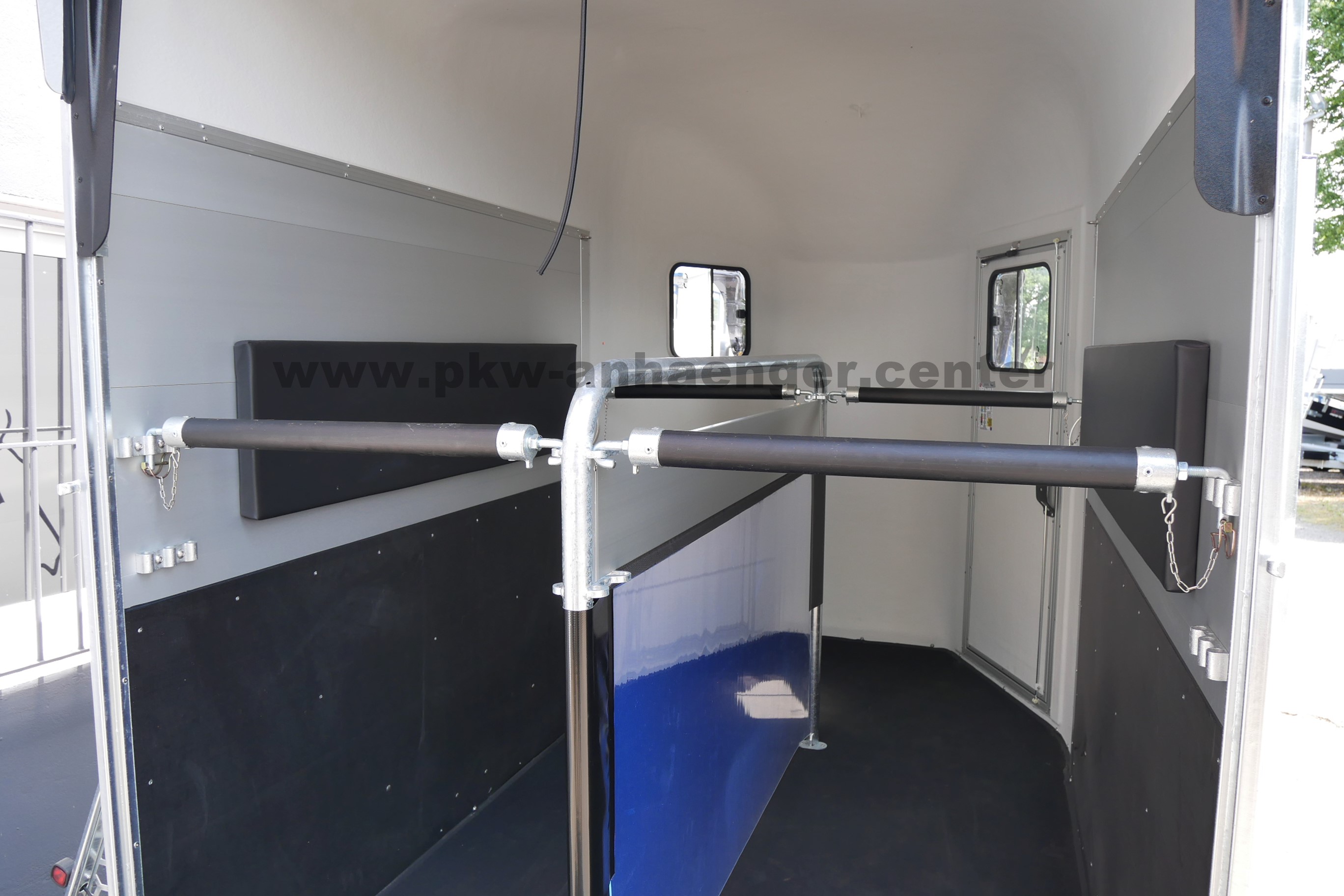 Ausstattung Pferdeanhänger : | 3. Bremsleuchte, Anbindemöglichkeit außen, Anbindemöglichkeit innen, Boxenstangen geteilt mit Kunststoffschutz, Einstiegstür abschließbar, Fenster getönt und aufschiebbar, Gummi auf Boden eingeklebt und versiegelt, Heunetzhaken, Höhenverstellung für Boxenstangen, Panikentriegelung vorne, Planenrollo als Netz, Rangiergriff, Seitenpolster, Tiefeneinstellung für Boxenstangen, Trennwand herausnehmbar, Trennwand rausnehmbar, Trittschutz an Seitenwänden, GFK-Kunststoff, Türfeststeller an Einstiegstür |