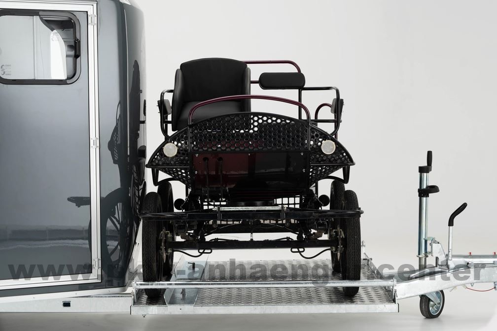Die Ausstattung des Zweipferdehänger beinhaltet eine Polyhaube in verschiedenen Farben, Aluwänden, Aluboden, Einstiegstür, Klappe/Tür-System, Pullman2 Fahrwerk, 100km/h, Innenleuchte, Automatik-Stützrad, Ersatzrad, stabilem Rahmen, V-Deichsel und einiges mehr. Die Kutschenplattform auf der Deichsel ist aus Alu in Breite 180 und Tiefe 150cm. Mit den seitlichen Zurrlöchern und Radstopper wird die Kutsche gesichert. Um Kutschen aufzuladen sind serienmäßig Auffahrschienen dabei.