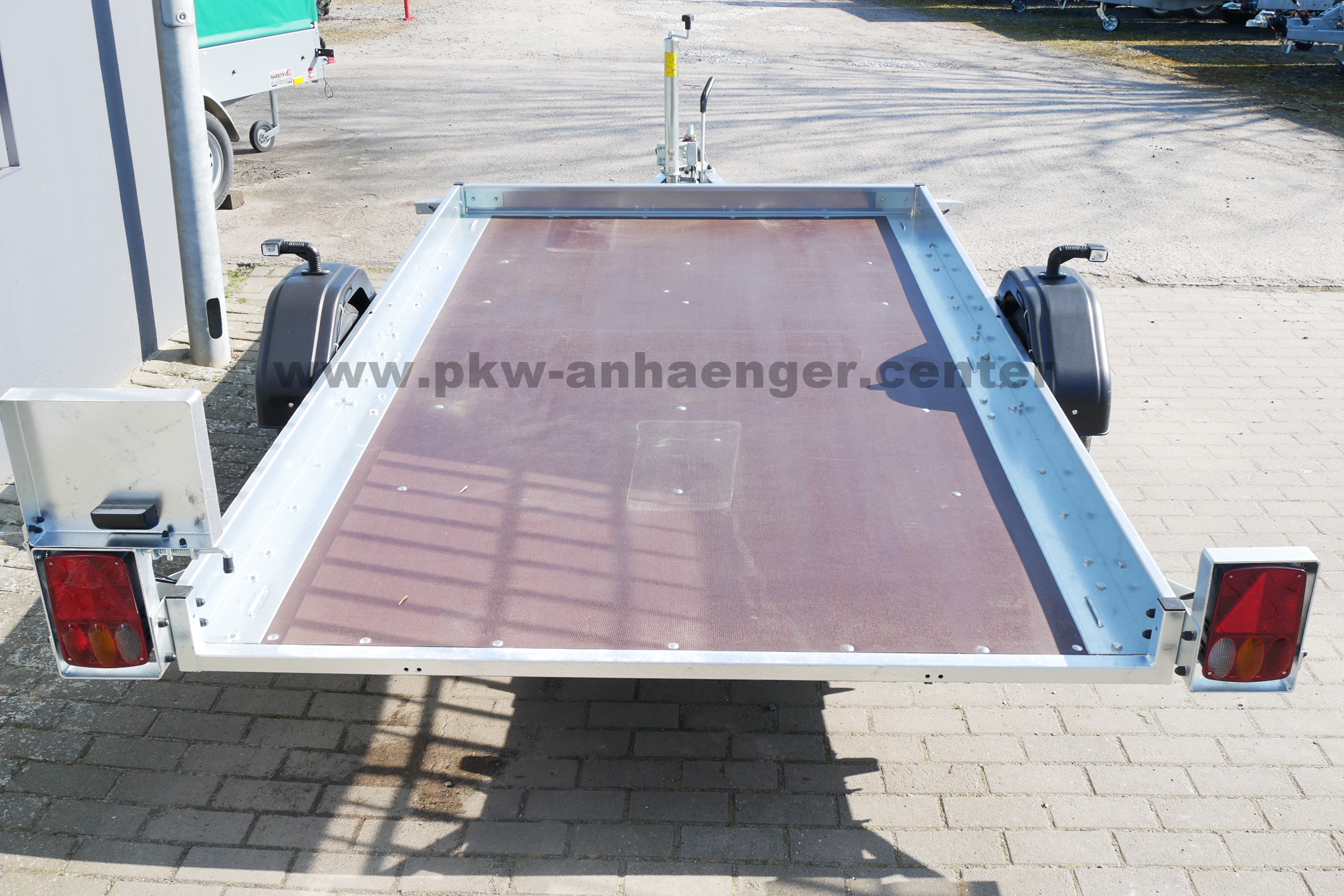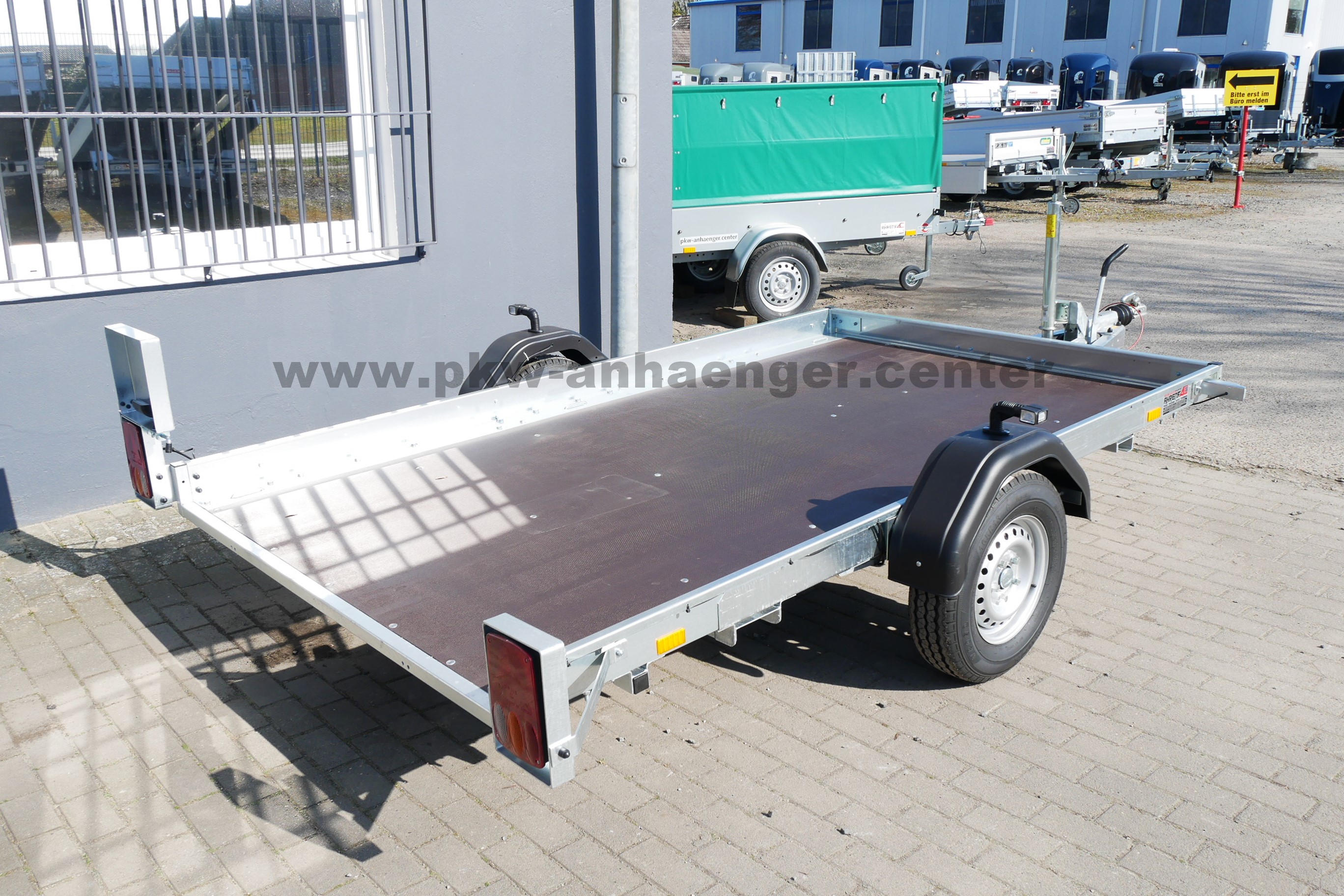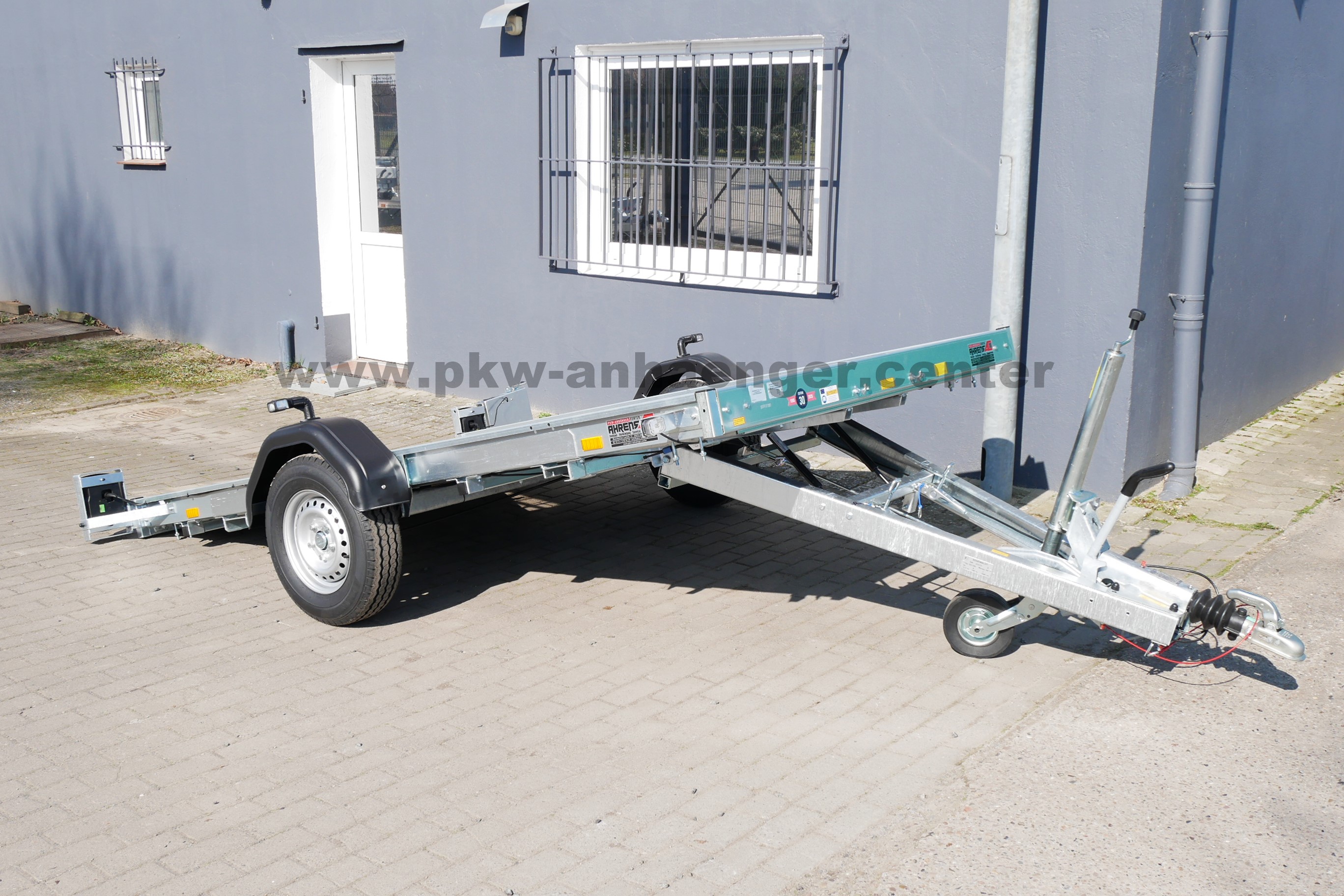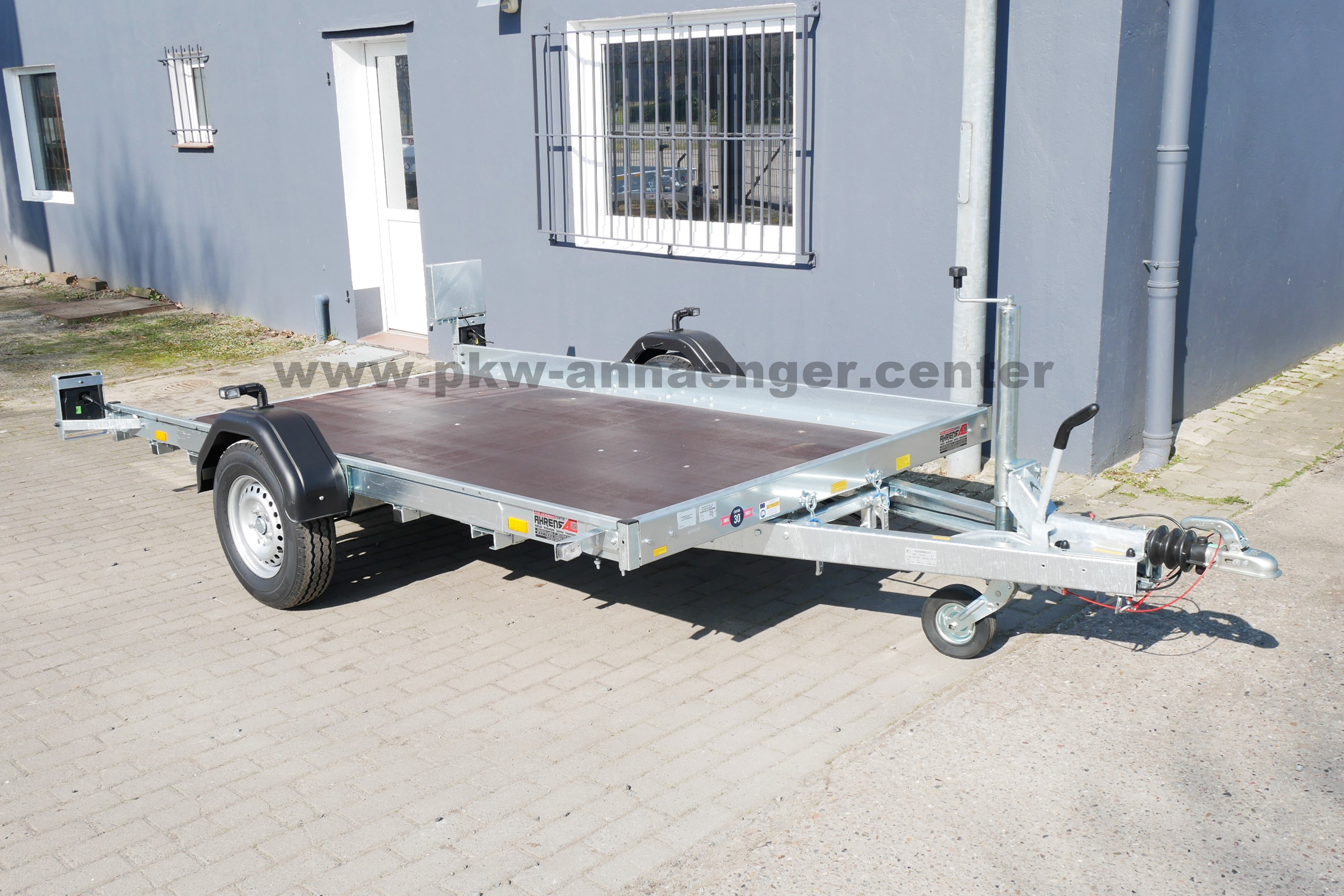 Ausgestattet ist der Pkwanhänger mit klappbarer Plattform, Holzboden, Zurrösen, Automatik-Stützrad, verzinktem Rahmen und einer V-Deichsel.