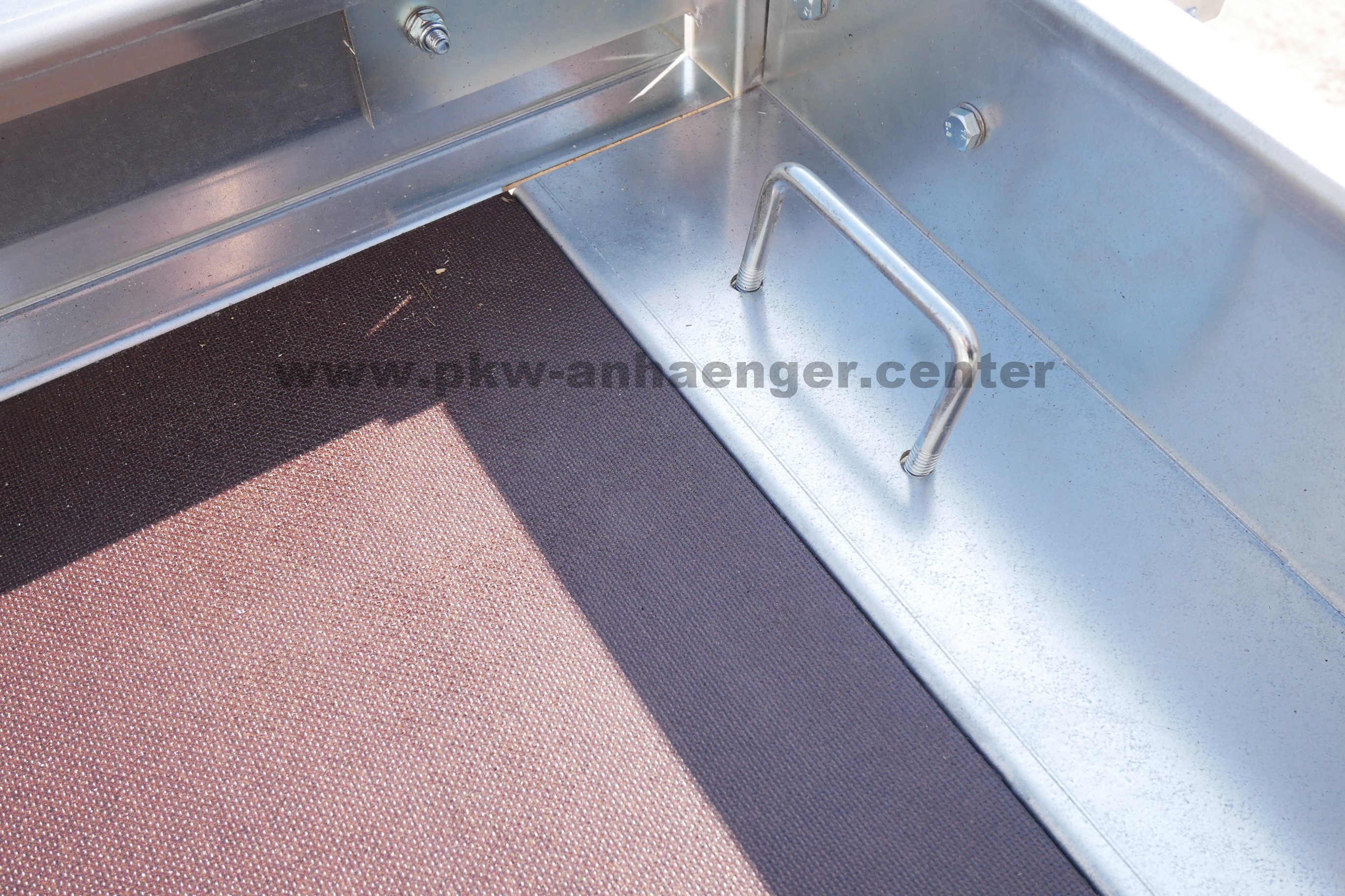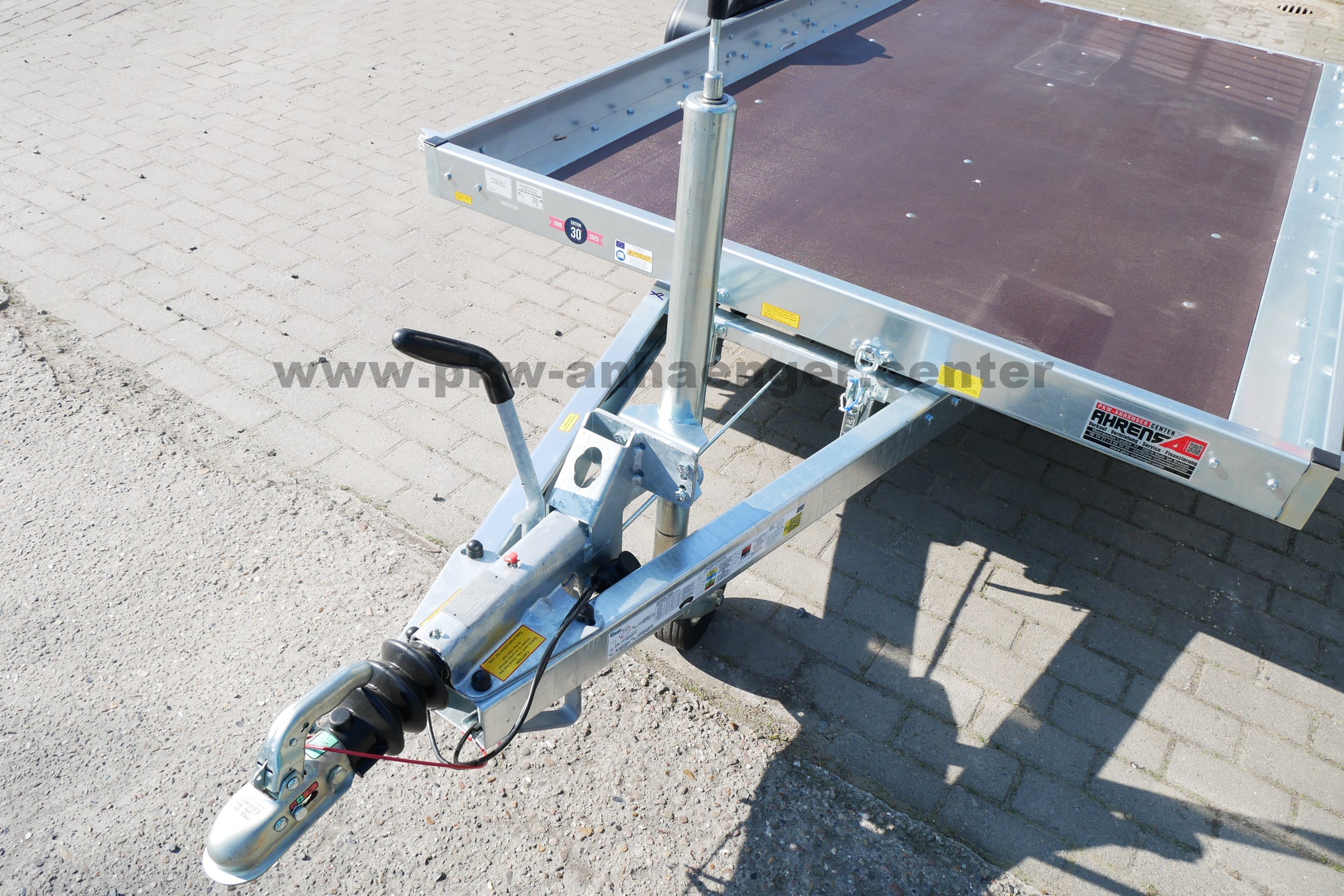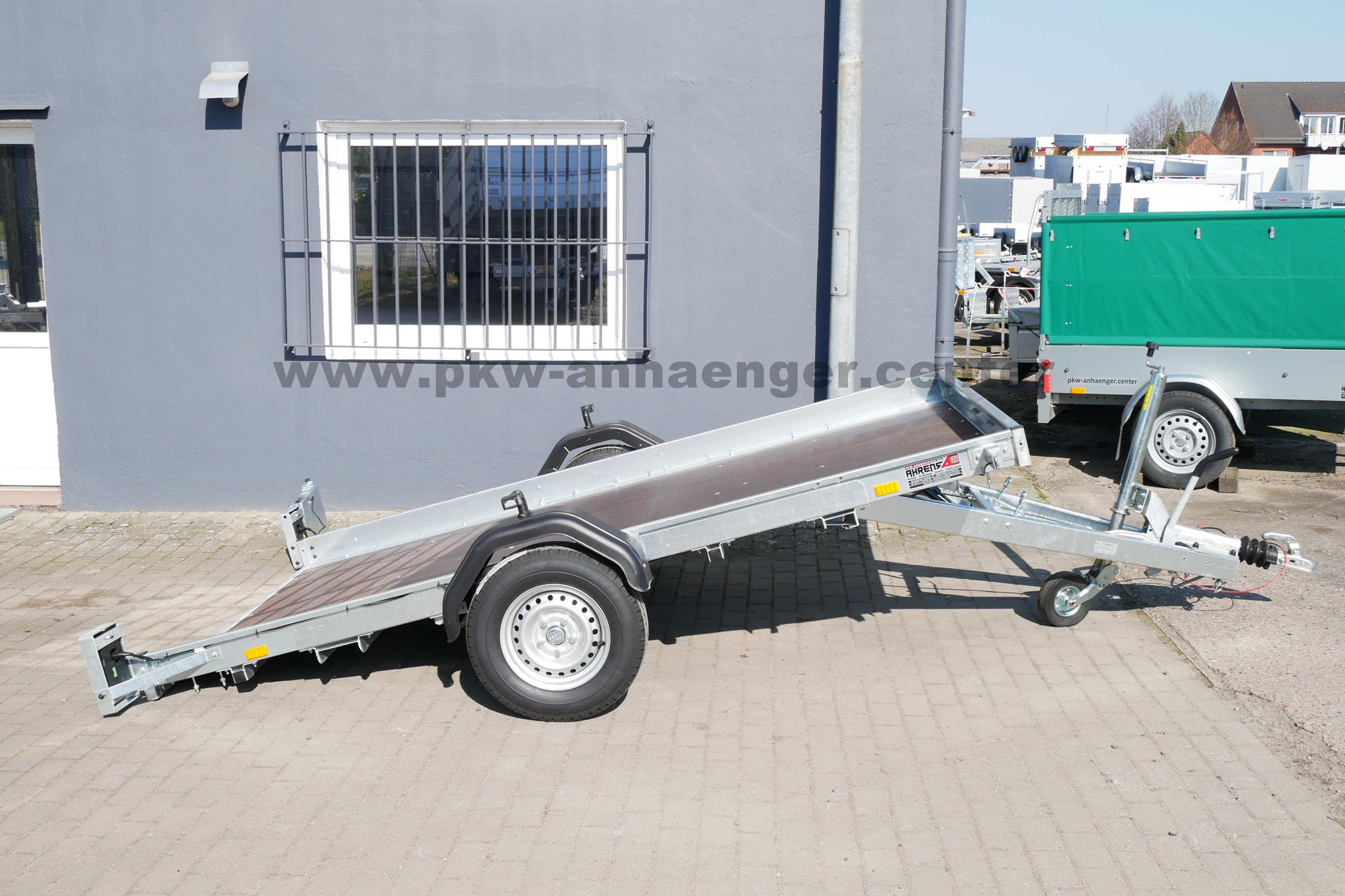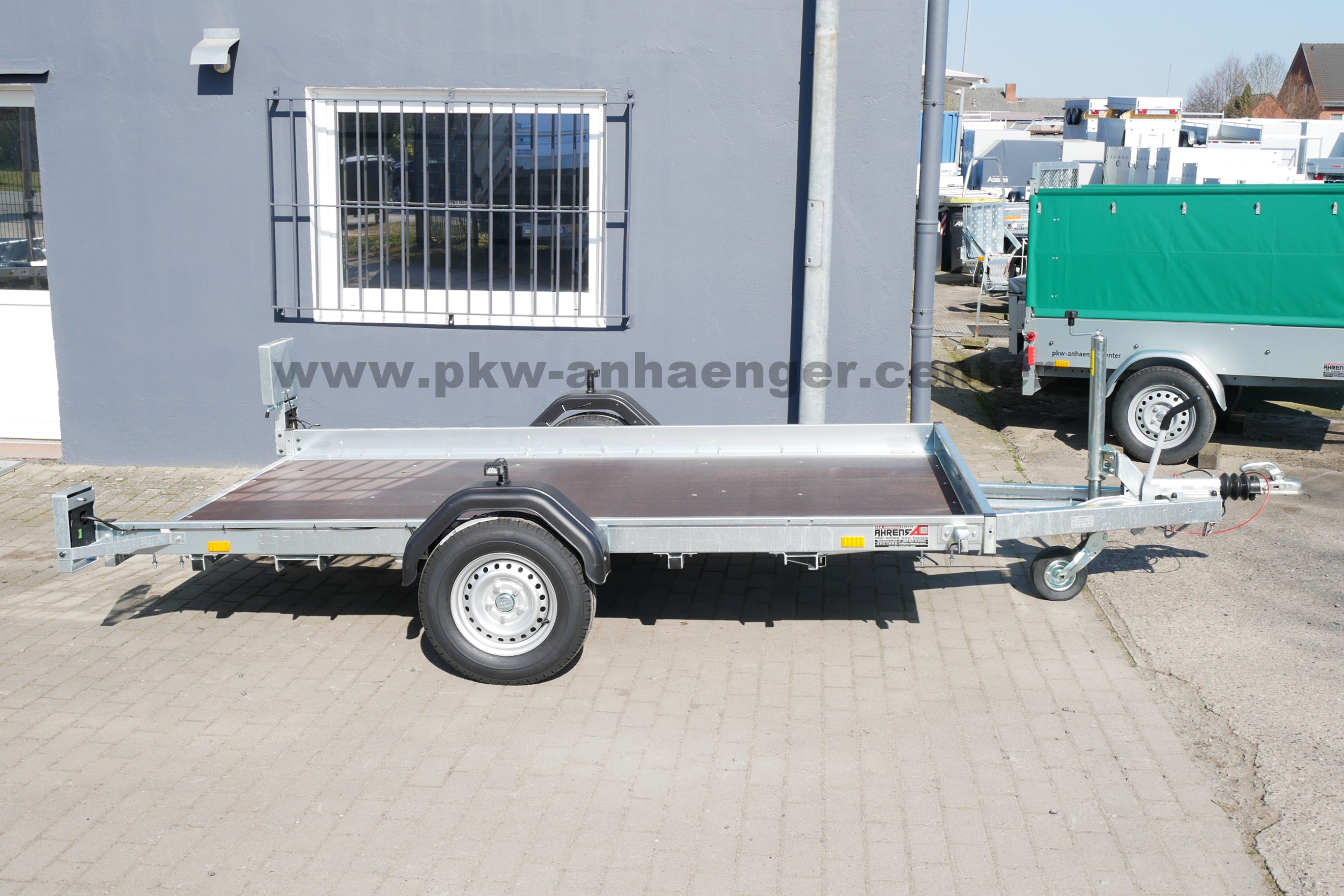 Ausgestattet ist der Pkwanhänger mit klappbarer Plattform, Holzboden, Zurrösen, Automatik-Stützrad, verzinktem Rahmen und einer V-Deichsel.