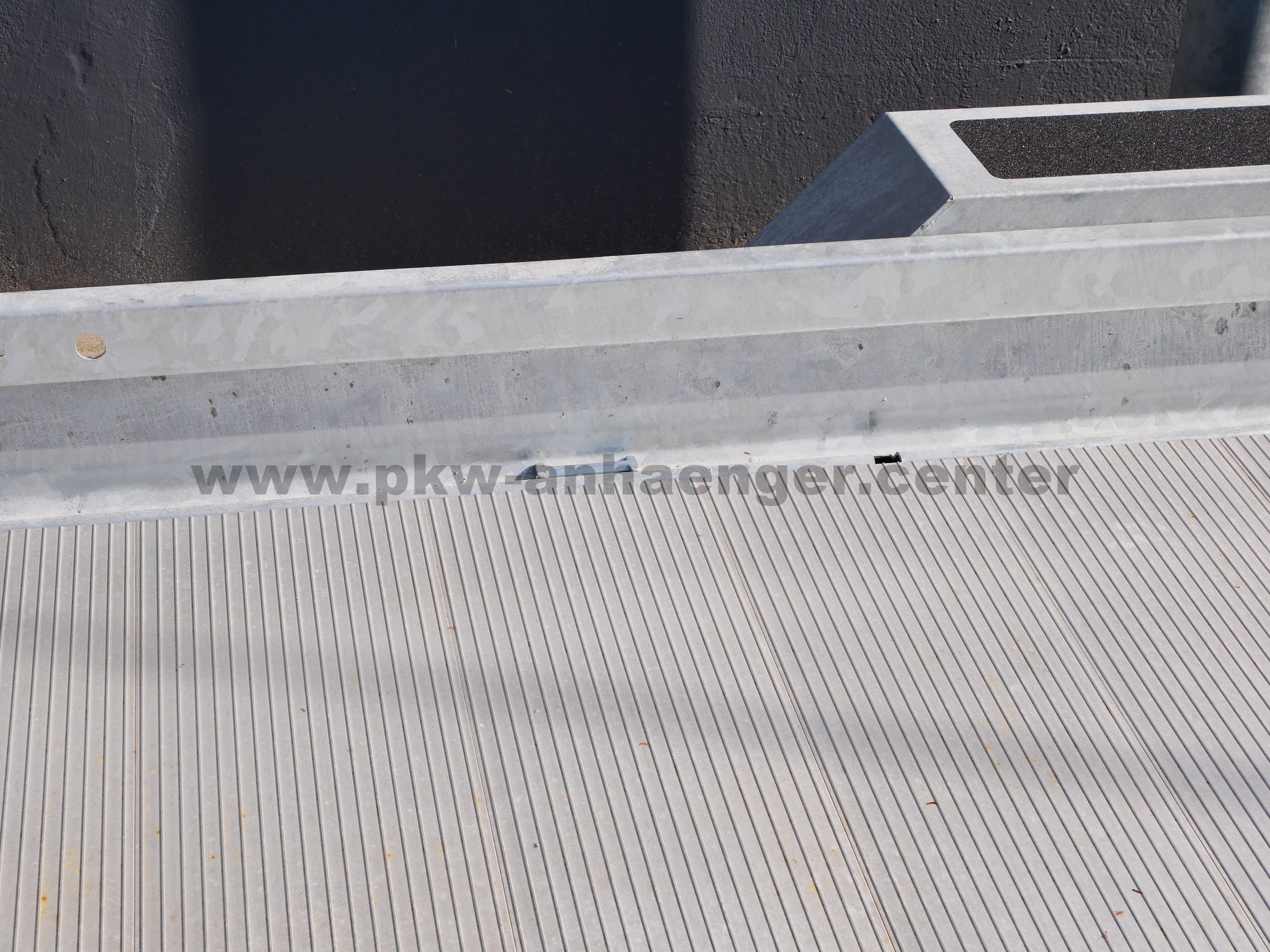 Ausgestattet ist der Maschinentransporter mit stabiler Gitterklappe, Aluboden, Parabelfederung, Automatikstützrad, begehbare Radkästen, extrem stabil geschweißter und Tauchbad feuerverzinkt Rahmen und V-Deichsel.