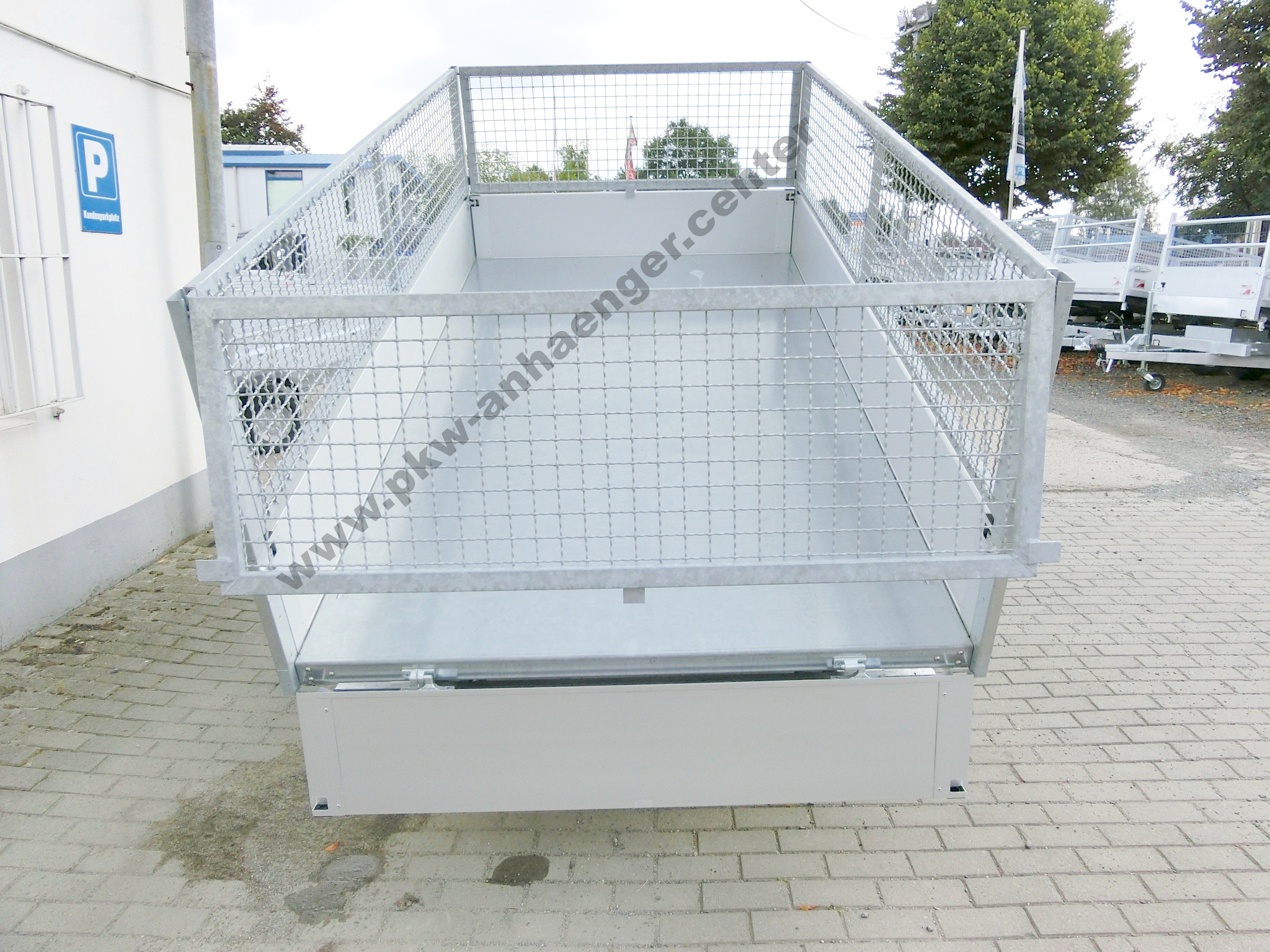 Mietanhänger Rückwärtskipper mit Wellgitteraufsatz 4seitig Unsinn 2600kg 276x150x85cm.