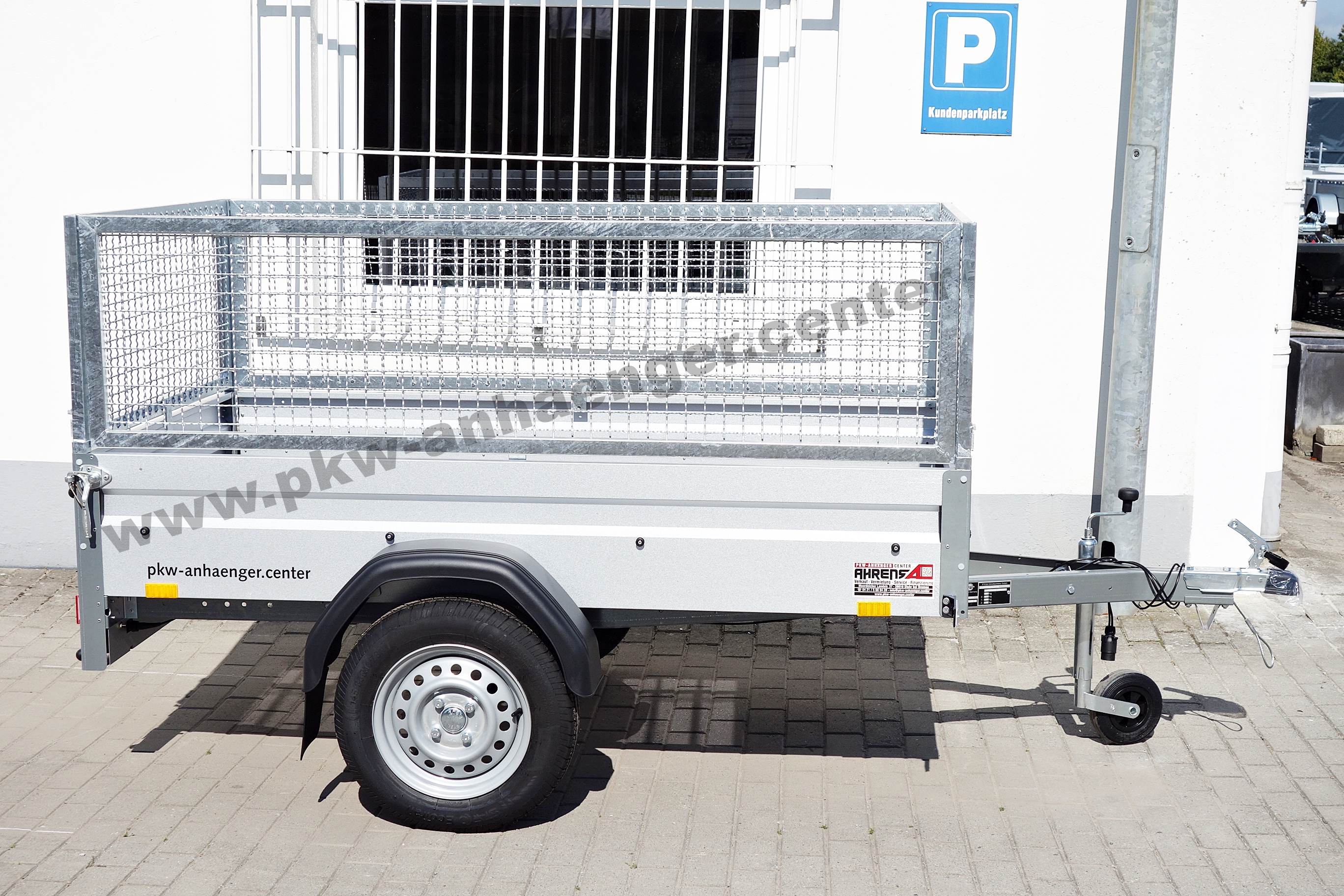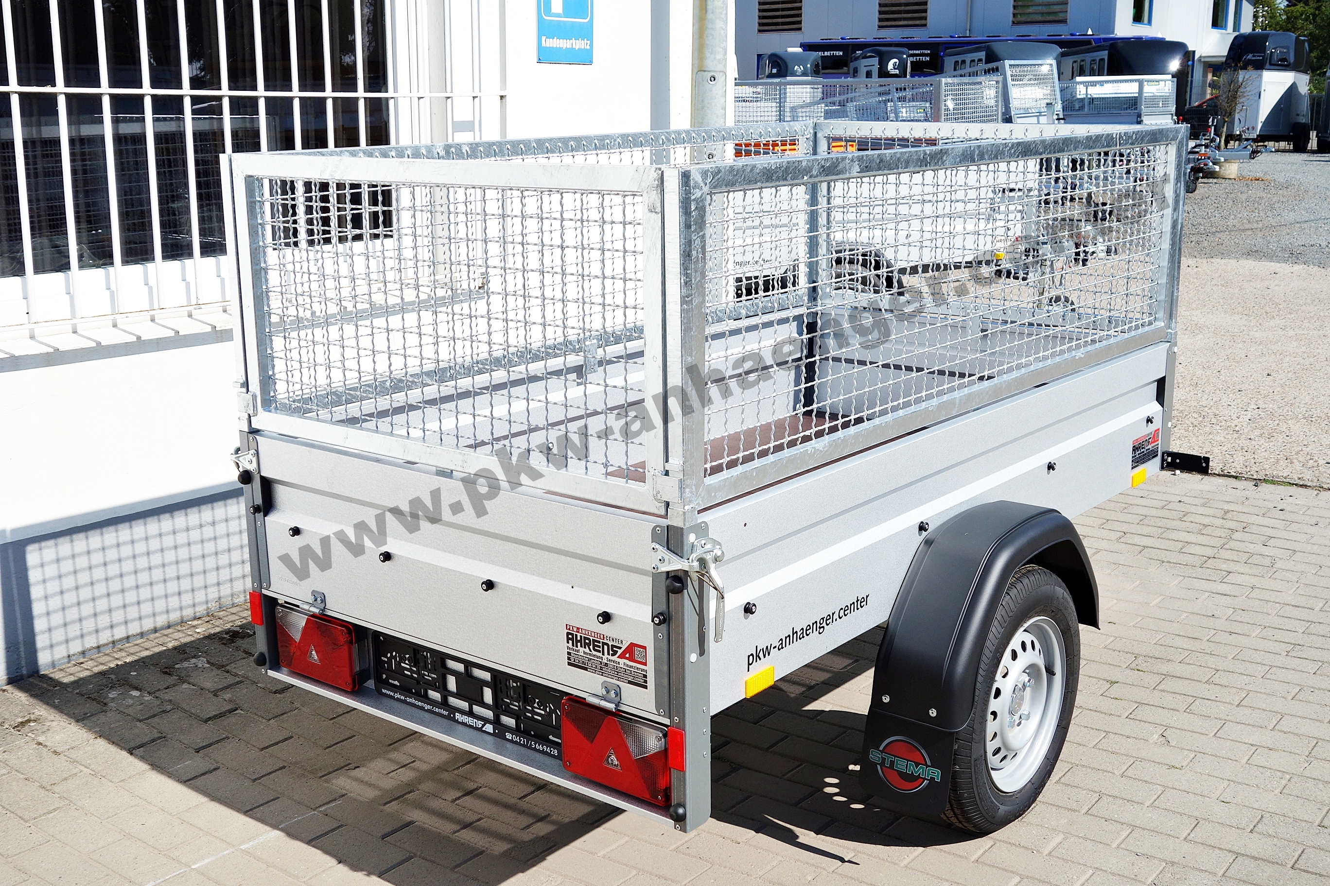 Kleiner gebremster PKW-Anhänger mit Aufsatz vom Anhängerhersteller STEMA.Der offene Kastenanhänger mit Gitteraufsatz ist ideal für die Entsorgung von Gartenabfällen oder Sperrmüll. Auch Brennholz oder Baumaterial lassen sich durch den Laubgitteraufsatz fachgerecht transportieren.Als Serienausstattung bietet der Stahlanhänger eine 100km/h Zulassung, Wellgitteraufsatz, Stützrad, vier Zurrösen, hochwertige Verschlüsse, galvalum verzinkte Bordwände und eine V-Deichsel.Dieses Anhängermodell gibt es auch in verschiedenen Varianten zum Beispiel als Deckelanhänger oder Planenanhänger.Pkwanhängerzubehör wie Bordwandaufsatz, Hochplane, Flachplane, Deichselbox, Netz und Heckstützen bieten wir auch günstig an.Technische Daten: