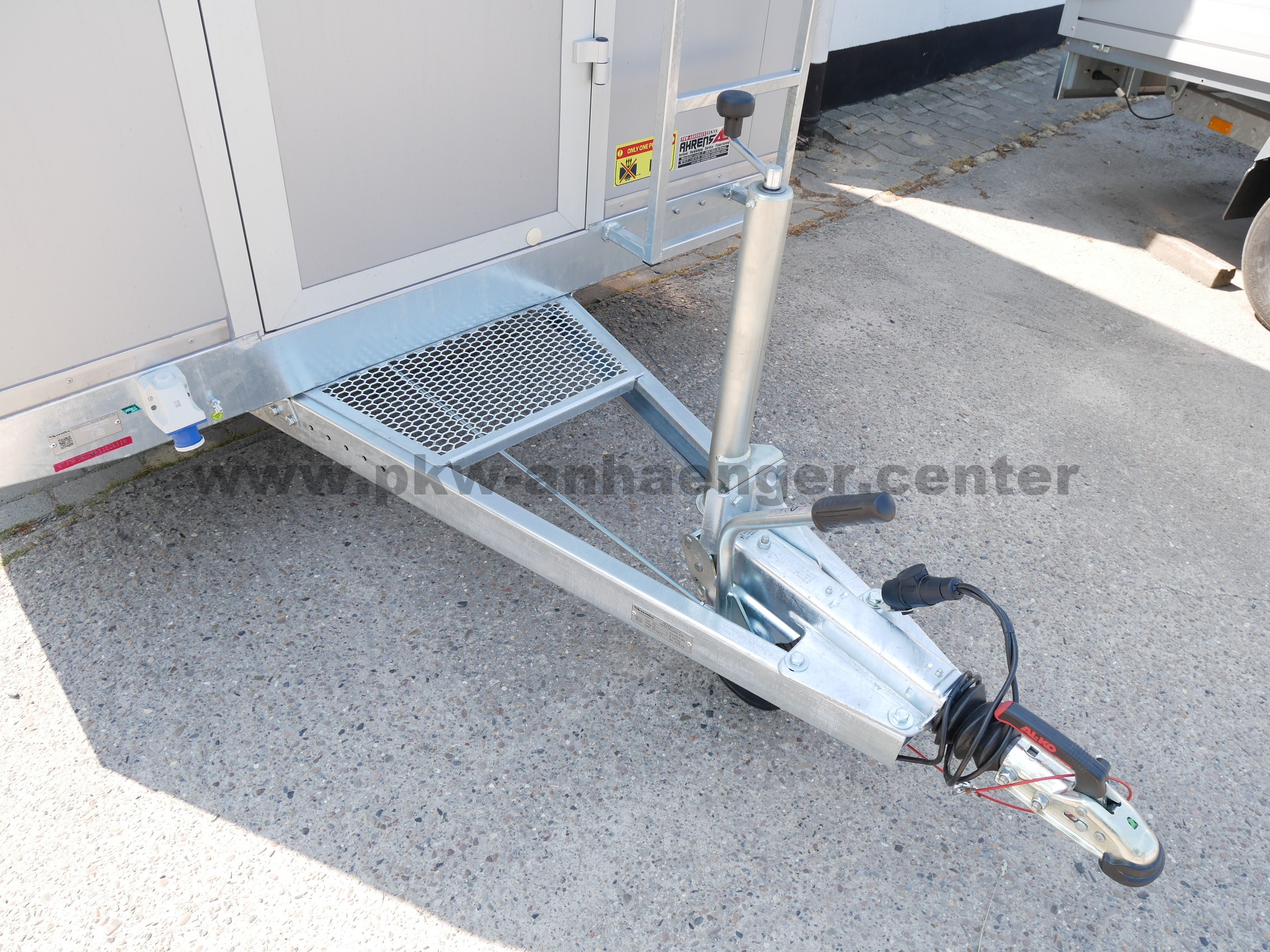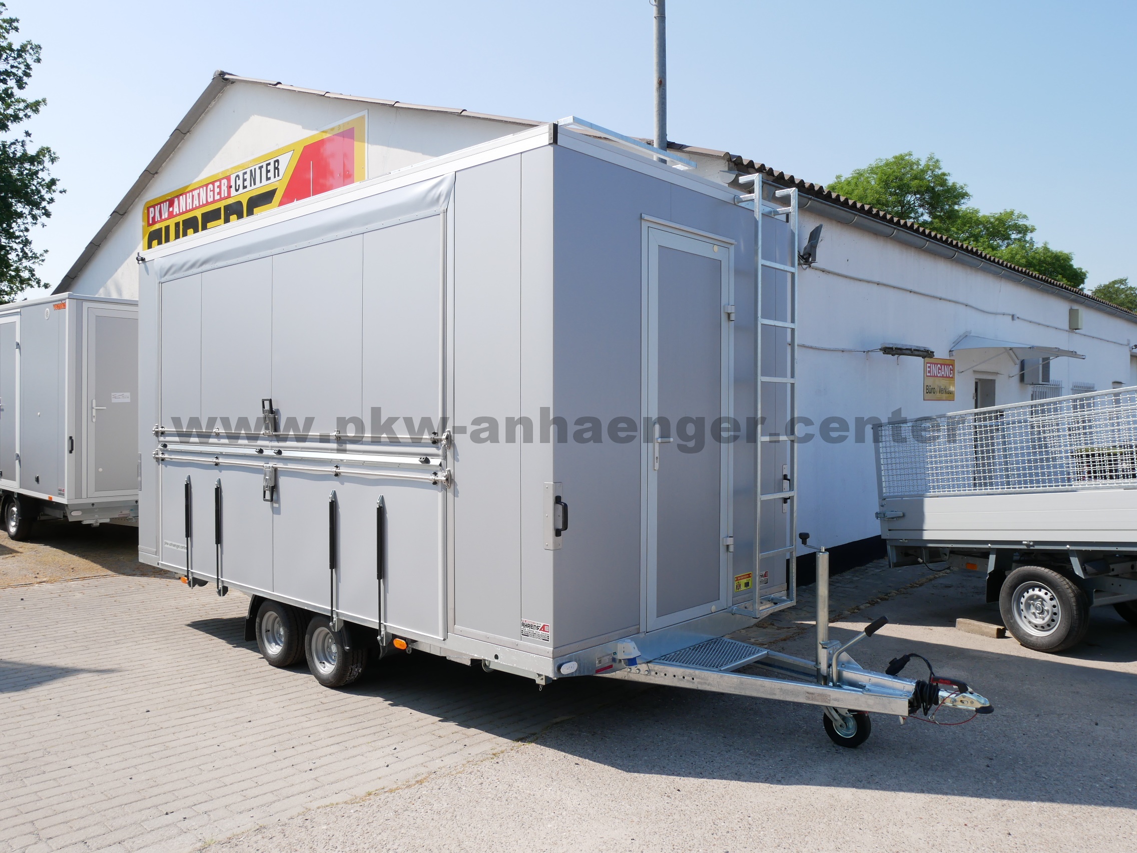 Einstiegstür mit Personenverschluß, Auftritt auf Deichsel, Treppe ausklappbar mit Hebehilfen circa 340x110cm, rausklappbare Handläufe, Verkaufsklappe mit Hebehilfen abschließbar circa 340x110cm, begehbares Dach (bis max. 70kg), Werbebanner ca. 450x80cm mit Hebehilfe aufstellbar für Ihre Außendarstellung, Leiter, vier stabile Kurbelstützen, Einspeisesteckdose außen für 230V, Verteilerkasten mit FI, neun Steckdosen, zwei Langfeldleuchten mit Schalter, Sandwichaufbau außen in silber innen weiß, stabiler geschweißter Rahmen und eine sehr stabile V-Deichsel feuerverzinkt.