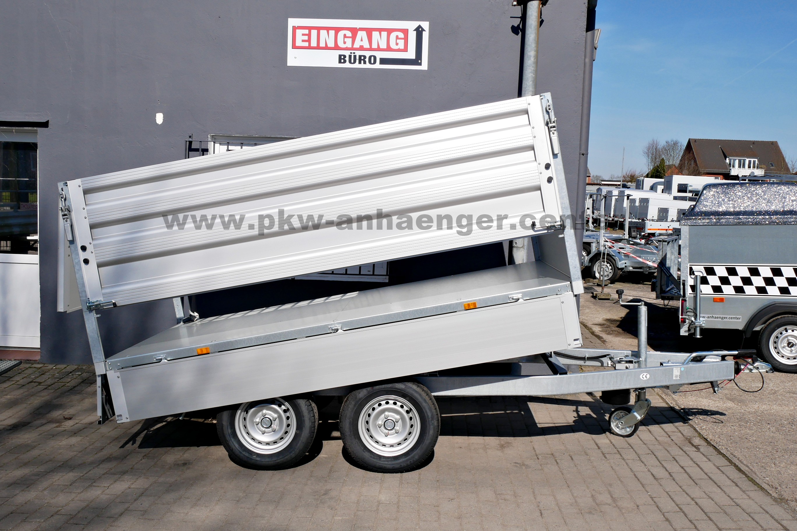 Ausgestattet ist der Pkwanhänger mit Bordwänden klapp- und abnehmbar, 75cm Alu-Bordwandaufsatz pendel-, klapp- und abnehmbar, Massivstahlboden, PUMPless-Hydraulik für Akkuschrauber, Automatik-Stützrad, Zurrösen, geschweißtem Tauchbad feuerverzinktem Rahmen und einer sehr stabilen V-Deichsel.