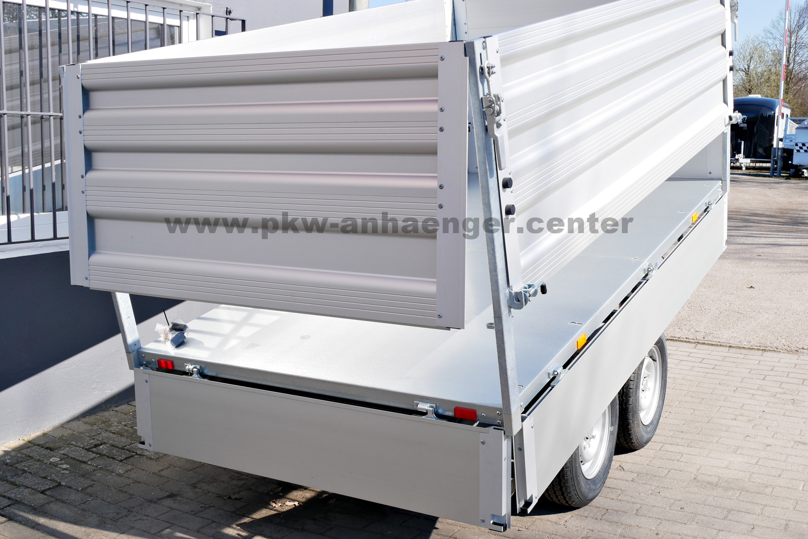 Ausgestattet ist der Pkwanhänger mit Bordwänden klapp- und abnehmbar, Bordwandsatz pendel-, runterklapp und abnehmbar, Massivstahlboden, E-Hydraulik, Automatik-Stützrad, Zurrösen, geschweißtem Tauchbad feuerverzinktem Rahmen und einer sehr stabilen V-Deichsel.