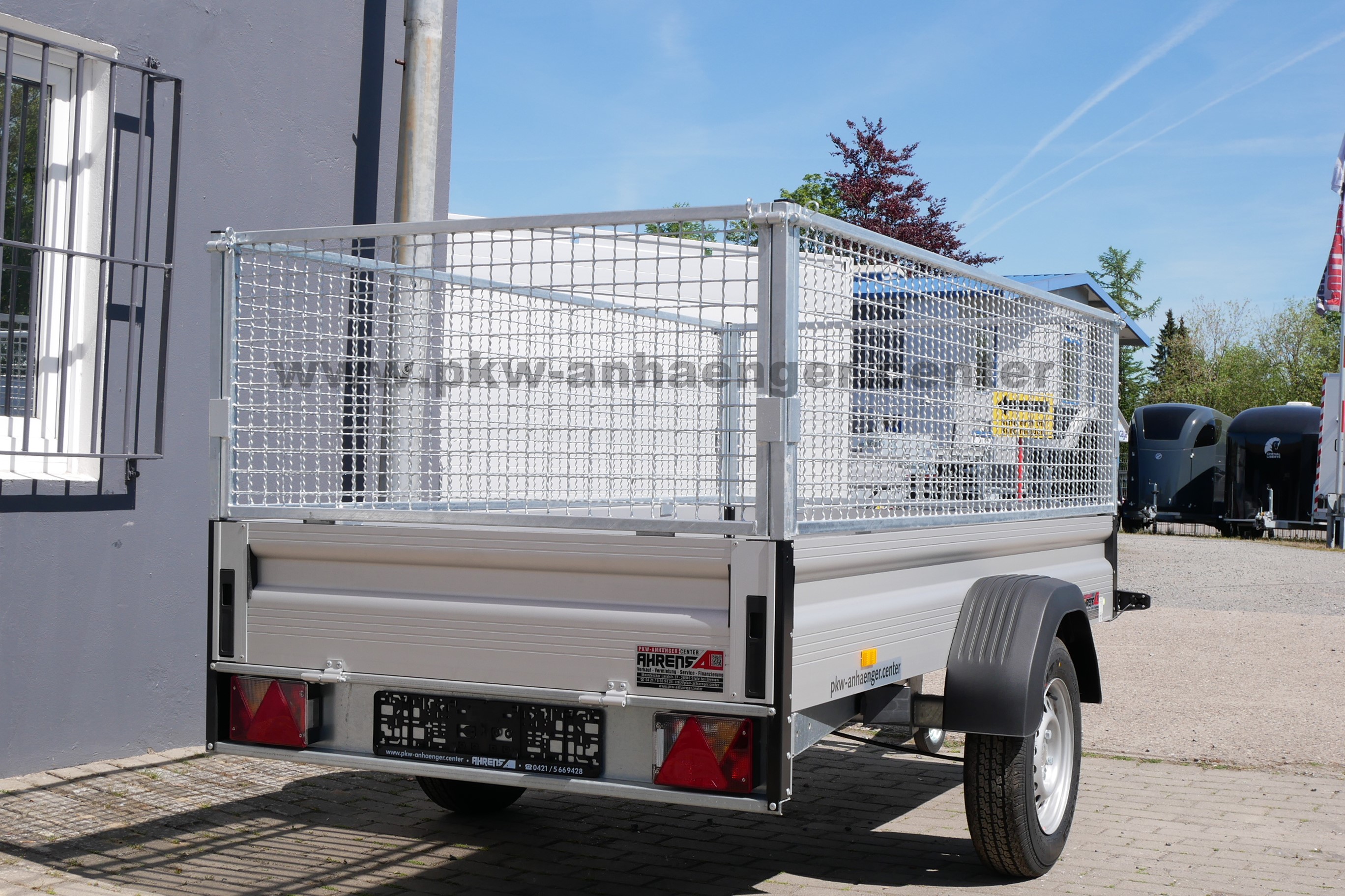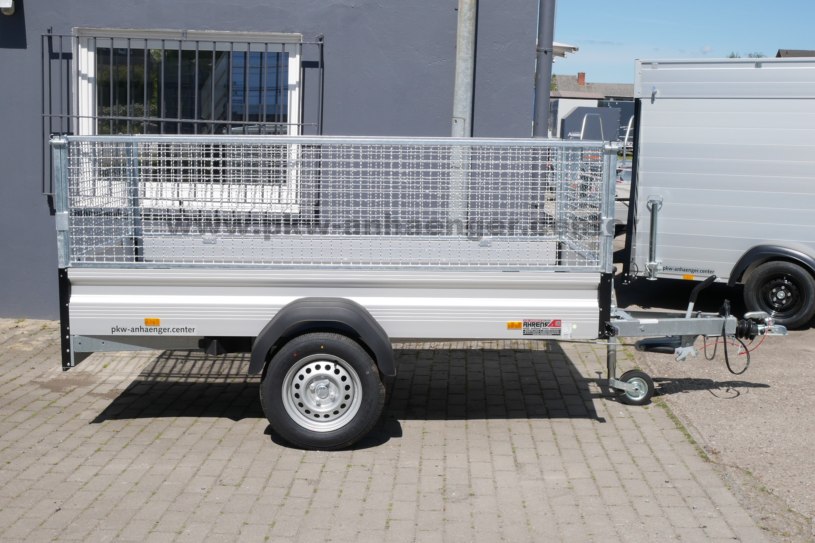 Ausgestattet ist dieser Pkwanhänger mit Stützrad, Wellgitteraufsatz abnehmbar, verstellbaren Zurrösen, Alubordwänden und einer V-Deichsel.