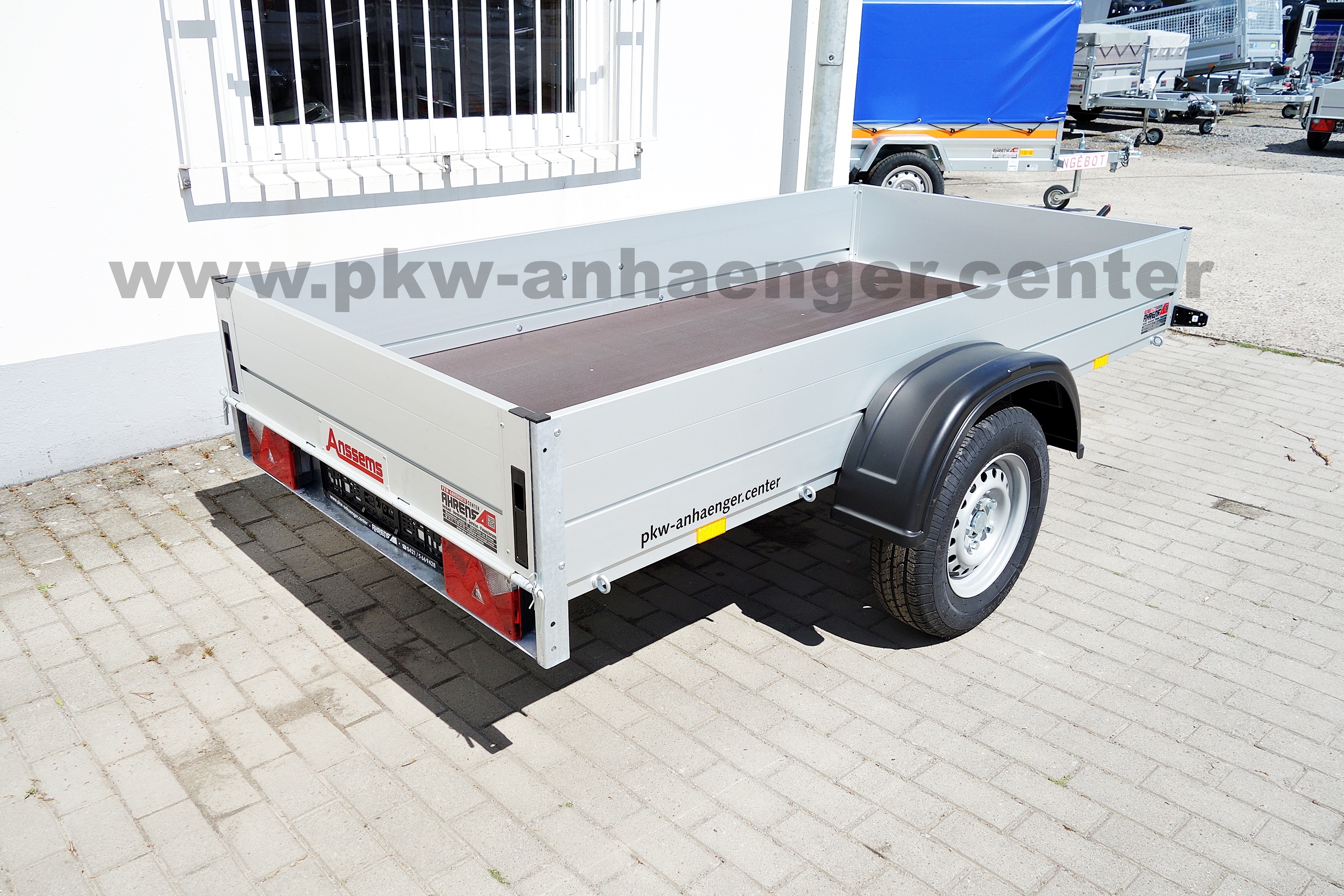 Als Serienausstattung hat der Anssems Kastenanhänger mit Bremse Alubordwände, Planenaufbau, innenliegende Verschlüsse, Zurrösen aussen, Profilkanäle zum Anbau für Zubehör oder Ladungssicherung, Stützrad und eine V-Deichsel.