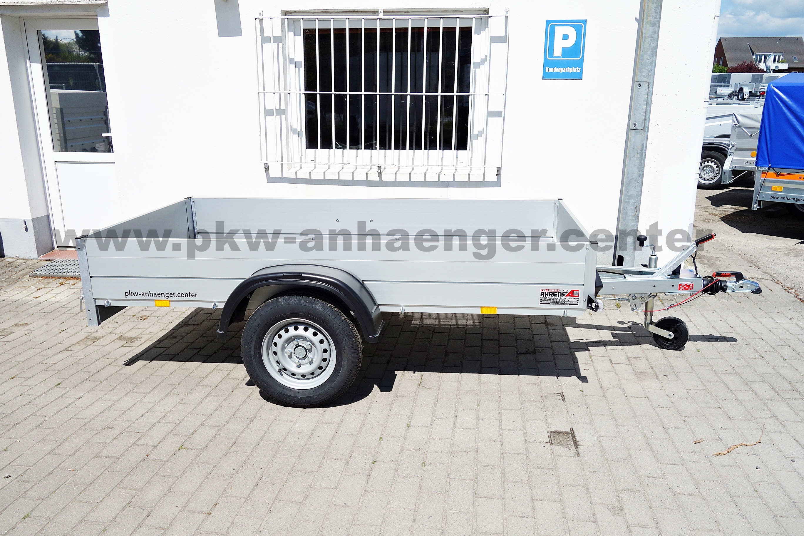 Ausstattung Planen & Gestell: | Ahrens-Spriegelgestell Alu, nicht zerlegbar, abnehmbar, Flachdach, Kst-Drehverschlüsse unten, LKW Plane 680g/m², Längsriemenverschluß an den 4 Ecken, MONTIERT auf Anhänger, Planenfarbe: grau, Wasserablauf im Dach |