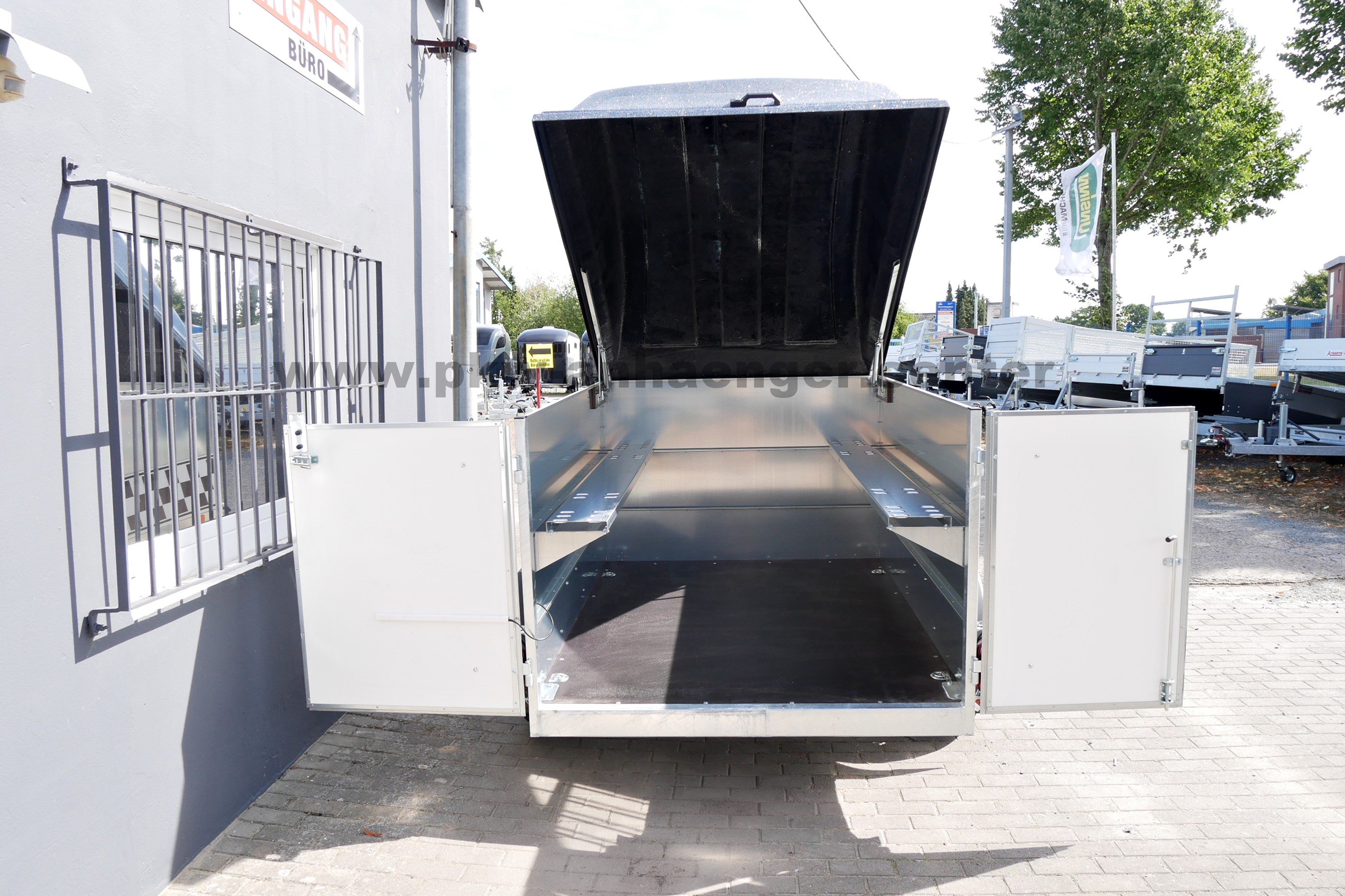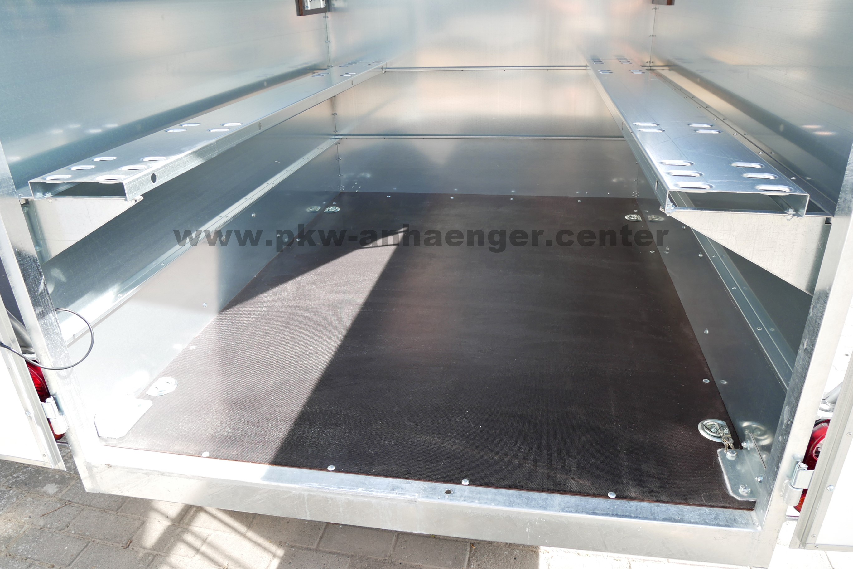Serienausstattung des Kart-Deckelanhänger ist eine Wandhalterung für das zweite Kart, Deckel abschließbar, zweiflügelige Tür hinten, Bugrad, stabiler Rahmen verzinkt und eine stabile V-Deichsel.