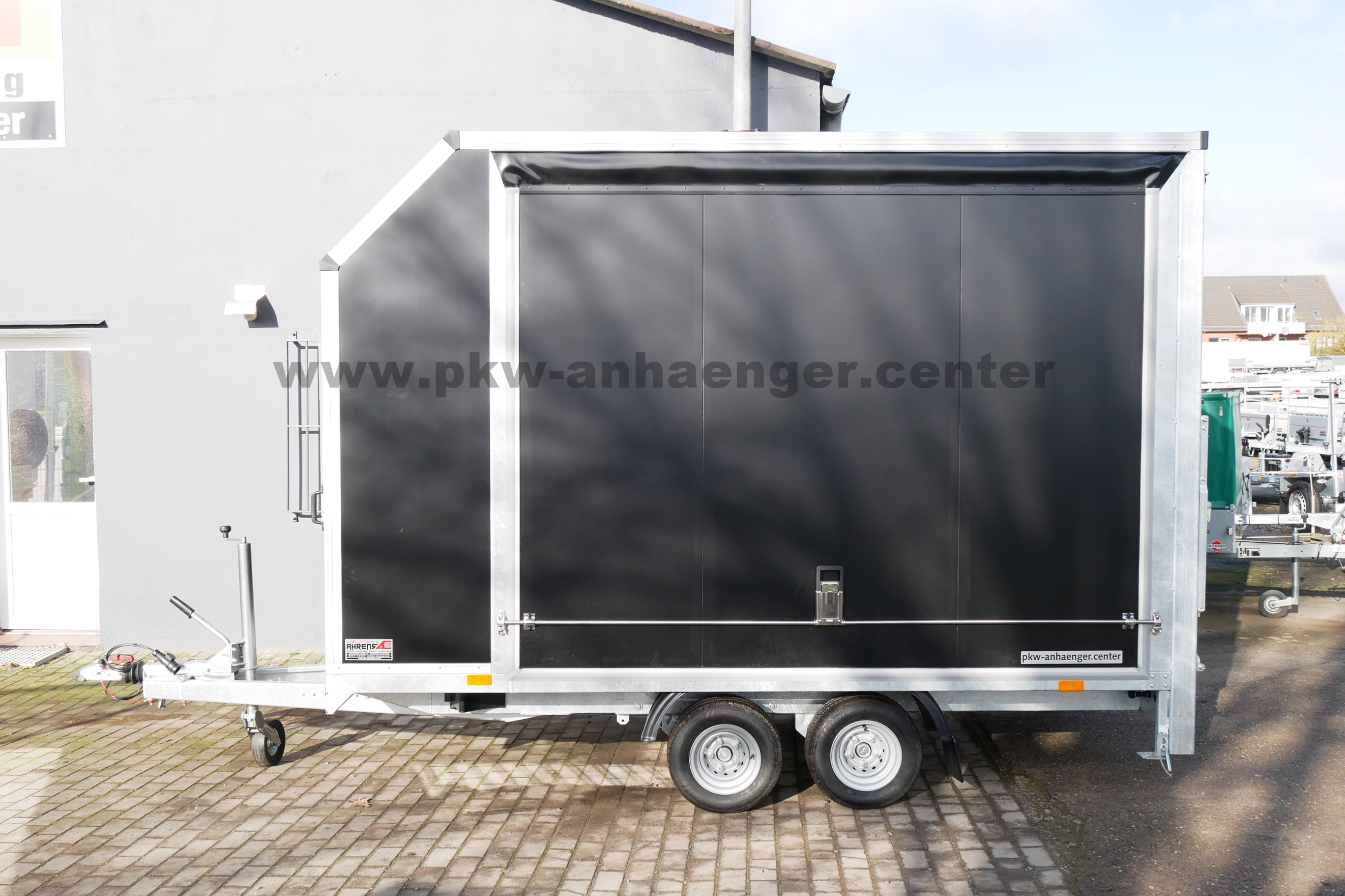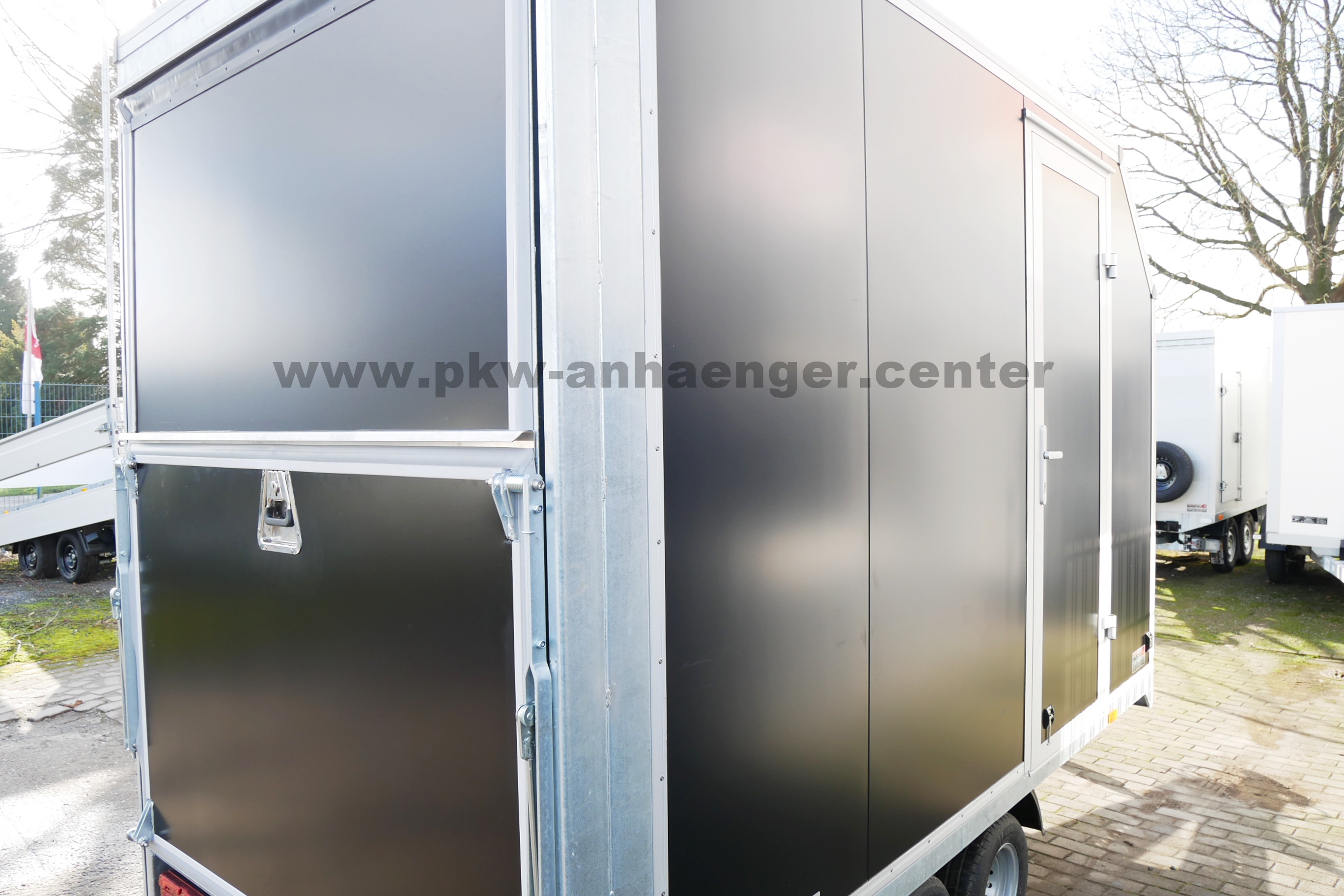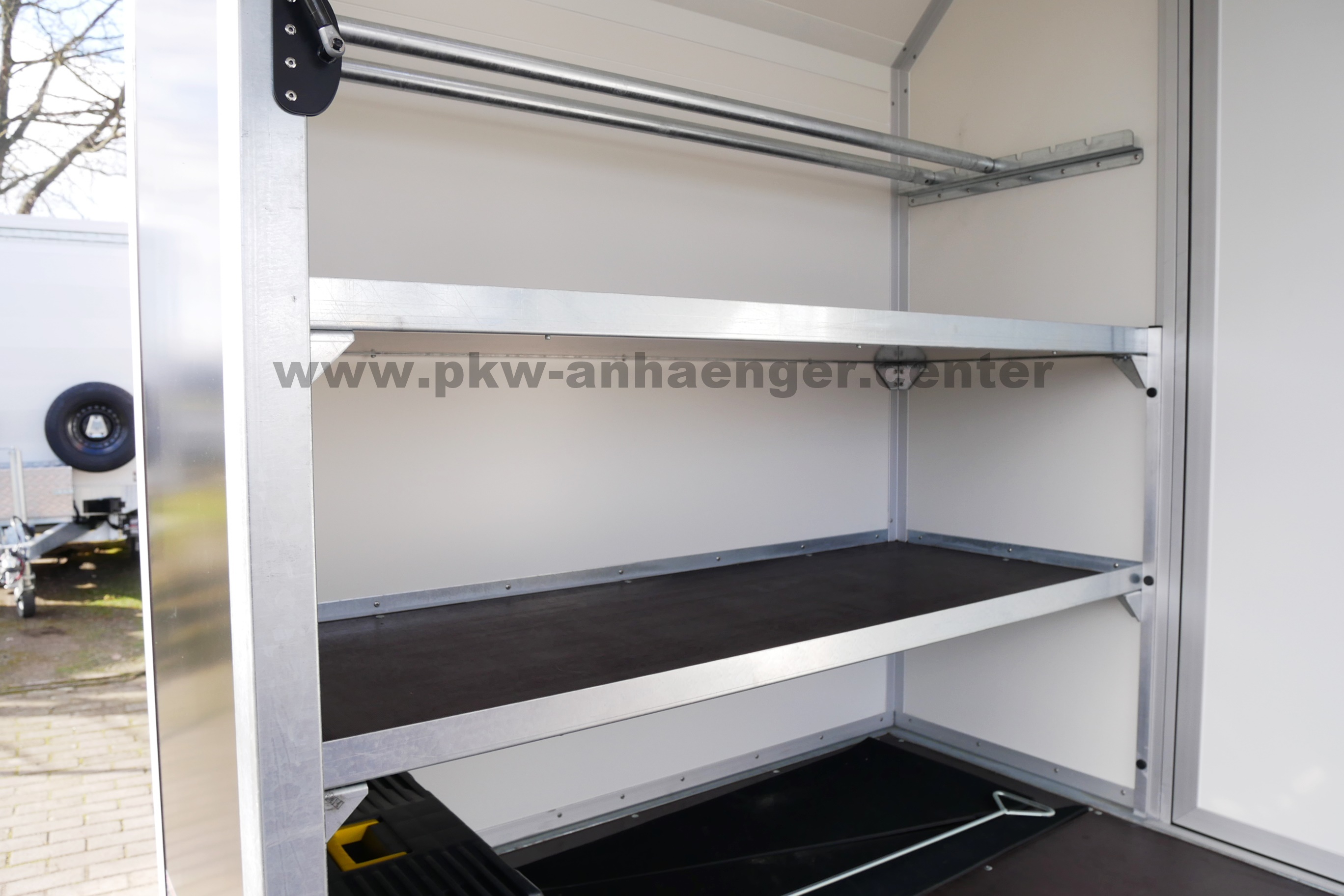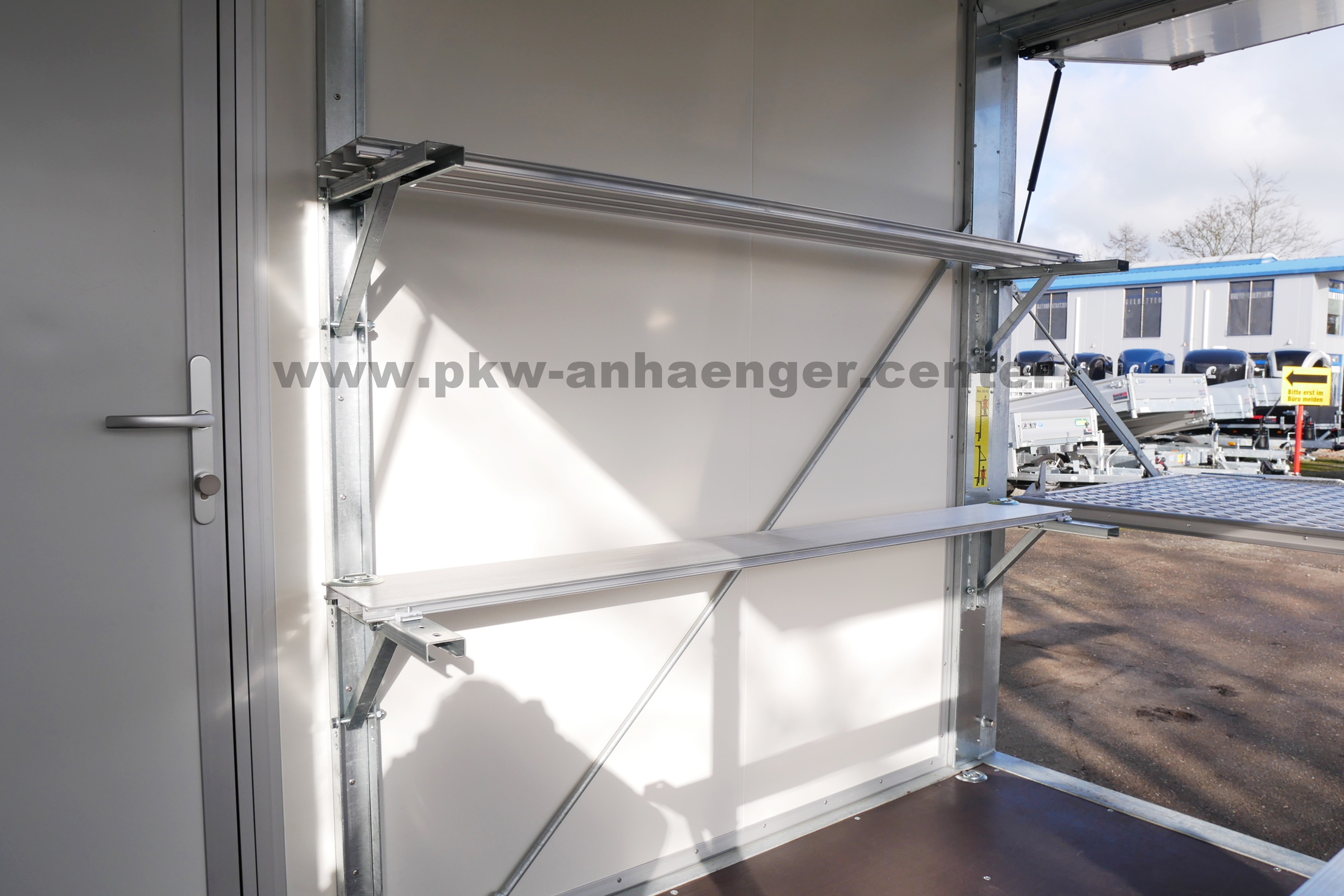 Serienausstattung des Karthänger ist 2x Wandhalterung, sietliche Klappe zum öffnen, Seitentür rechts, Hebebühne mit elektrischem Antrieb, Heckstützen, Reifenregal vorne, Windschräge, LED-Beleuchtung (kann an machen PKW evtl. nicht funktionieren), Bugrad, stabiler Rahmen verzinkt und eine stabile Rohrdeichsel.