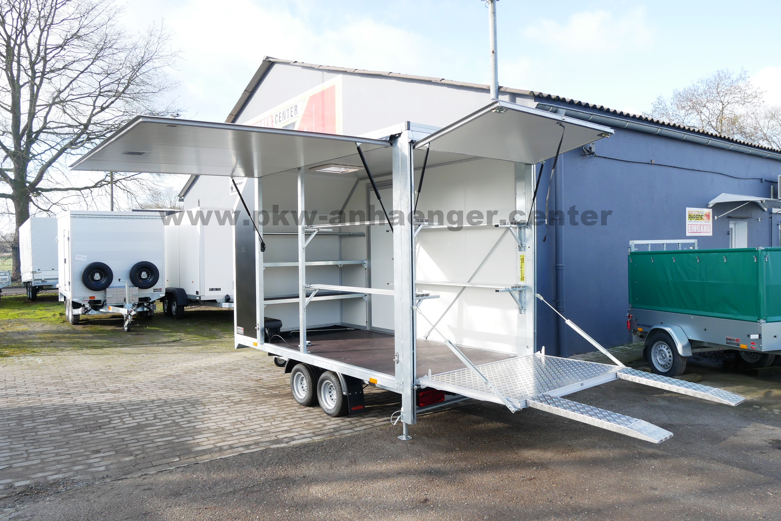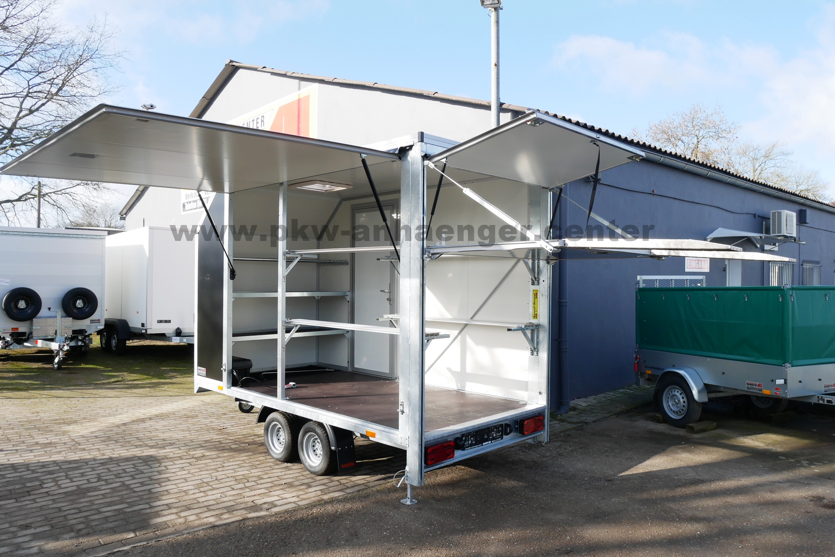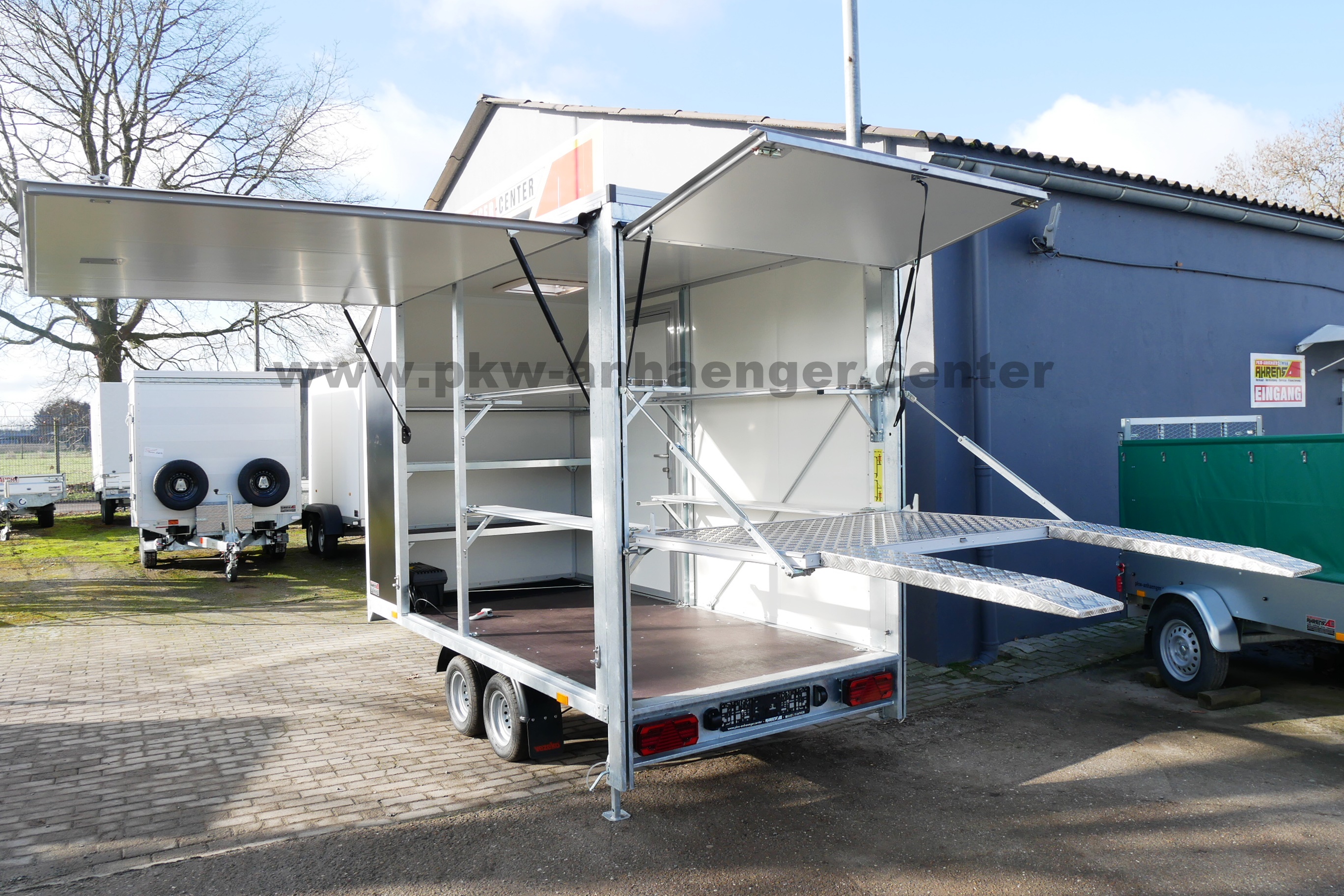 Mit diesem Kofferanhänger lassen sich 3 Karts leicht Verladen. Ein Kart steht auf dem Boden die 2 weiteren auf Halterung an den Wänden. Eingeladen werden Sie mittel elektrischer Hebebühne am Heck.