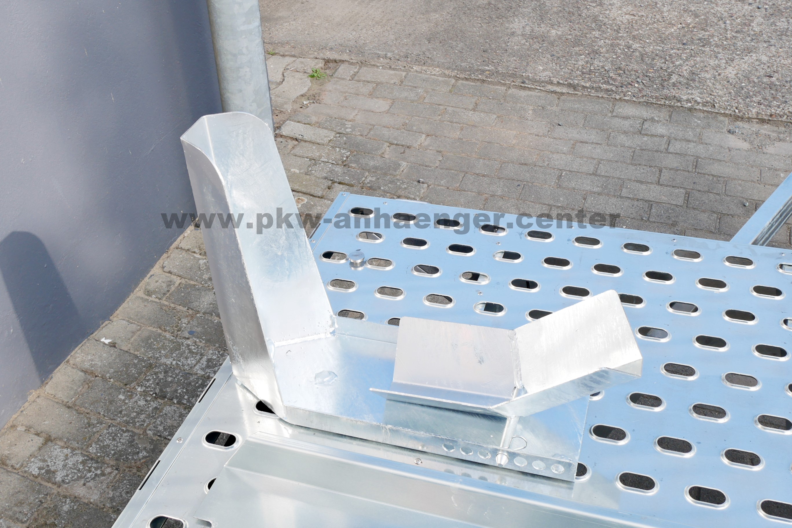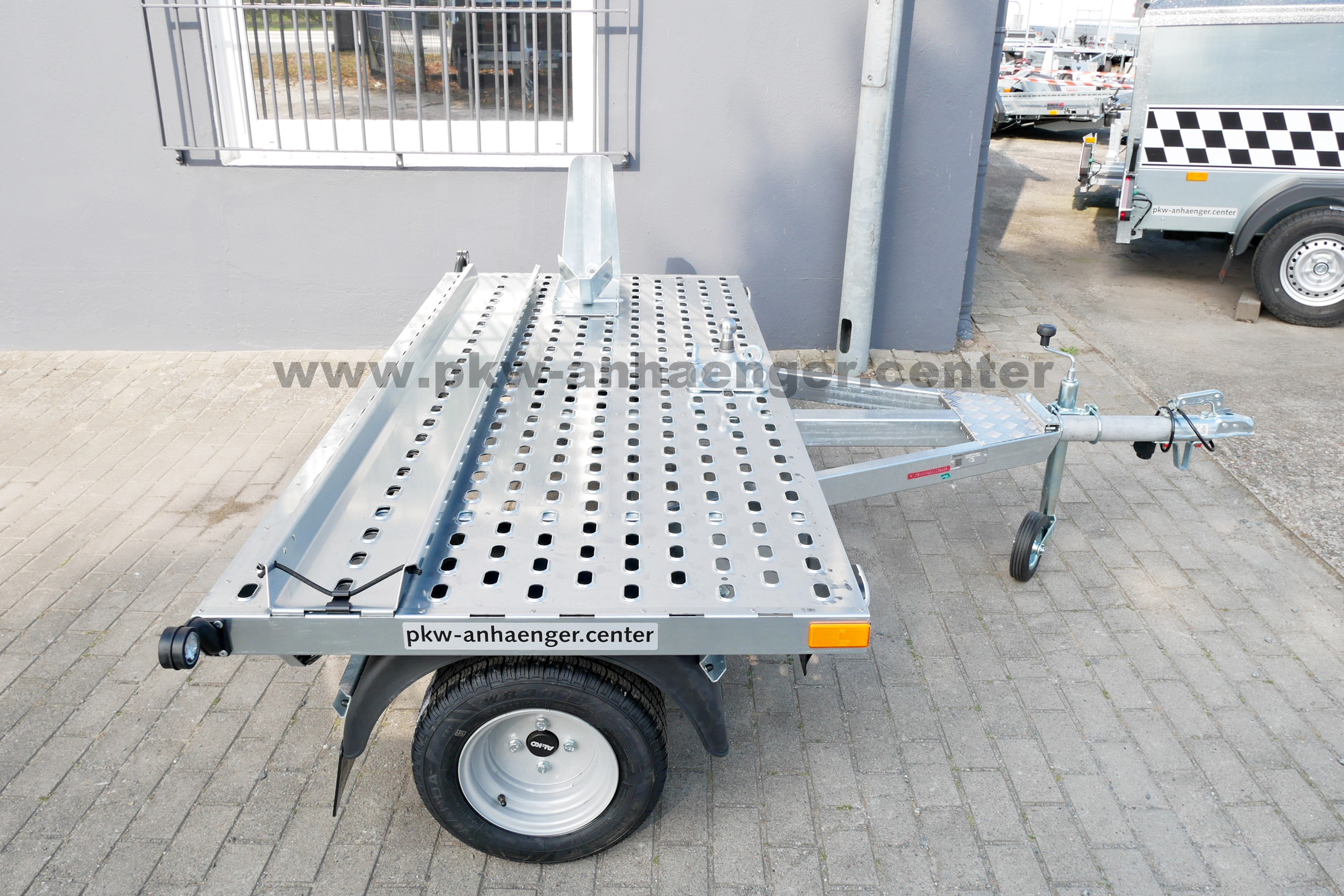 DieSerienausstattung des Motorradtransporter sind eine Motorradwippe verstellbar, Lochprofilboden dadurch Antirutsch und Zurrmöglichkeit, Auffahrschiene, Kupplung für einen Fahrradträger, Stützrad, stabiler geschweißter Rahmen Tauchbad feuerverzinkt und eine sehr stabile V-Deichsel.