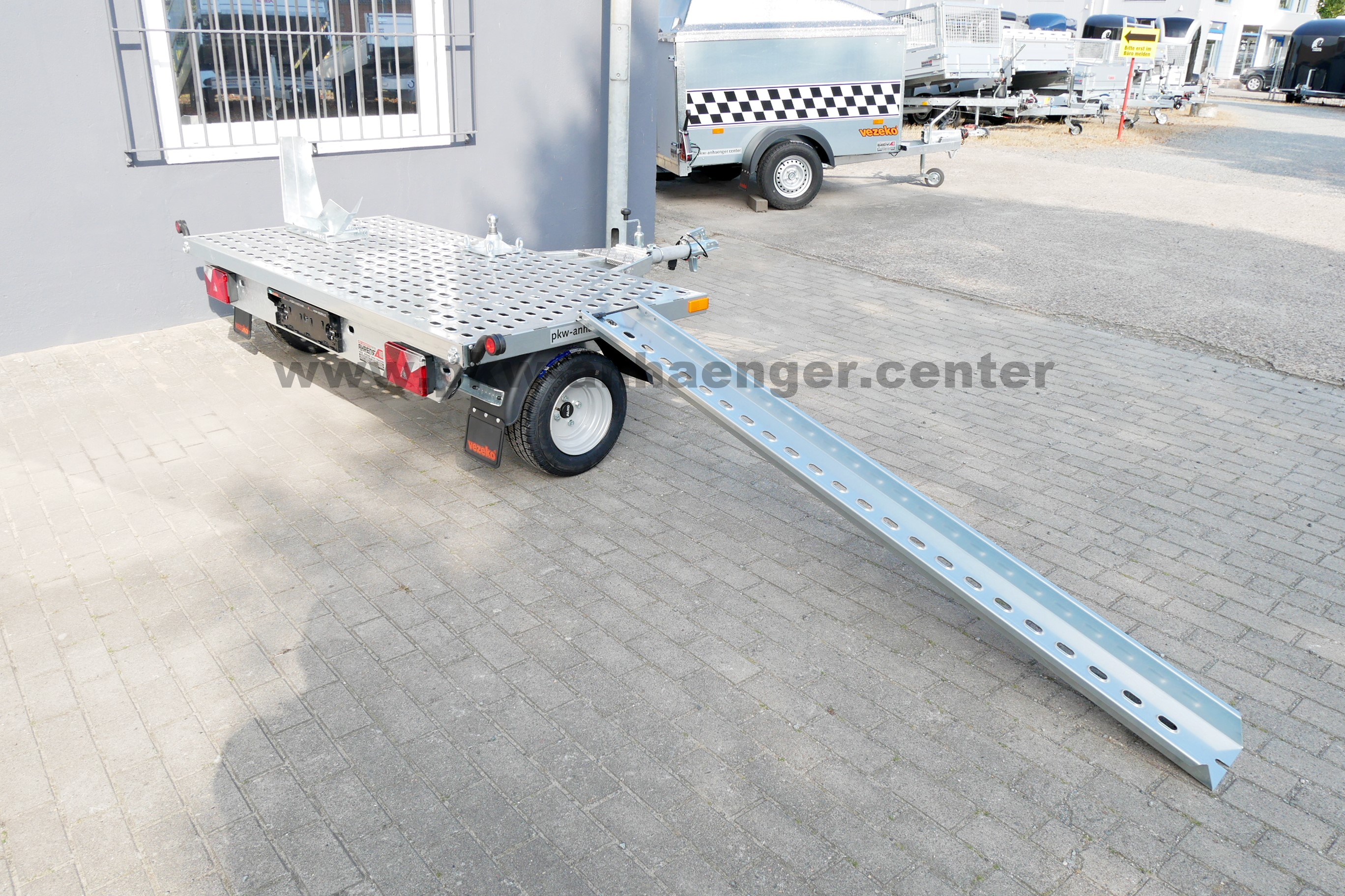 ausziehbar. Auf dem Auzug kann man zwei optionale klassische Fahrradträger befestigen wie für Dachgepäckträger.Die Serienausstattung des Motorradtransporter oder Fahrradtransportanhänger sind Zurrösen, Rollerhalter oder auch Motorradhalter, Auffahrschiene, Haltearm zur Lenkersicherung, rausziehbare Leuchtenleiste, Grundhalter für optionale Fahrradträger, Aluboden, Haltebügel vorne für Zubehör, Stützrad mit Bremse, stabiler Rahmen Tauchbad feuerverzinkt und eine sehr stabile V-Deichsel.Als Zubehör haben wir eine 100km/h, Motorradzurrgurte, Zurrgurte, Diebstahlsicherung und vieles Mehr.