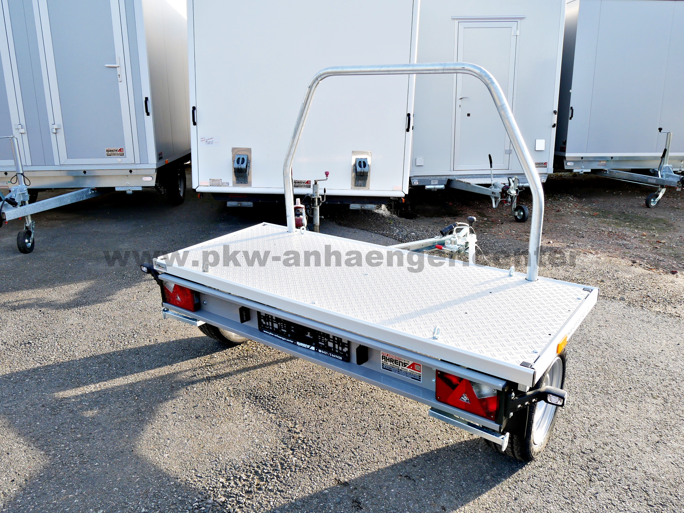Genialer und platzsparender Anhänger ideal hinter einem Wohnmobil. Der Anhänger zum Transport für Motorrad, Roller, Twizy oder Fahrräder Modell Wheely-Duo-gebremst.Für 1 bis 8 Fahrräder, 2x Roller oder Motorrad und zusätzlich 2 - 4 Fahrräder mit stabilen Rahmen und viele Zurrmöglichkeiten für jeden Urlaub geeignet.Die Motorräder oder Roller lassen sich seitlich direkt auf den PKW Anhänger Schieben. Auch ein Renault Twizy passt auf die Plattform. Zwei optionale Bügel und Zurrösen sichern den Roller oder das Motorrad welches man mit einer Auffahrschiene auf die Plattform des Rolleranhänger schiebt. Außerdem kann man vorne dann noch einen optionalen Halter für zwei Fahrräder über der Deichsel montieren.Vier Fahrräder haben auf der Ladefläche als Fahrradanhänger platz mit dem optionalen 4er Fahrradsatz. Auch hier kann man den Halter über der Deichsel montieren um weiteren Platz für zwei zusätzliche Räder zu gewinnen oder den Leuchtenträger ausziehbar machen für nochmal 2 Fahrräder.Die Serienausstattung des gebremsten Motorradtransporter oder Fahrradtransportanhänger sind Zurrösen, Aluboden, zwei Stützen, Haltebügel vorne für Zubehör, Stützrad mit Bremse, Steckschloß und Safety-Ball, 100km/h, stabiler Rahmen Tauchbad feuerverzinkt und eine sehr stabile V-Deichsel.Als Zubehör haben wir eine Werkzeugbox, Transportbox, Roller-Befestigungspaket mit Auffahrschiene, Zurrgurte, 4er Fahrradhalterung und 2er Fahrradhalterung über der Deichsel, ausziehbare Leuchtenleiste, Fahrradträger für Leuchtenleiste, Bordwandsatz und vieles Mehr.Technische Daten: