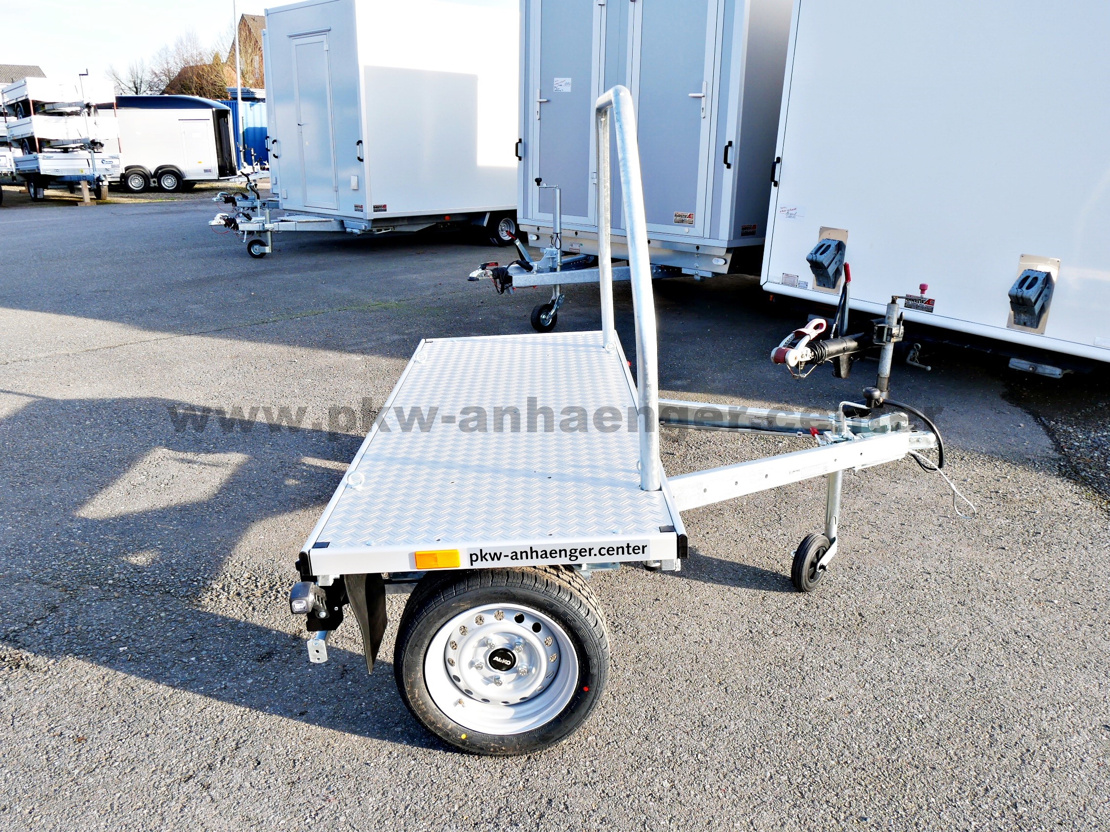 Genialer und platzsparender Anhänger ideal hinter einem Wohnmobil. Der Anhänger zum Transport für Motorrad, Roller oder Fahrräder Modell TRAIGO 500.Für 1 bis 6 Fahrräder, 1x Roller oder kleines Motorrad und zusätzlich 2 Fahrräder mit stabilen Rahmen und viele Zurrmöglichkeiten für jeden Urlaub geeignet.Das Motorrad oder der Roller lassen sich seitlich direkt auf den PKW Anhänger Schieben. Zwei optionale Bügel und ausreichend verstellbare Zurrösen sichern den Roller oder das Motorrad welches man mit einer Auffahrschiene auf die Plattform des Rolleranhänger schiebt. Außerdem kann man vorne dann noch einen optionalen Halter für zwei Fahrräder über der Deichsel montieren.Vier Fahrräder haben auf der Ladefläche als Fahrradanhänger platz mit dem optionalen 4er Fahrradsatz. Auch hier kann man den Halter über der Deichsel montieren um weiteren Platz für zwei zusätzliche Räder zu gewinnen.Die Serienausstattung des Motorradtransporter oder Fahrradtransportanhänger sind verstellbare Zurrösen, Aluprofilboden, Stütze, Haltebügel vorne für Zubehör, Stützrad mit Bremse, Steckschloß und Safety-Ball, stabiler Rahmen Tauchbad feuerverzinkt und eine sehr stabile V-Deichsel.Als Zubehör haben wir eine Werkzeugbox, 100km/h, Roller-Befestigungspaket mit Auffahrschiene, Zurrgurte, 4er Fahrradhalterung und 2er Fahrradhalterung über der Deichsel.Technische Daten: