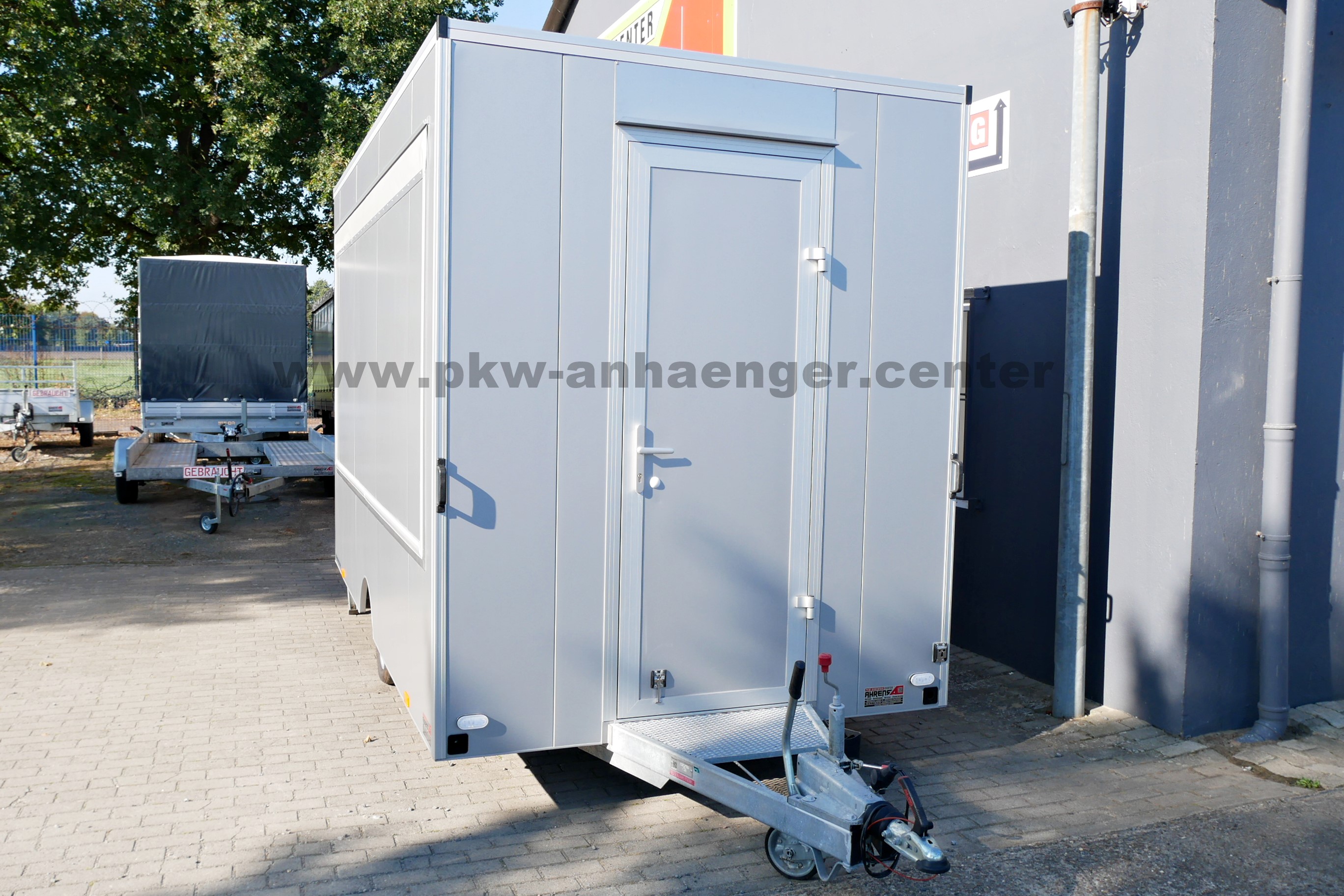 Einstiegstür, Personenverschluß, Tritt auf Deichsel, Verkaufsklappe rechts von innen verriegelbar mit Hebehilfen, vier stabile Kurbelstützen, Sandwichaufbau 30mm außen in silber innen weiß, Rangiergriffe, Stützrad, stabiler geschweißter Rahmen und eine sehr stabile V-Deichsel feuerverzinkt.
