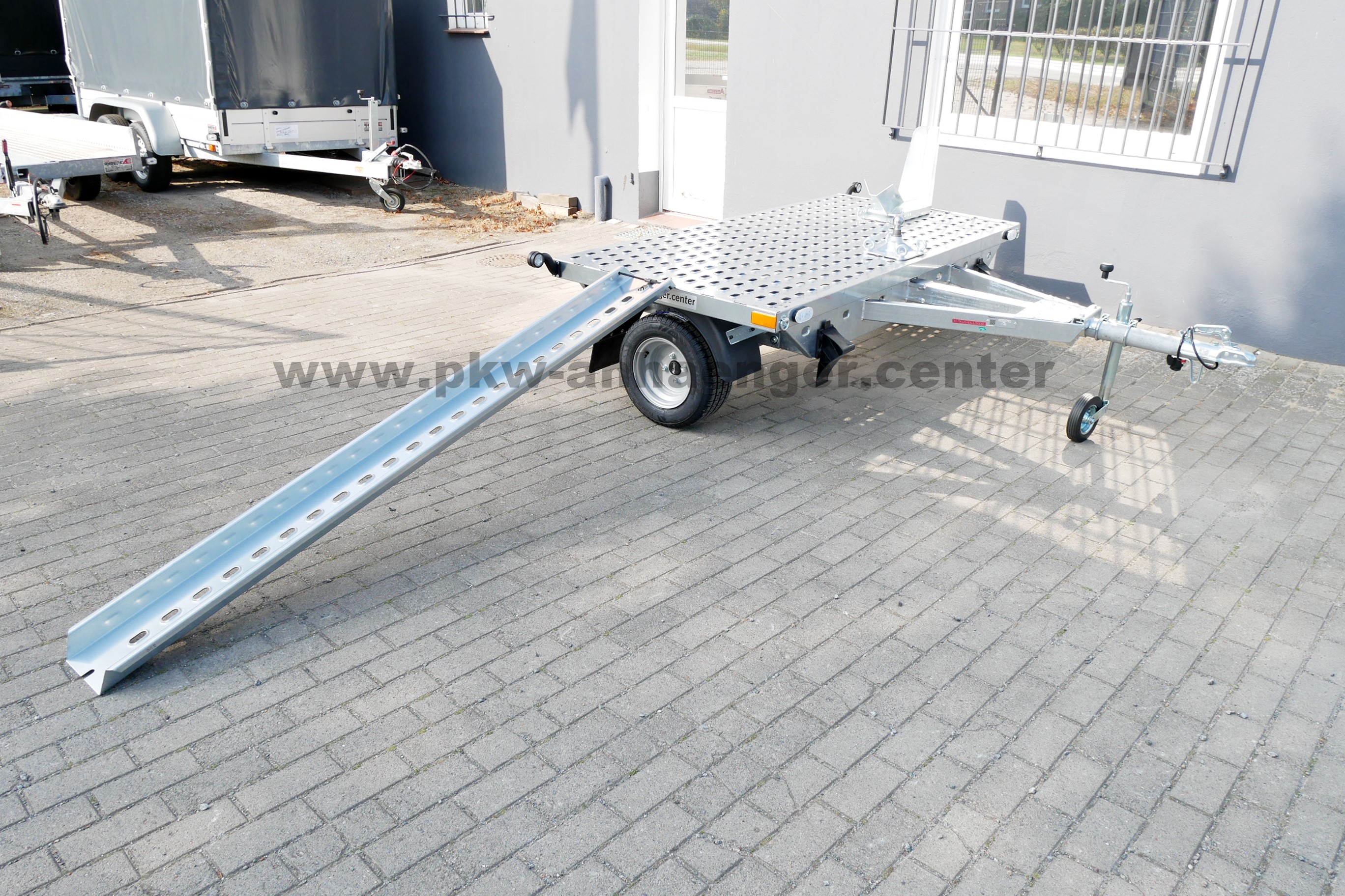 DieSerienausstattung des Motorradtransporter sind eine Motorradwippe verstellbar, Lochprofilboden dadurch Antirutsch und Zurrmöglichkeit, Auffahrschiene, Kupplung für einen Fahrradträger, Stützrad, stabiler geschweißter Rahmen Tauchbad feuerverzinkt und eine sehr stabile V-Deichsel.