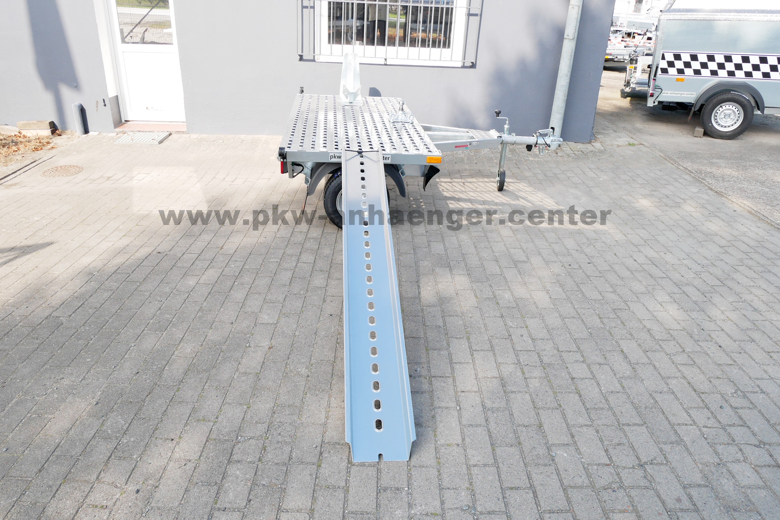 welches man mit einer Auffahrschiene auf die Plattform des Rolleranhänger schiebt. Der Leuchtenträger vom